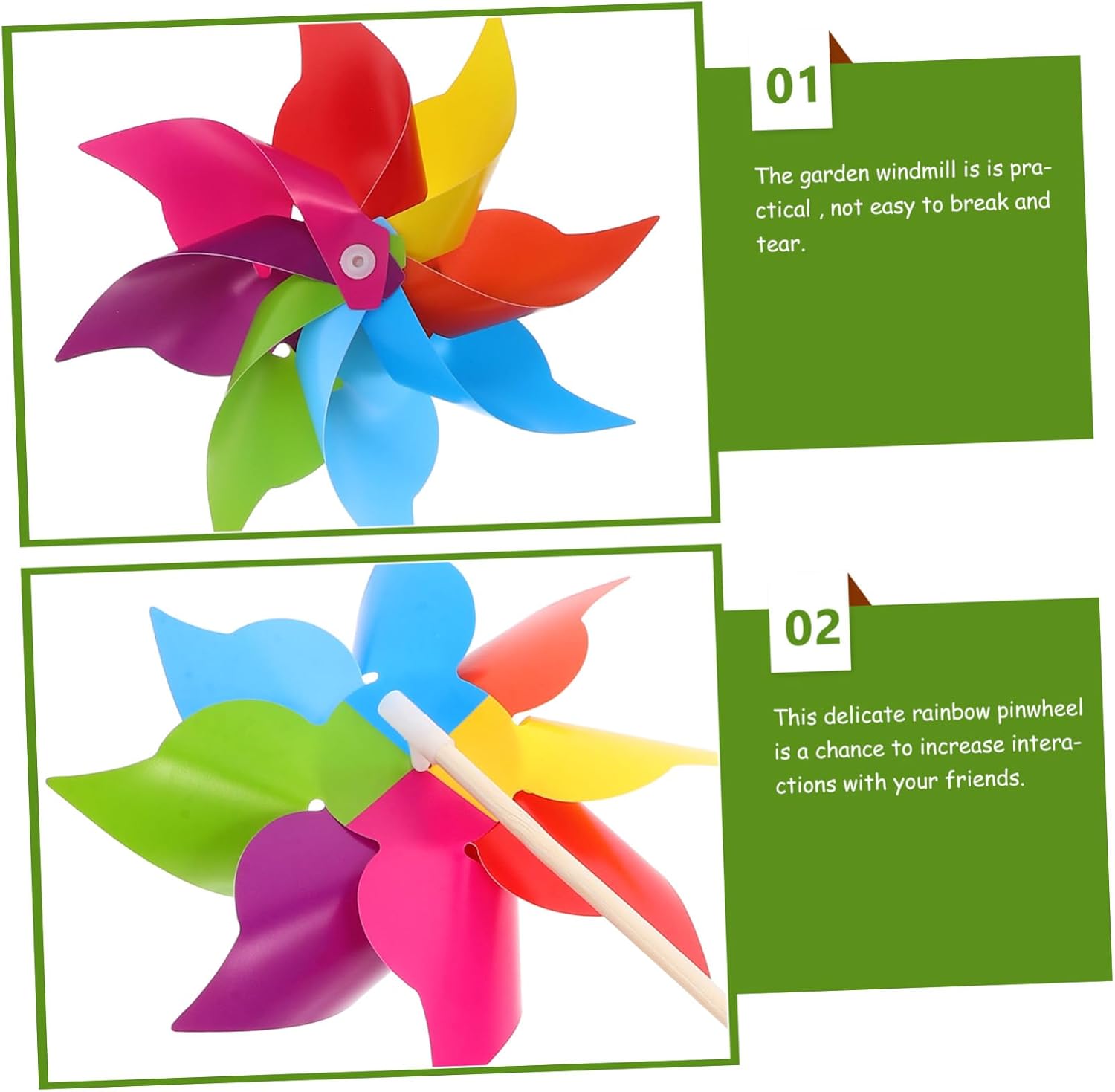 Girandole colorate: il design piccolo e portatile di questa girandola la rende facile da trasportare e installare, girandole girandole Mulino a vento ornamentale: il materiale in pvc e legno come palo del mulino a vento da giardino è più resistente e non facile da rompere, mulino a vento artigianale Rotazione del mulino a vento per esterni: aspetto bellissimo e colori vivaci, adatti per l'atmosfera festiva o per l'arredamento quotidiano del giardino, girandole per il giardino Mulini a vento multicolori: possono essere fissati sull'erba o nel cortile per portare un tocco di bel colore all'ambiente, mulini a vento colorati Decorazione da giardino: realizzata in pvc e materiali in legno, questa piccola girandola è durevole e può essere riutilizzata per più eventi, girandole decorative