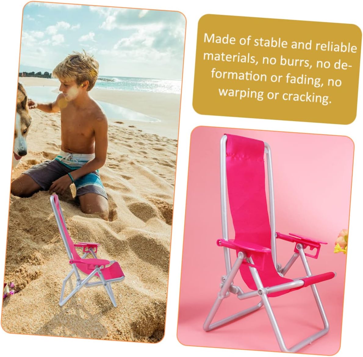 Decorazioni da spiaggia in miniatura: le decorazioni da sedia da spiaggia in miniatura possono aumentare l'immaginazione e l'abilità pratica dei bambini, come se fossero decorazioni per la casa delle bambole. Ornamento da spiaggia in miniatura: piccolo e compatto, di dimensioni adatte, leggero, pieghevole, non occupa quasi spazio e rende più divertenti i bambini, decorazioni da spiaggia in miniatura Accessori da spiaggia in miniatura: multifunzionali, possono essere utilizzati anche come porta cellulare o come ornamenti da scrivania e si adattano bene agli altri mobili in miniatura, creando una scena di svago, sedie per case delle bambole Accessori in miniatura per case delle bambole: l'ornamento della mini sedia da spiaggia è adatto per giardini in miniatura, vetrine, paesaggi in vaso, decorazioni per piante, decorazioni per feste, ristoranti, decorazioni per bar, mini sedie da spiaggia Sedia da spiaggia in miniatura: semplice, mini decorazione per sedia da spiaggia, facile da usare, posizionare e riporre, coltiva l'abilità pratica dei bambini, mini figura marina