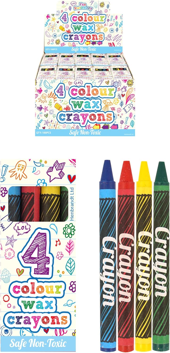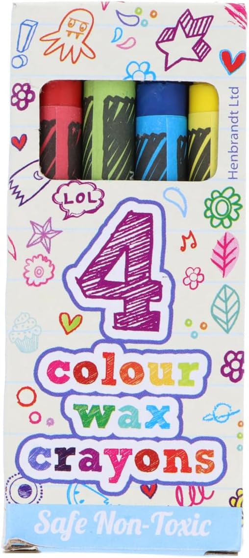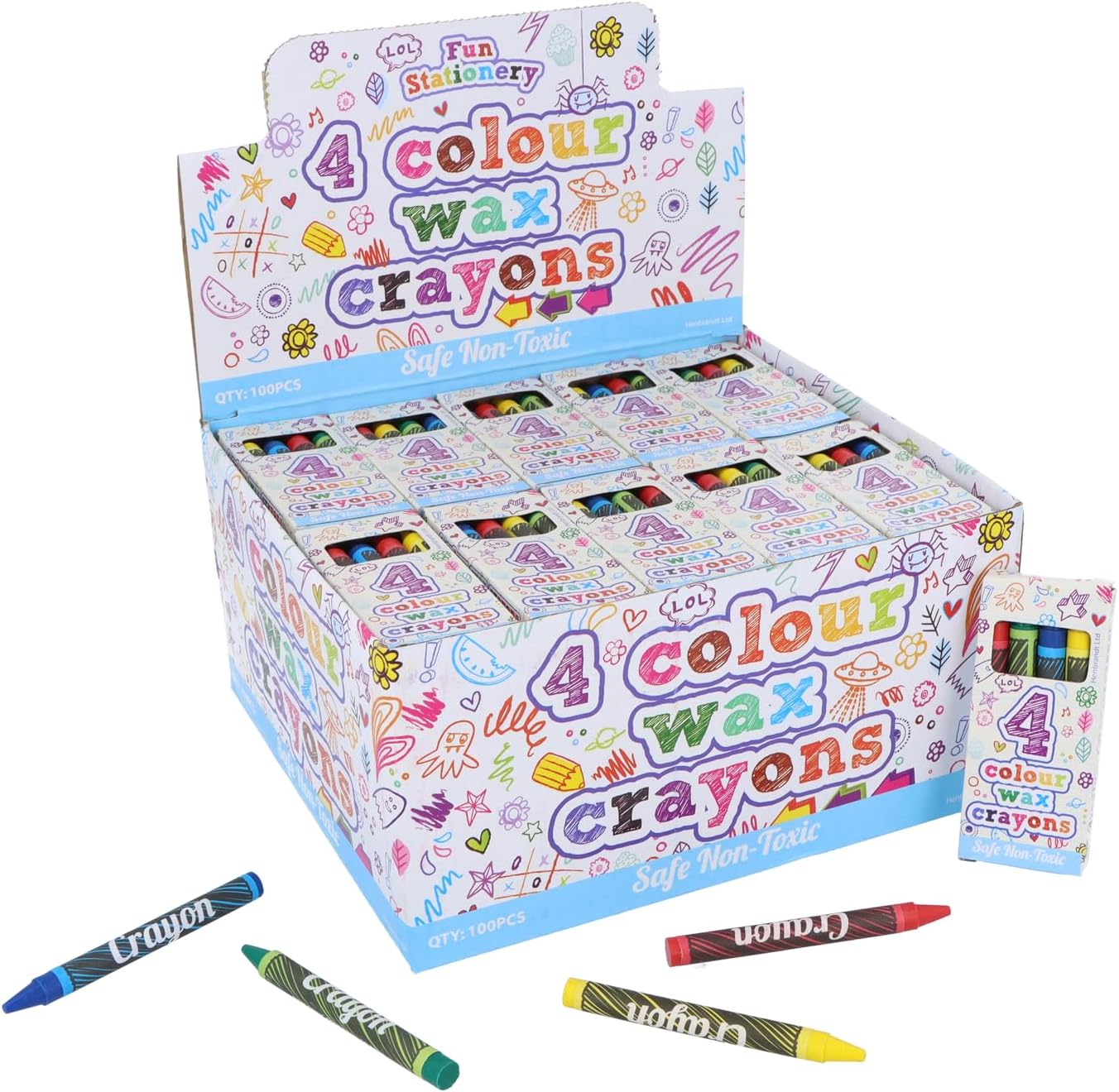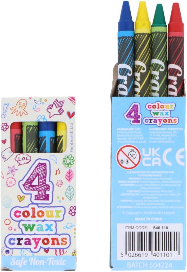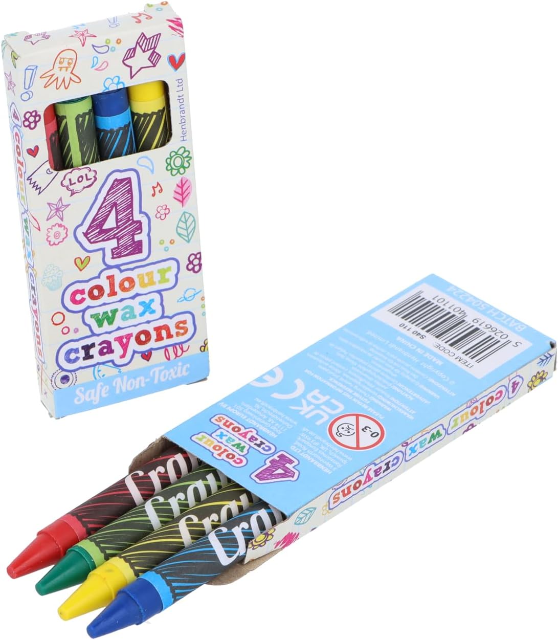 Set di 24 scatole di mini pastelli per bambini. Queste scatole di pastelli colorati sono ideali per sacchetti per feste, riempitivi per calze, scatole della vigilia di Natale e attività artistiche e artigianali in classe o durante l'istruzione domestica. Ogni scatola contiene 4 pastelli atossici per bambini in blu, verde, rosso e giallo. Dimensioni: i pastelli misurano 8 cm. Età 3+.