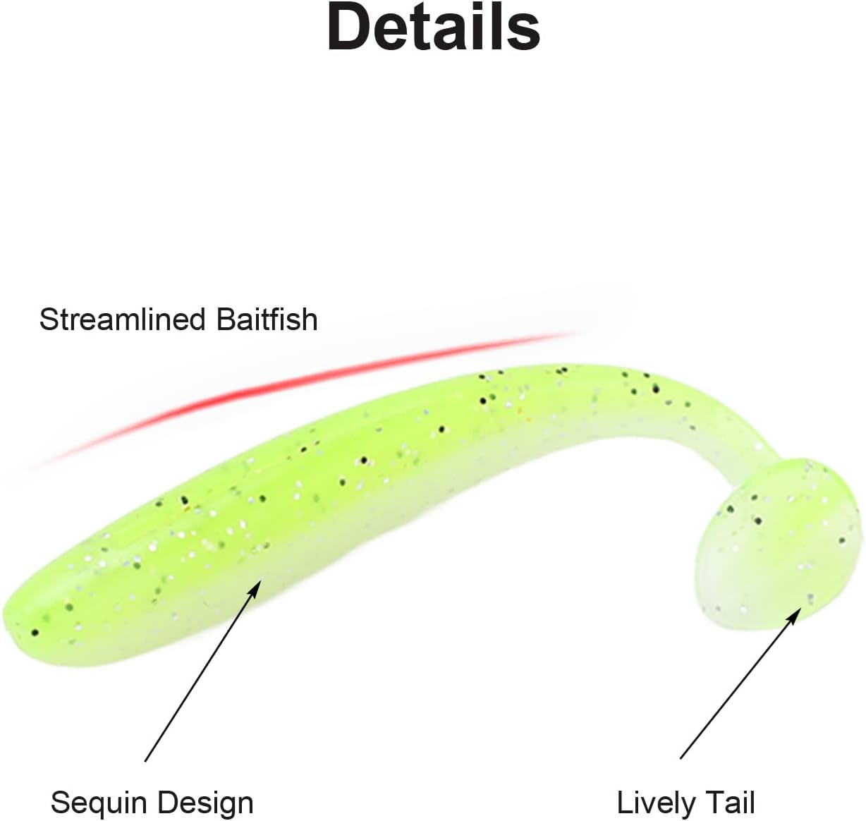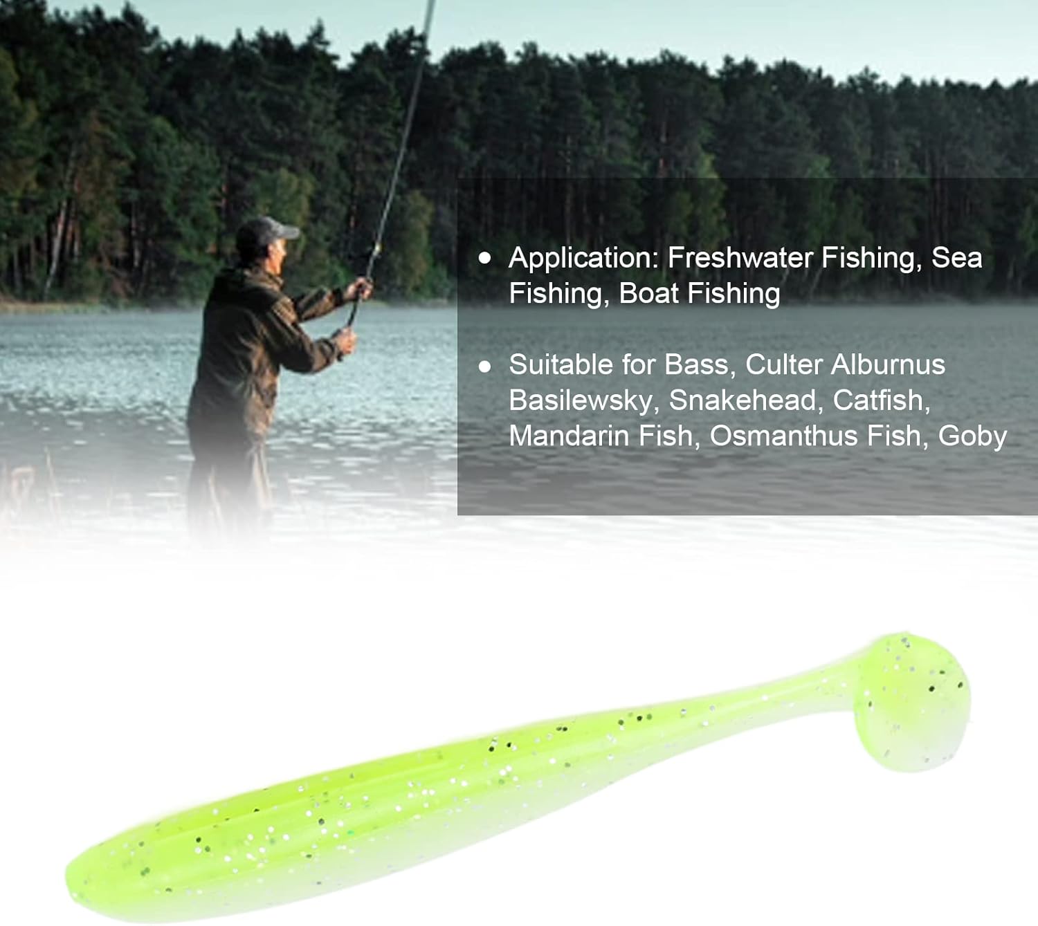 [Aumenta il tasso di esca]: con pellicola flash nel corpo dell'esca da pesca per fornire riflessione sott'acqua, il che è utile nei giorni in cui è necessario quel flash, attirando così più morsi. Se il pesce non attacca, non vengono rilevate anomalie e l'attacco può continuare, aumentando notevolmente il tasso di pasturazione. [Materiale siliconico]: le esche da pesca morbide sono realizzate in materiale siliconico di alta qualità, morbido al tatto, consistenza chiara e alta resistenza. Il design della coda a paletta con materiale super morbido crea movimenti di nuoto estremamente allettanti per attirare i pesci affamati. [Alta simulazione]: l'esca morbida con coda a T bicolore simula altamente il nuoto nell'acqua e ha una forma tridimensionale. La coda ha un'ampia area di contatto con l'acqua e oscilla fortemente nell'acqua. [Ampiamente usato]: leggero e portatile. Le esche da pesca sono adatte per spigole, Culter Alburnus Basilewsky, pesci testa di serpente, pesci gatto, pesci mandarino, pesci osmanto e ghiozzi e possono soddisfare le esigenze delle diverse specie di pesci catturati. [Scene applicabili]: le esche da pesca d'acqua dolce e salata possono imitare molti movimenti e vengono attaccate da pesci di tutte le dimensioni. Adatto per la pesca in acqua dolce, pesca in mare, pesca dalla barca, disponibile in primavera, estate, autunno e inverno.