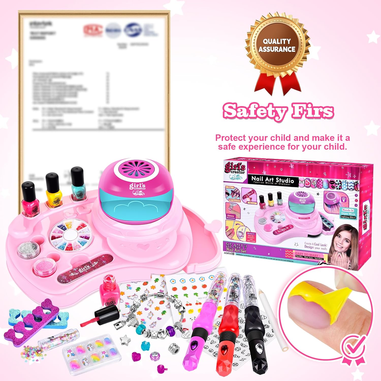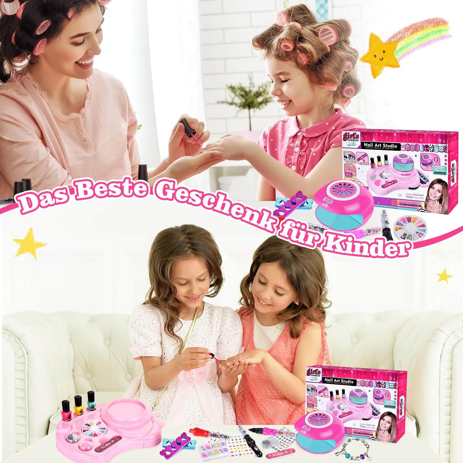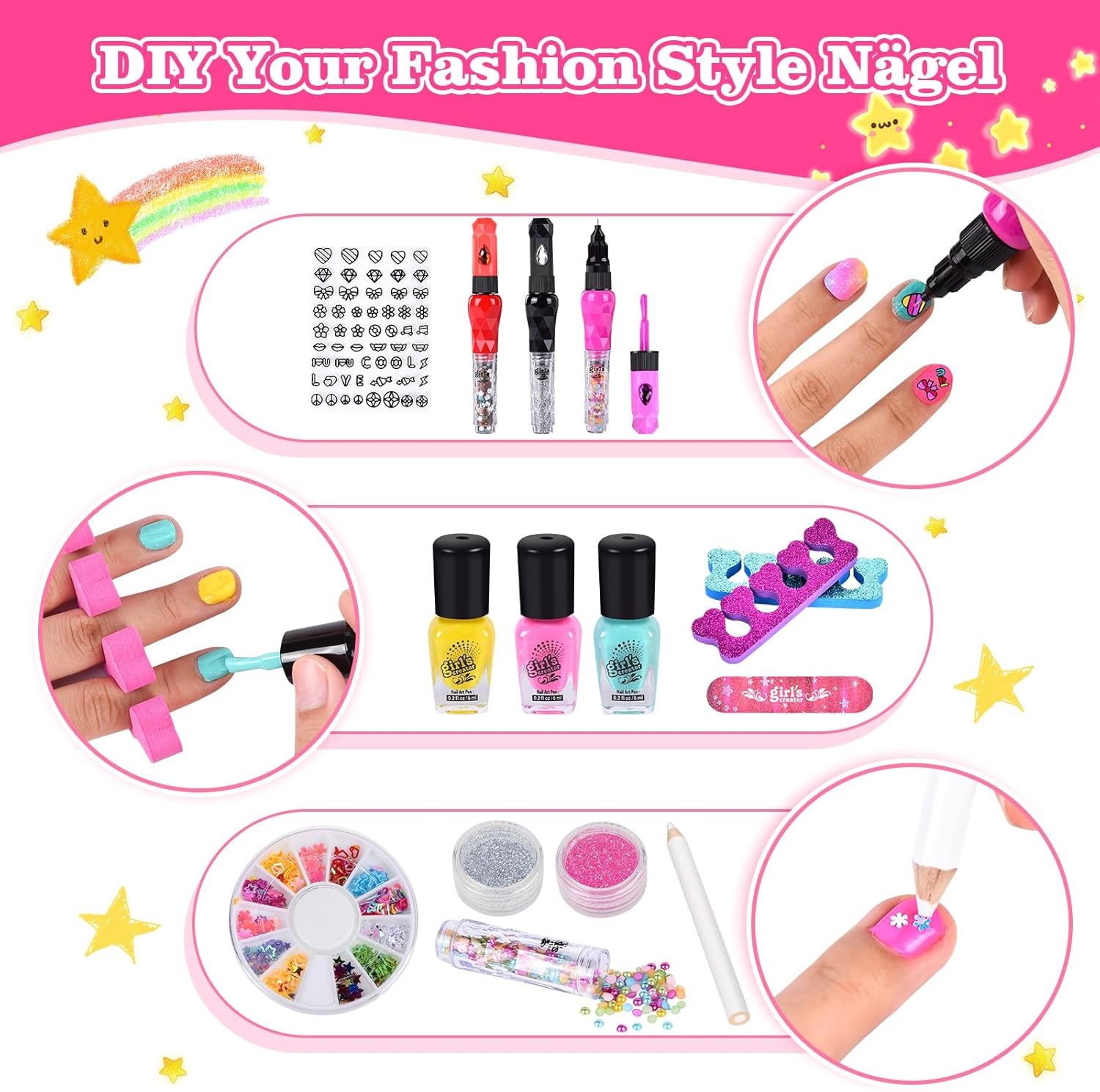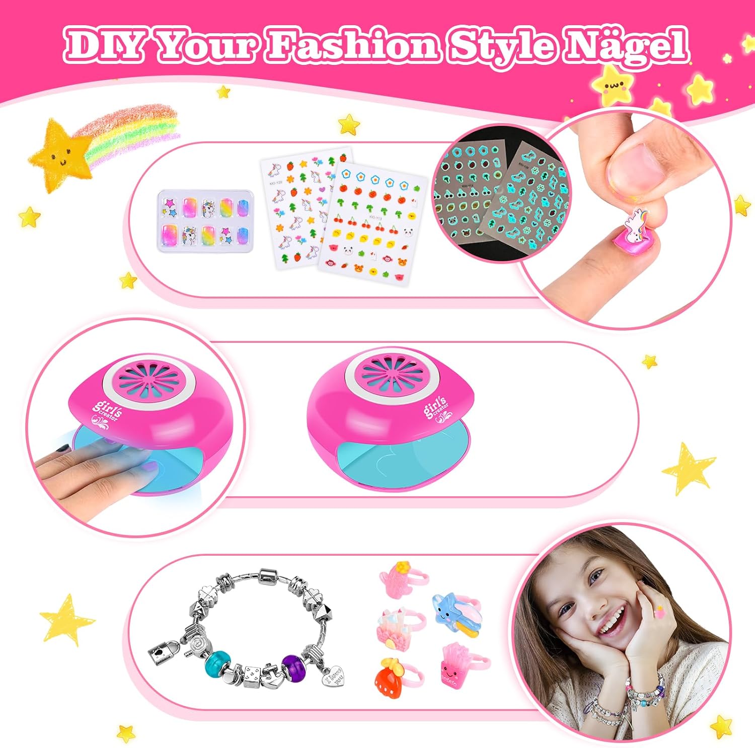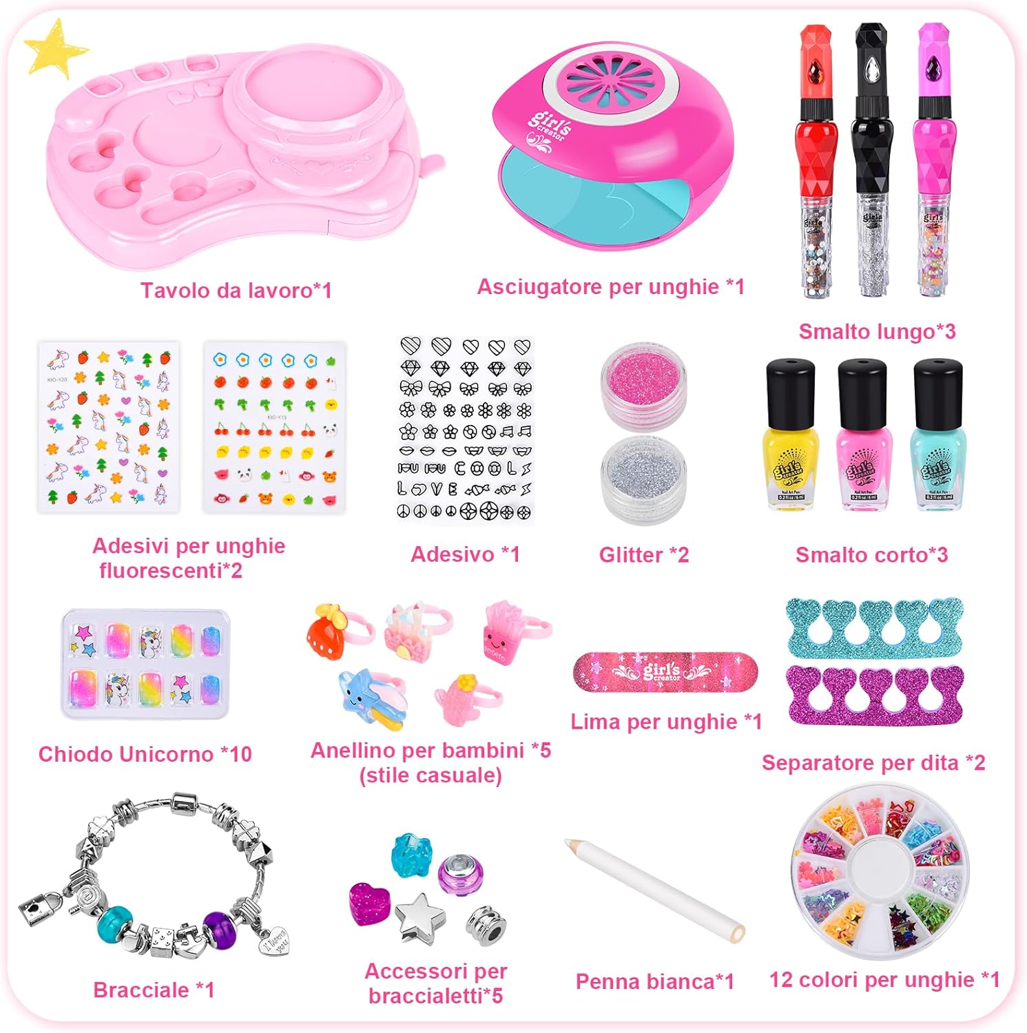 Set di smalti per bambini e bambine: Organizzatore per unghie*1, Smalto corto*3 (Verde, Giallo, Rosa), Smalto lungo*3 (Viola, Nero, Rosso), Separatore per dita*2, Stick bianco*1, Lima per unghie*1, Chip per unghie a 12 colori *1, Asciuga unghie *1, Chiodo Unicorno*10, Glitter *2 (Rosa+Grigio), Adesivo per unghie luminoso*2 (Mela piccola + Unicorno), Anellino per bambini *5 (stile casuale), Braccialetto Unicorno*1 Penna per unghie 3 in 1 per ragazze: La nostra penna per unghie è composta da gioielli per unghie, smalto per unghie e penna per nail art. La penna per unghie può disegnare diamanti, pennellare e abbellire le unghie e dare alle unghie il modello che avete immaginato. I bambini hanno bisogno solo di una penna per unghie per completare i loro disegni sulle unghie, rendendo la ricostruzione delle unghie facile! Ragazze 6 7 8 9 10 11 12 anni Manicure creativa: Tutte le ragazze amano dipingere e disegnare le loro unghie, i bambini truccano le ragazze, i kit per unghie a tema sono tra i più popolari. Le ragazze possono usare la loro immaginazione illimitata per creare unghie colorate. Con una penna per unghie, è possibile dipingere disegni sulle unghie o aggiungere adesivi e paillettes. Le vostre unghie brilleranno e risplenderanno con disegni graziosi e colori vivaci! Smalto sicuro e design da conservare: Materiale di alta qualità, sviluppato appositamente per i bambini. A differenza degli smalti tradizionali, è più delicato per i bambini. Così i bambini possono creare bellissime unghie con lo smalto senza preoccuparsi. L'essiccatore per unghie è facile da usare. Basta inserire due batterie AA (non incluse) e mettersi al lavoro. La base di appoggio consente ai bambini di riporre rapidamente il set per unghie e di sviluppare buone abitudini di conservazione. Regalo per bambine di 6 7 8 9 10 11 12 anni: II set per unghie per bambine è perfetto per feste di compleanno, feste in spa, makeover e momenti di relax da sole. Le ragazze possono progettare una varietà di nail art alla moda. Mentre si godono la bellezza, diventeranno più concentrate e pazienti. Una grande scelta come una varietà di regali di Natale, regali di compleanno e giocattoli per ragazze.