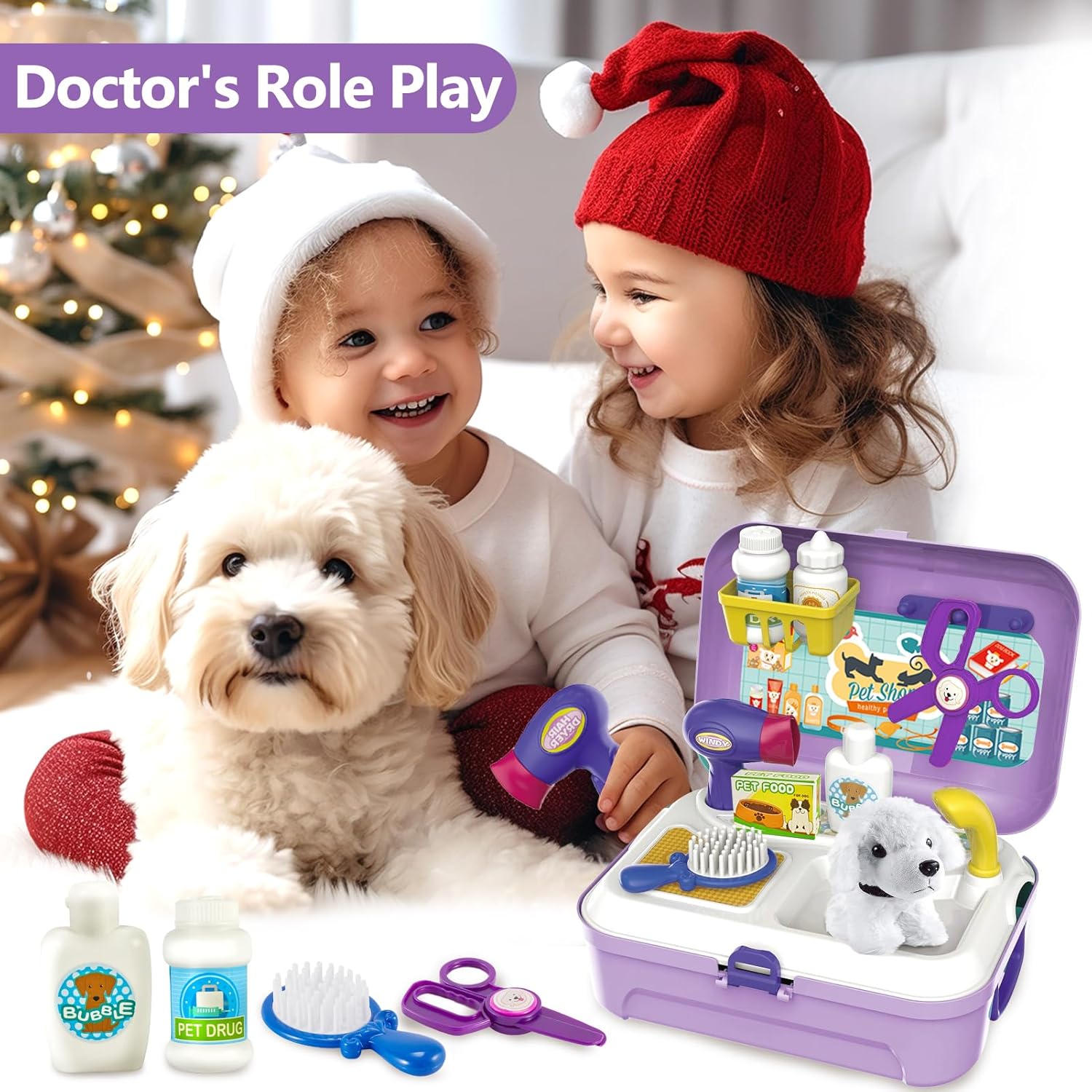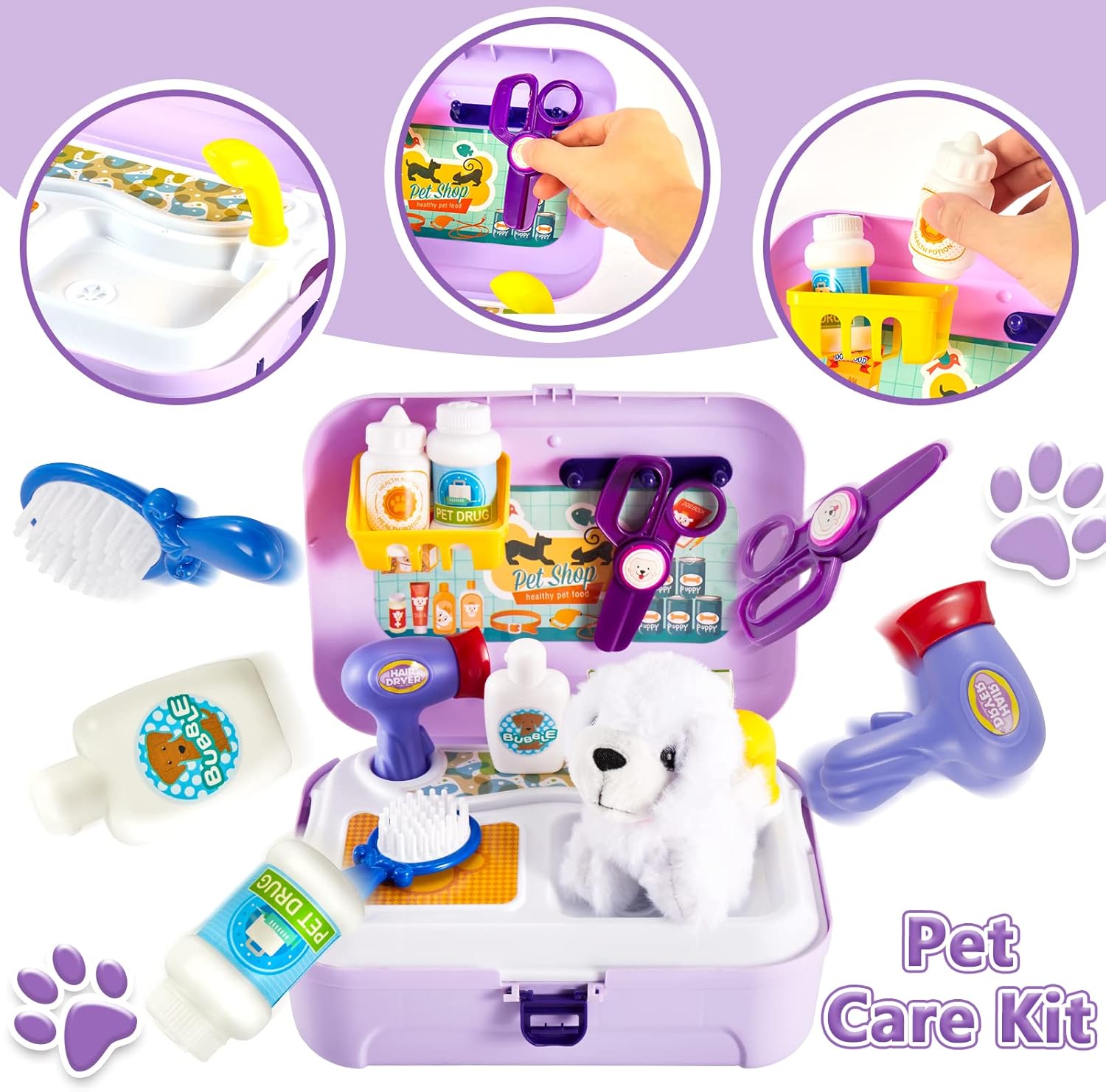 【16 Pezzi di Giocattoli Veterinario】Con cuccioli di peluche, forbici, asciugacapelli, rubinetto, scatola per alimenti, gel doccia, pettine e così via. Dimensioni della confezione: 20 x 9 x 24 cm. 【Cura Degli Animali Domestici】I giochi di ruolo sono incoraggiati e i bambini possono aiutare il cucciolo a tagliarsi i capelli, fare il bagno e imparare a prendersene cura. Aiuta a sviluppare la pazienza dei bambini e a farli imparare ad amare e proteggere gli animali. 【Kit Veterinario 2 in 1】Tutti gli articoli possono essere riposti nello zaino e non andranno persi facilmente. Può essere utilizzato come zaino o valigia, 2 modalità per passare in qualsiasi momento. 【Giocattolo Educativo】Un set di gioco bello ed elegante che porterà divertimento al tuo bambino e svilupperà le sue abilità pratiche, immaginazione e creatività. 【3 4 5 anni Regali per Bambini】Il set da gioco veterinario è un'ottima scelta per i più piccoli che amano gli animali. Ottimo regalo per ragazze e ragazzi per giochi di ruolo, giochi educativi, feste di compleanno.
