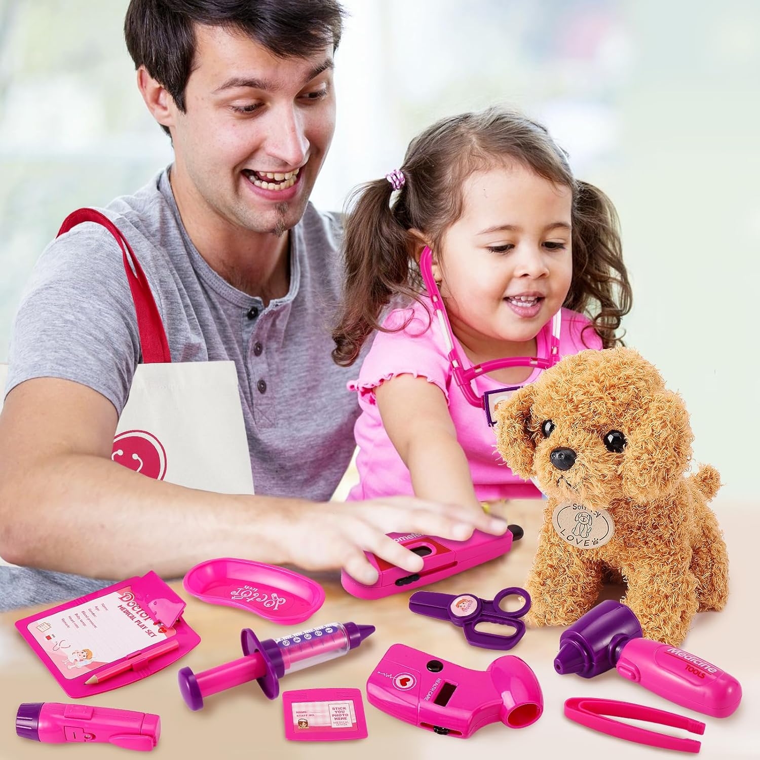 【Kit Veterinario Gioco】Include un cucciolo di peluche, uno stetoscopio, una siringa, un termometro, una torcia, una forbice, una pinzetta, una borsa per riporre gli oggetti e un totale di 14 accessori veterinari. 【Luci e Suoni】Alcuni giocattoli da dottore come l'otoscopio, la torcia e il termometro sono dotati di luci e lo stetoscopio emette un suono di battito cardiaco simulato per offrire ai bambini un'esperienza di gioco realistica. 【Borsetta】Facile da riporre, consente di trasportare tutti i giocattoli accessori del medico nella borsetta in caso di smarrimento. Può anche essere portato fuori e giocare in qualsiasi momento. 【Gioco di Ruolo】Assumete il ruolo di un veterinario e imparate a prendervi cura di un animale domestico, sviluppando nel bambino un senso di amore e di responsabilità e imparando le conoscenze mediche di base. 【Regali per Bambini】Perfetto per il gioco di finzione, l'interazione in famiglia, i regali di compleanno, di Natale e di Capodanno. Un regalo a sorpresa per una bambina di 3 4 5 anni.
