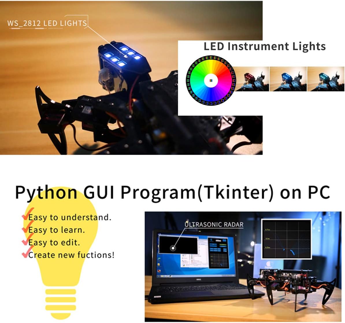 Mettere insieme questo "ragnetto" è stato molto divertente, sicuramente non adatto a bambini con eta inferire ai 14 se non con sostegno di qualche adulto, ma passiamo alla descrizione di questo "robot", per quanto riguarda il montaggio direi neanche troppo complicato, ovvero, dipende se seguita la guida in PDF, troverete qualche difficoltà nell'interpretare le immagini dei vari montaggi e la lingua inglese(per chi non la mastica) di certo non è di aiuto, se invece seguite il video vi renderà il montaggio molto più facile(non fate come me, che ho seguito solo il PDF!!!????),le varie istruzioni e video sono reperibili tramite i link nella descrizione o andando direttamente sul sito ufficiale Adeept. Passiamo ora al punto cruciale,la programmazione...anche qui troverete una buona guida dettagliata(purtroppo sempre in inglese) che vi spiegherà passo a passo come programmare e utilizzare i vari componenti ed in fine il robot,per questo consiglio prima di montare il tutto di seguire gli step della guida e molto importante!!! I vari sketch e programmi sono sempre compresi nell'archivio scaricabile dal link in descrizione...anche in questo caso la difficoltà è abbastanza ridotta se si segue bene la guida. Vediamo il risultato finale, che dire il ragno si presenta bene e ben assestato, anche nei movimenti è sempre ben coordinato e il wifi con il pc risponde bene,per quanto riguarda la durata delle batterie non sono ancora riuscito a testare, ma presumo più di 30 minuti...nel complesso è un buon prodotto,progettato bene e con buone finiture. Passo ora ad elencare le varie mod e requisiti extra che ho dovuto affrontare per questo progetto,inizio con dire che nonostante le batterie siano incluse,mentre nella descrizione no, avrete bisogno di un caricabatterie apposito, io l'ho comprato su amazon perchè c'è molta scelta e prezzi diversi,se volete un consiglio state su qualcosa di affidabile, queste batterie sono pericolose, se caricate in modo inopportuno e possono esplodere causando anche danni, continuando, ovviamente vi servirà un pc e dovrete scaricarvi un software gratuito(Arduino IDE)...con questi siete pronti ad utilizzare il robot. Per quanto riguarda le mod, faccio presente come in foto che ho messo dei gancetti adesivi sotto la "pancia" del ragno per bloccare i vari collegamenti dei servi, giusto per renderlo più ordinato e in fase di montaggio ho dovuto creare un piccolo “canalino”(con il saldatore, una cosa grezza????) nel pezzo dove va montato il sensore ultrasuoni perchè gli header(pin) impedivano l'aderenza e dunque rimaneva a sbalzo, il resto andava bene. E come ultimo i difetti, in primis, il fatto che l'app per il telefono non funziona, almeno, no con andriod 10 o 11, ma “funzionicchia” con un tablet android 9 Pie e dei 14 servi 2 erano ko, fortunatamente ne servono 13 e uno dei due sono riuscito a ripristinarlo (in commercio li trovate, MG90S) altre "pecche" per ora non ne ho trovate, ma vi terrò aggiornati!...Conclusione: direi che a 70 euro(comprato in offerta tempo) è un bel giocattolino, istruttivo e impegnativo quel tanto che serve per passare qualche oretta, se vi piace la robotica o volete avvicinarvi ad essa è un ottimo acquisto...mi sento di consigliarlo!???? P.s: consiglio di tarare tutti i servi,come descritto nella guida prima di montare il ragno o avrete un bel problema con la linearità delle gambe!!!