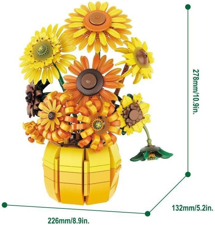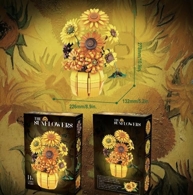 【Set di mattoncini di girasole】 Ispirato al dipinto di Van Gogh "Girasoli", l'arte si combina con i mattoncini. Assemblato con mattoncini, presenta diverse caratteristiche 3D di girasoli, con ogni fiore unico. Con il giallo come tono principale, rivela gli intricati dettagli dei girasoli e un'atmosfera artistica piena di vitalità ed entusiasmo. 【Graziosa decorazione】 Aggiungi un tocco di colore brillante alla tua casa o al tuo ufficio! Posizionalo su uno scaffale, un tavolo o una vetrina e aggiungerà immediatamente un tocco di arte e fascino a qualsiasi spazio. È un inizio di conversazione e un'aggiunta unica all'arredamento della tua casa o dell'ufficio. 【Esperienza di assemblaggio rilassante】 Questo kit di elementi costitutivi di girasole viene fornito con istruzioni dettagliate per creare bellissimi fiori. Che tu sia un bambino che desidera sviluppare capacità motorie e immaginazione, o un adulto alla ricerca di un hobby rilassante e appagante, questo set di mattoncini è perfetto. Regalo ideale: con materiali di alta qualità e attenzione ai dettagli, questo set di elementi costitutivi è costruito per durare. È un regalo meraviglioso per gli amanti dell'arte, gli appassionati di puzzle o chiunque apprezzi la bellezza della natura e la creatività. È un regalo ideale per il tuo partner, madre, fidanzata, moglie, amici e famiglia. 【Sicuro e di alta qualità】 Questi mattoncini di girasole sono realizzati in innocua plastica ABS, con colori vivaci e vivaci forme di girasole. Se hai ricevuto parti danneggiate o mancanti, contattaci tempestivamente per una rapida risoluzione.