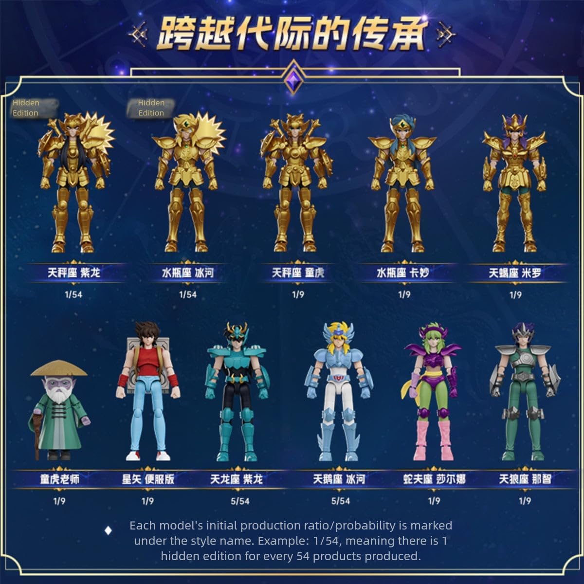 Design Casuale - Ogni scatola a sorpresa è completamente casuale e contiene una sola figura. Acquistando un intero set, non puoi scegliere il tipo e, anche se compri più set completi, potresti ricevere più duplicati. Poiché le edizioni nascoste sono confezionate casualmente in determinate scatole in un rapporto specifico, anche acquistando più scatole a sorpresa o set, potresti non ottenere un'edizione nascosta. Design delle Scatole - Serie completa di 11 design, inclusi 2 nascosti. La SINGOLA SCATOLA contiene 1 design a caso. PDQ Display Box: Figure Regolari *7 (Rapporto 1:9), Figure Premium *2 (Rapporto 4:54), Figure Nascoste *2 (Rapporto 1:54). Contenuto della scatola: accessori esclusivi o oggetti unici. Figure incluse: DOHKO, CAMUS, MIRO, SHEYA (Edizione Abbigliamento Casual), HYOGA, SHIRYU, SHAINA, NACHI. Confezione singola in scatola cieca, dimensioni approssimative 7×7×12 cm (L x P x H), peso 0,1 kg. Realizzata in materiali ABS e PVC di alta qualità. Consigliato per età 15+.