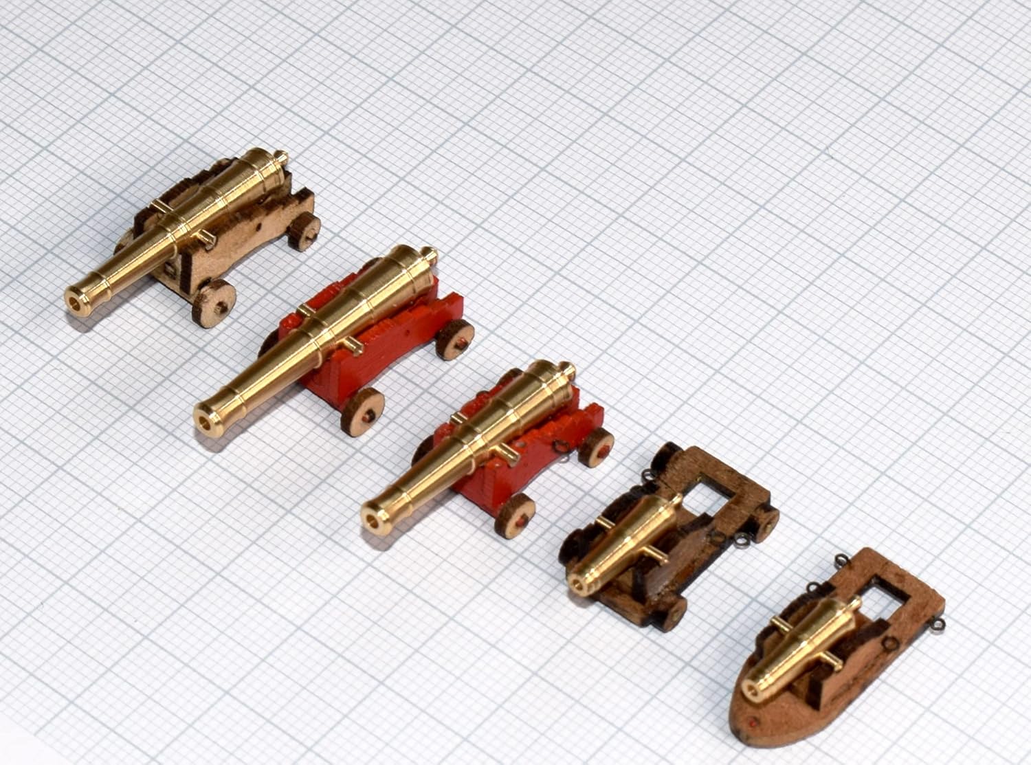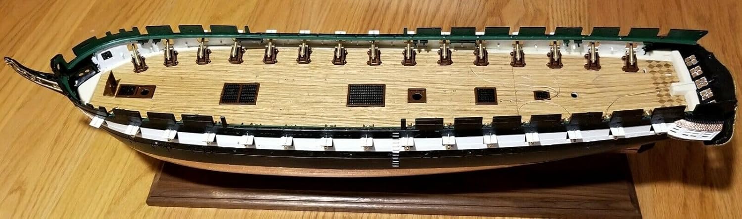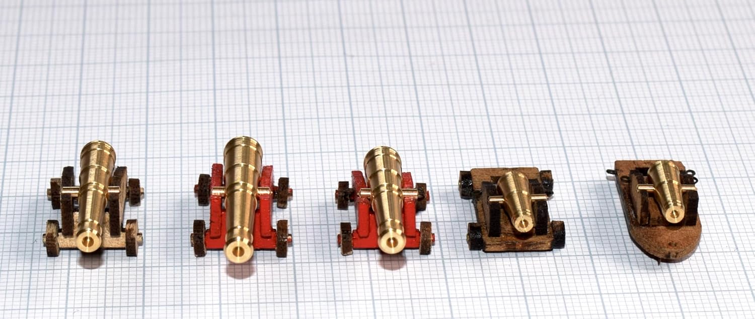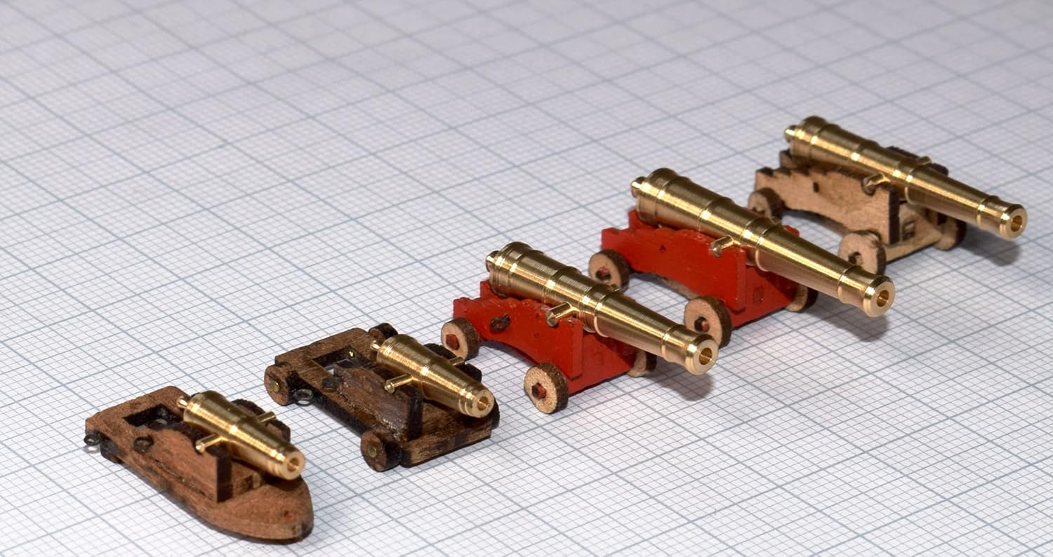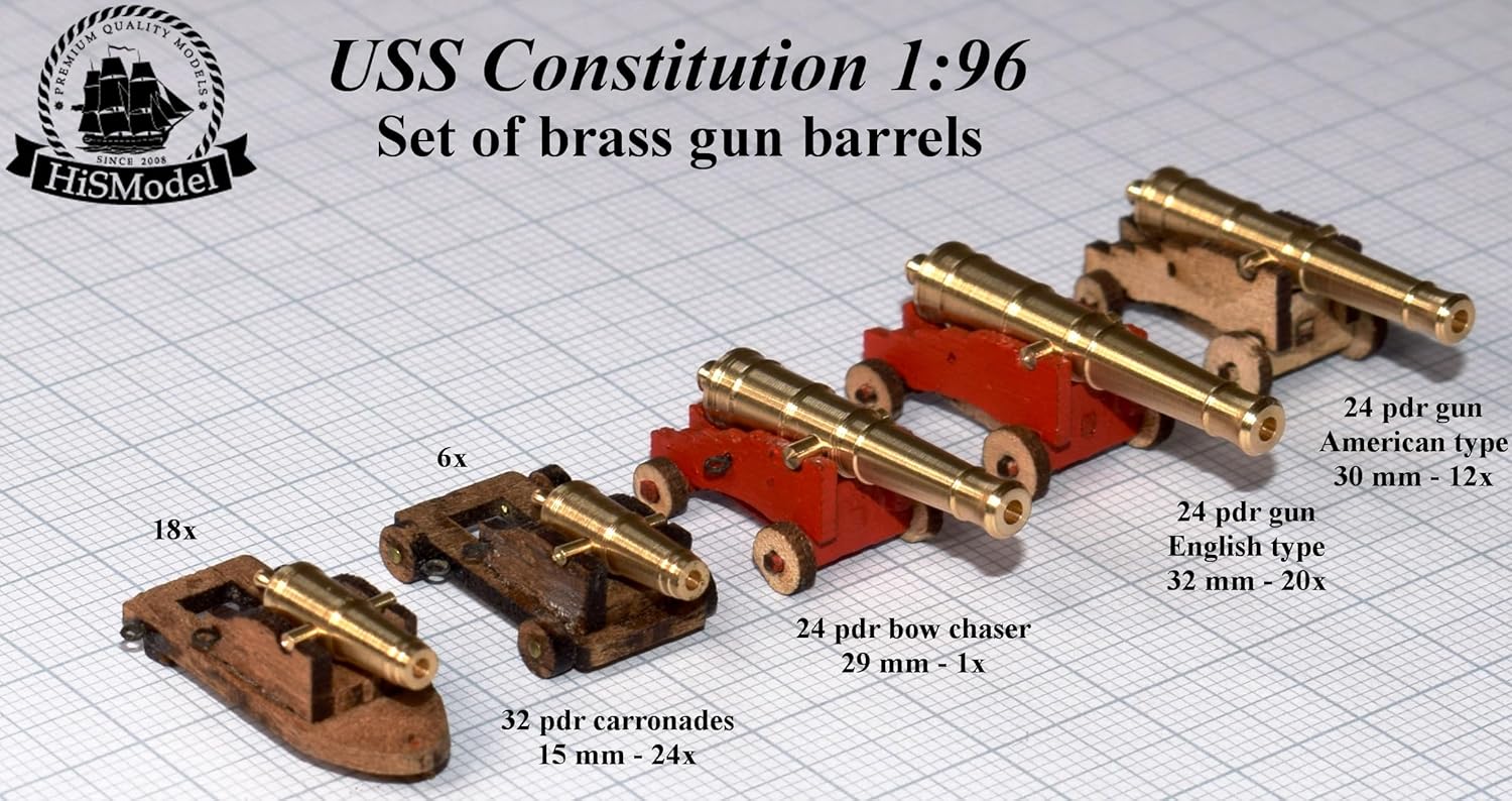 ATTREZZATURA PRINCIPALE: 30 armi lunghe, composto da 18 pistole inglesi da 24 libbre (318 cm) e 12 pistole americane da 24 libbre (288 cm). ARMADIO: un cacciatore di archi da 24 libbre e 22 carronate da 32 libbre per la massima potenza di fuoco. Compatibilità: set coordinati venduti separatamente con i numeri di catalogo SET-CON007 per i cannoni principali e SET-CON008 per i cannoni da tetto superiore. Qualità del materiale: cannoni in ottone di alta qualità per autentici dettagli modellistici e costruzione durevole. Contenuto della confezione: set completo di 53 cannoni in ottone dettagliati con dimensioni precise per modellismo in scala.