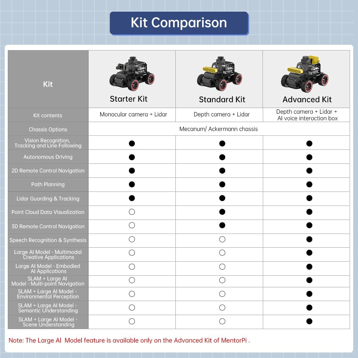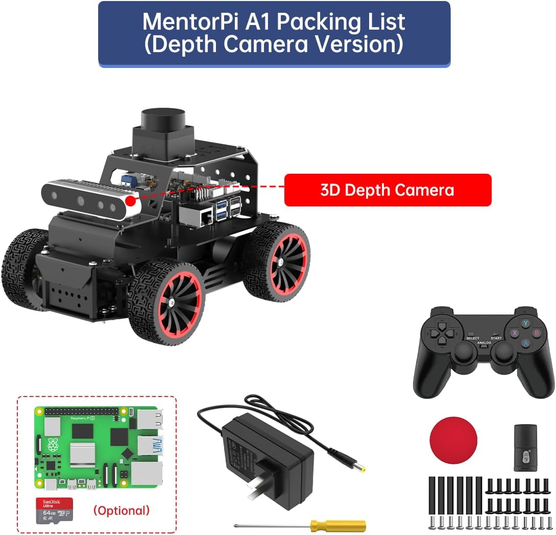 Auto robot Raspberry Pi 5 e ROS2. MentorPi è alimentato da Raspberry Pi 5, compatibile con ROS2 e programmato in Python, rendendolo una piattaforma ideale per lo sviluppo di robot AI. Configurazioni multiple del telaio. Supporta sia il telaio Mecanum-Wheel che Ackermann, consentendo flessibilità per varie applicazioni e soddisfacendo le diverse esigenze degli utenti. Hardware ad alte prestazioni. Dotato di motori encoder a circuito chiuso, lidar TOF, telecamera di profondità 3D, servi a coppia elevata e altri componenti avanzati per garantire prestazioni ed efficienza ottimali. Funzionalità IA avanzate. Supporta la mappatura SLAM, la pianificazione del percorso, il coordinamento di più robot, il riconoscimento della visione, il tracciamento dei bersagli e altro ancora, coprendo un'ampia gamma di applicazioni IA. Guida autonoma con deep learning. Utilizza la formazione YOLOv5 per consentire il riconoscimento dei segnali stradali e dei semafori, nonché di altre funzionalità di guida autonoma, aiutando gli utenti a esplorare e sviluppare tecnologie di guida autonoma.