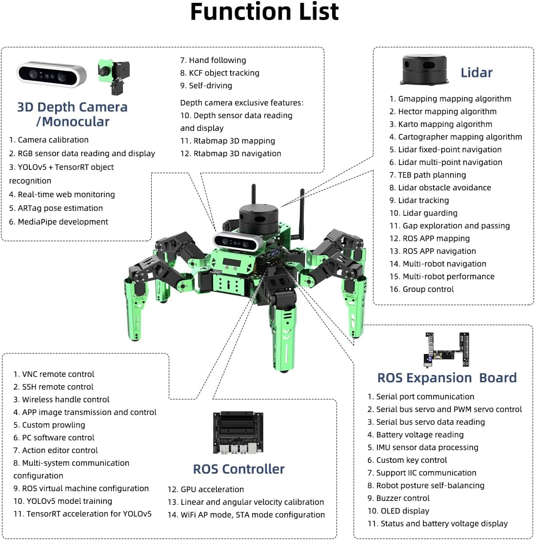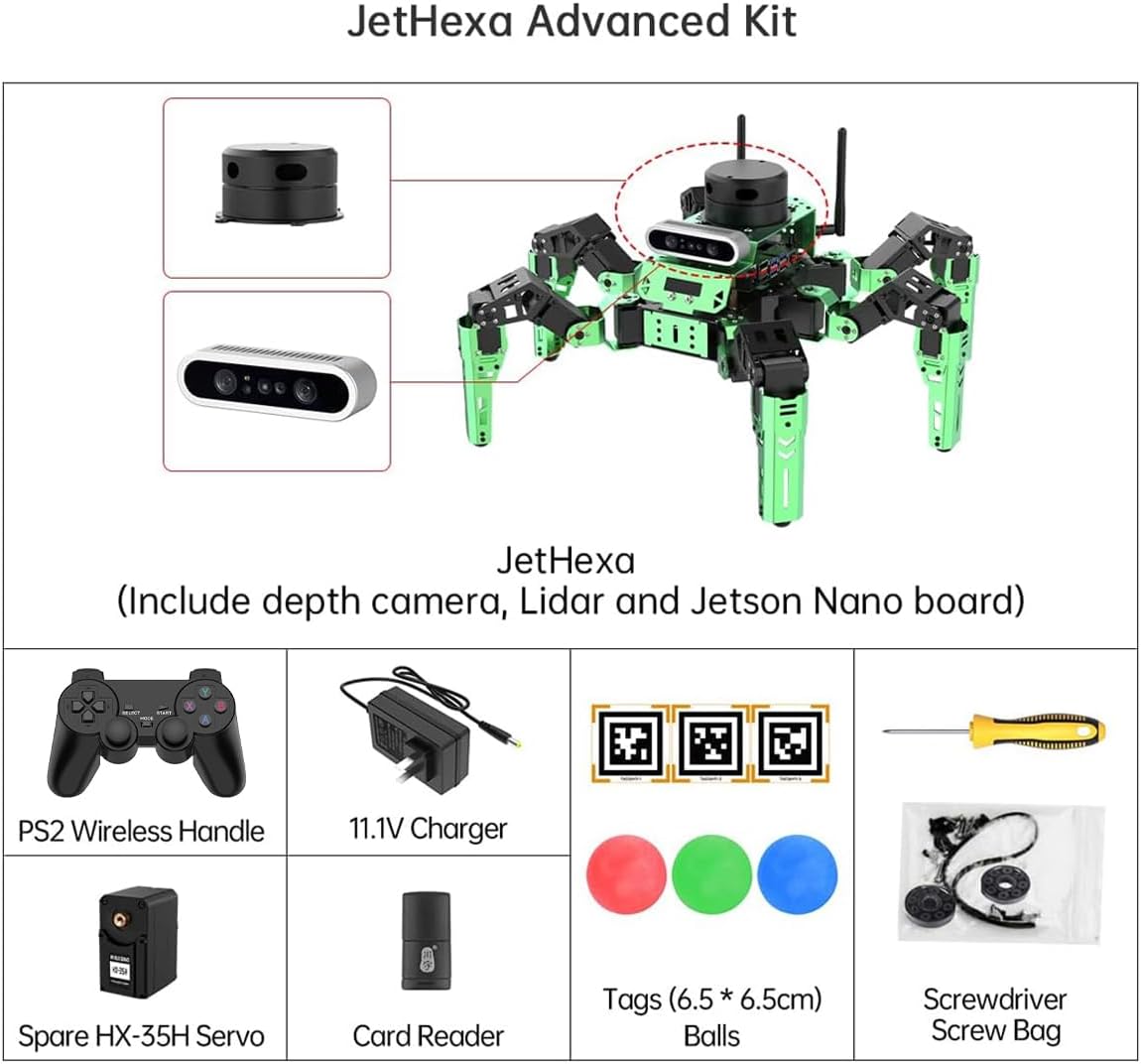 【Sistema di controllo nano NVIDIA Jetson】 Alimentato da Jetson Nano, JetHexa può ottenere riconoscimento di immagini, rilevamento e posizionamento di oggetti, stima della posa, segmentazione semantica, analisi intelligente e altre funzioni onnipotenti.