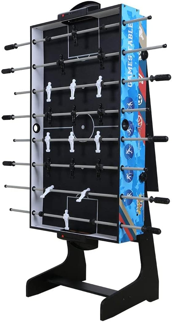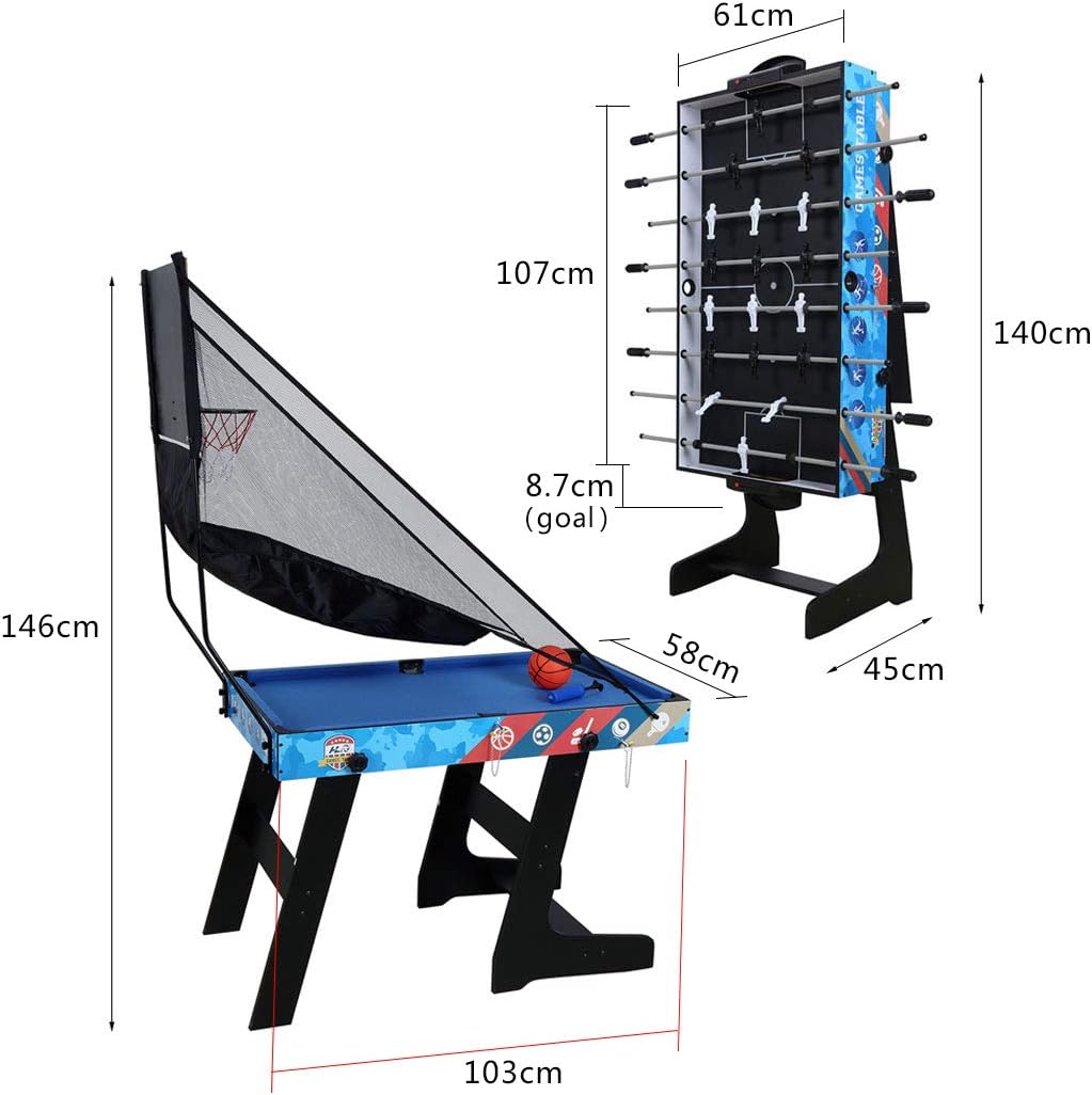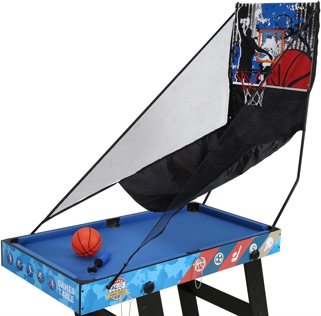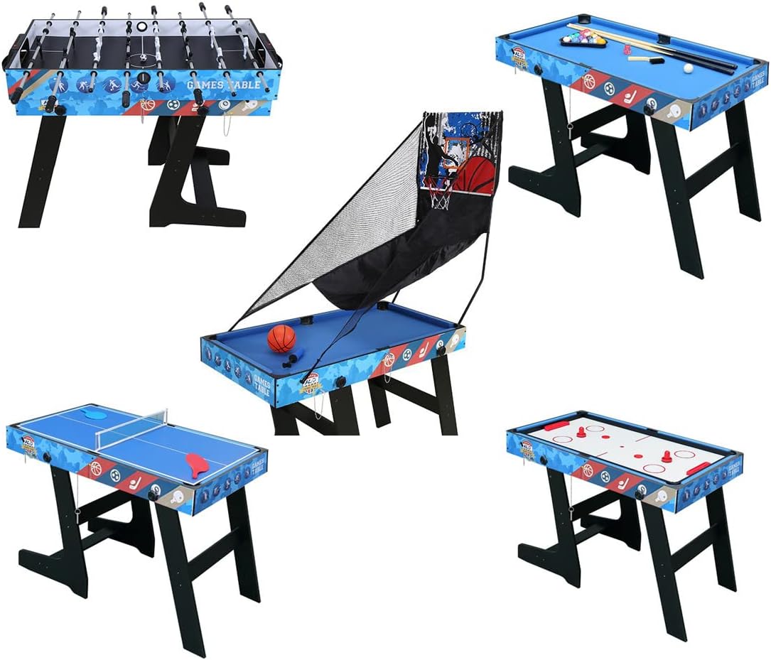 Dimensione: 121x61x81cm 5 giochi in 1. Biliardo, Babyfoot, Hockey, Ping Pong, Basket e accessori. (NO palline da ping-pong) MONTAGGIO FACILE E VELOCE Ottimo per divertirsi con questo tavolo multigioco. Materiali: MDF, piani intercambiabili, gambe pieghevoli.