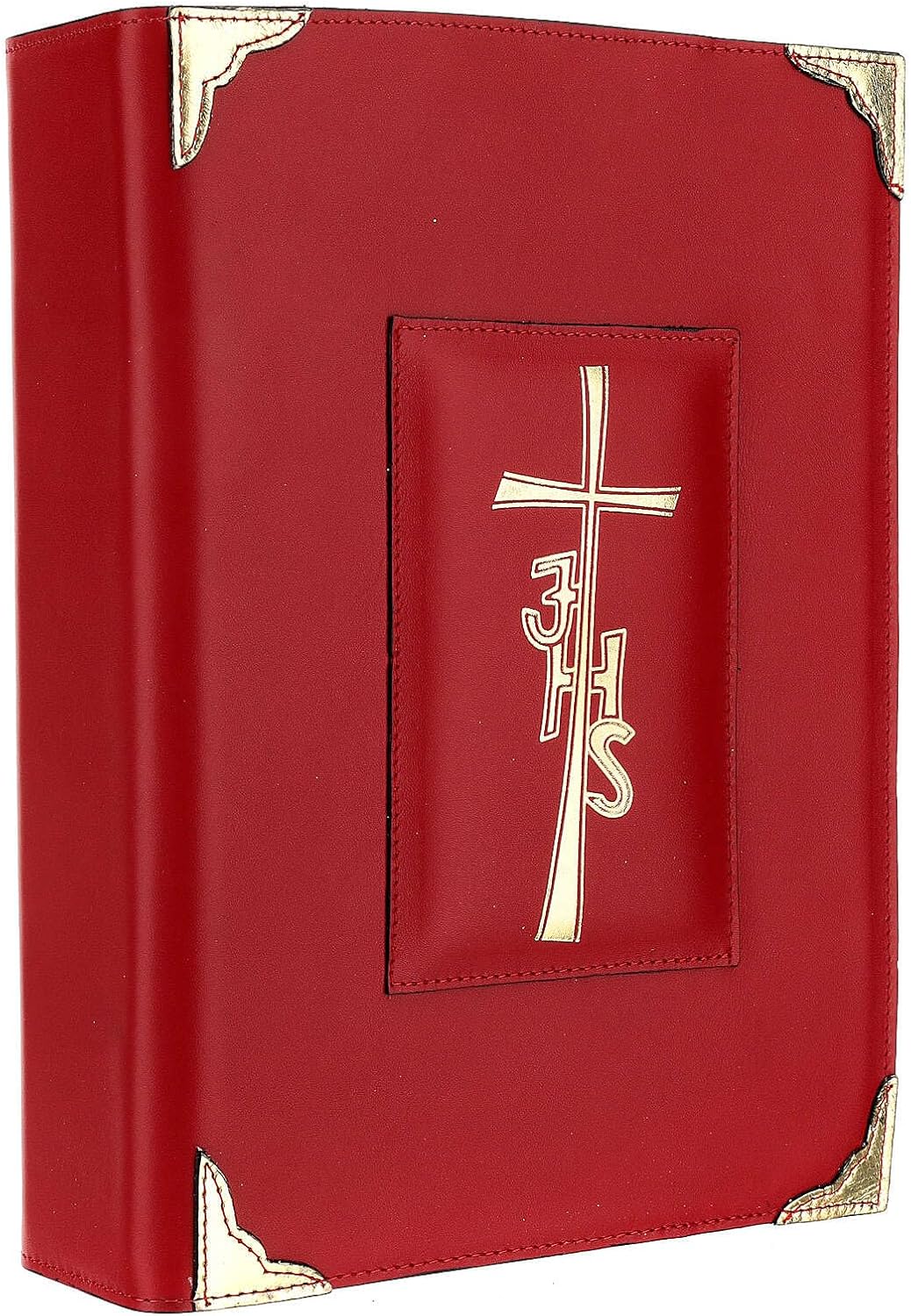 Copertina IHS in vera pelle rossa per Messale Romano III edizione. Copertina per il Messale Romano III edizione, interamente realizzata da artigiani italiani in vera pelle rossa con croce JHS stampata in oro su entrambi i lati, interno in cartoncino rivestito in elegante raso e cuciture laterali che rendono la copertina resistente e adatta a proteggere efficacemente il libro. Prodotto artigianale: ogni pezzo è unico e diverso. Dimensioni: 30x21x7 cm. Peso: 0,50 g - Dimensioni prodotto: Altezza libro: 28 cm