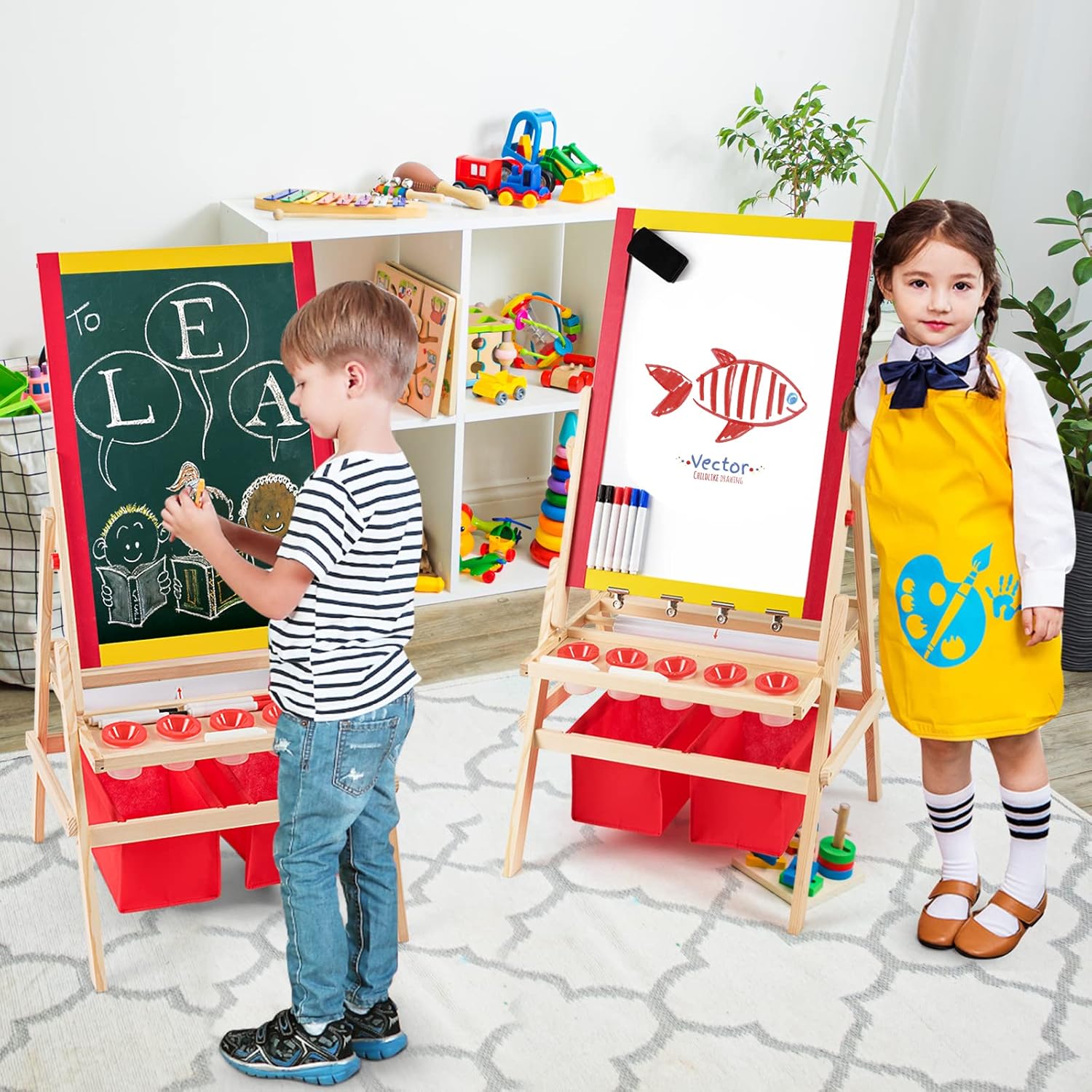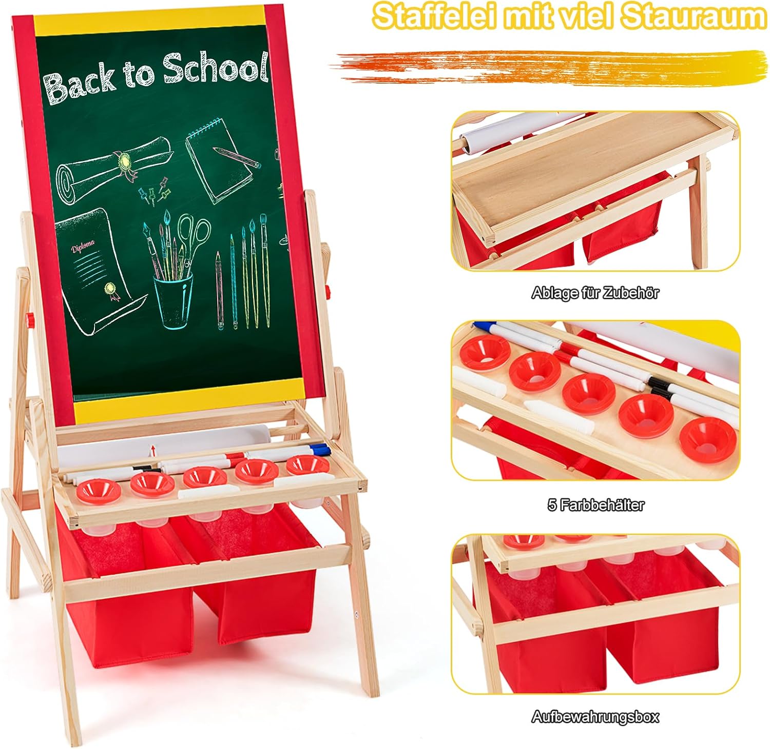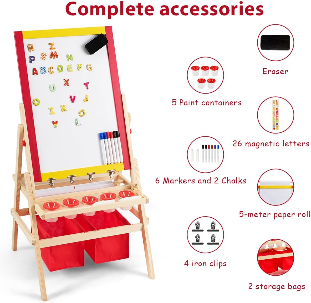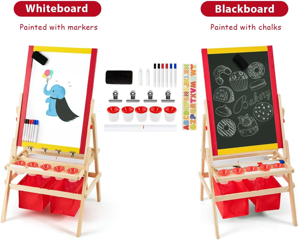 TAVOLETTA TRIPLO USO: Questa lavagna per bambini unisce una lavagna in gesso e una lavagna magnetica in un unico prodotto, utilizzabile su entrambi i lati. Il lato in gesso può essere scritto con il gesso, mentre il lato con la lavagna magnetica è adatto all'uso dei pennarelli. Può essere combinato anche con un rotolo di carta da disegno da 5 metri gratuito, così che il vostro bambino possa disegnare a volontà LEGNO STABILE E DUREVOLE: La lavagna magnetica per bambini è realizzata in legno di pino di alta qualità, ecologico e non tossico, per garantire la crescita sana del vostro bambino. Il telaio in legno di pino è solido e stabile, la struttura ad A garantisce che la lavagna per bambini con cavalletto sia molto stabile durante il processo di pittura, consentendo ai bambini di dipingere in tutta tranquillità ACCESSORI RICCHI: La lavagna bambini è fornita con 2 scatole portaoggetti rosse, 5 bicchieri per colori, 6 pennarelli per lavagna, 2 gessetti, una gomma per lavagna e altri accessori. Inoltre, ci sono 26 magneti con l'alfabeto inglese per consentire ai bambini di imparare qualcosa sull'alfabeto mentre disegnano. Quattro clip in ferro per fissare la carta da disegno rendono la pittura più comoda SPAZIO DI ARCHIVIAZIONE: Sotto il cavalletto disegno bambini si trovano 2 scomparti e 2 ampie scatole portaoggetti, in cui i bambini possono imparare a organizzare i loro strumenti da disegno. Il bambino impara a conservare i propri strumenti e a mantenere l'ambiente di disegno più ordinato e pulito BUONI AIUTANTI PER PROMUOVERE L'AMICIZIA: Questa lavagna cavalletto per bambini non è adatta solo ai bambini che dipingono da soli, ma anche a due bambini che possono lavorare contemporaneamente, per favorire l'interazione e la comunicazione tra coetanei. Dipingendo insieme, si promuovono le capacità comunicative, l'immaginazione e la creatività dei bambini