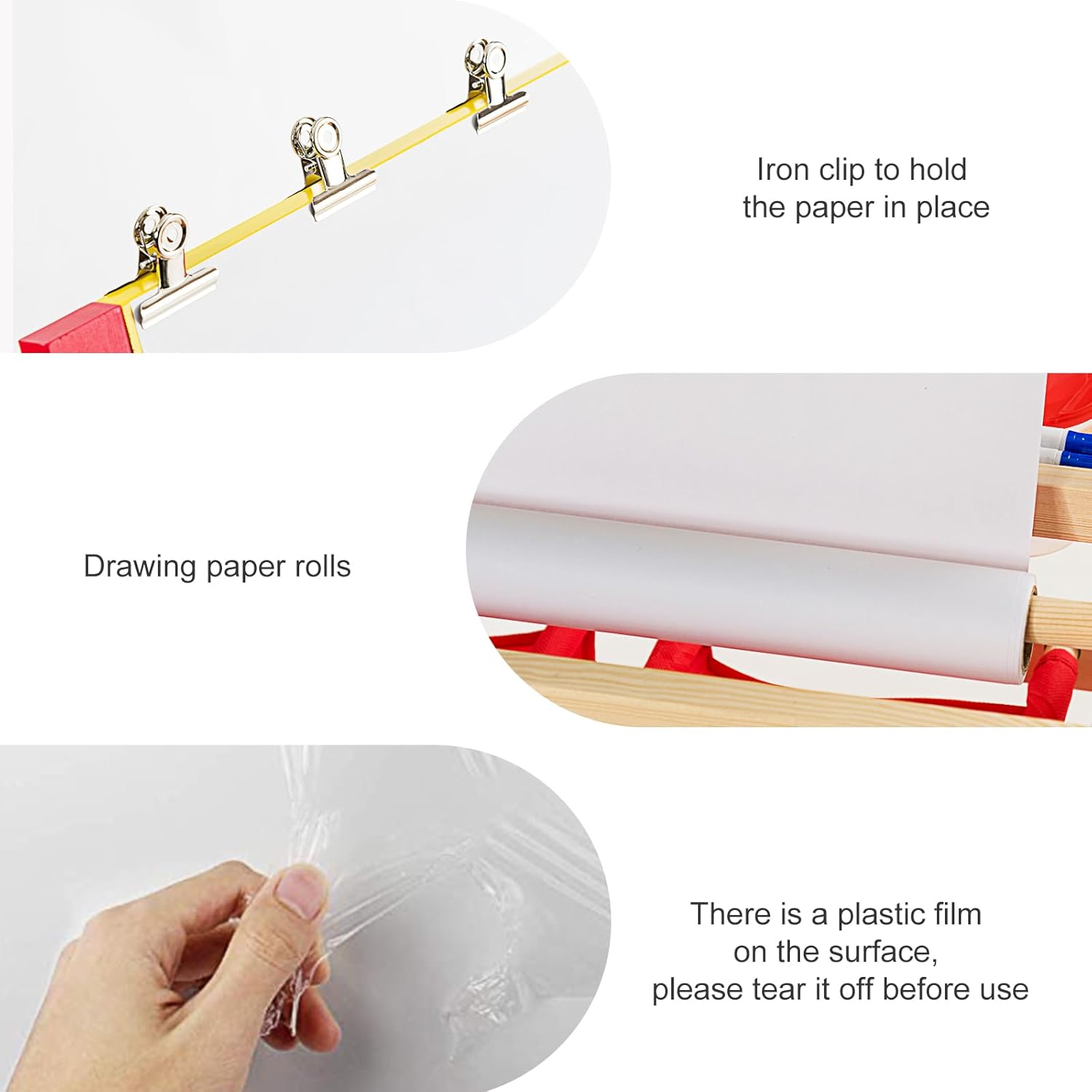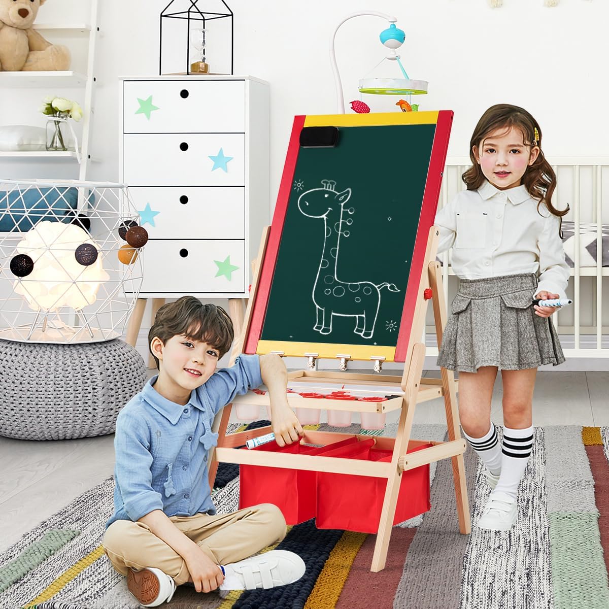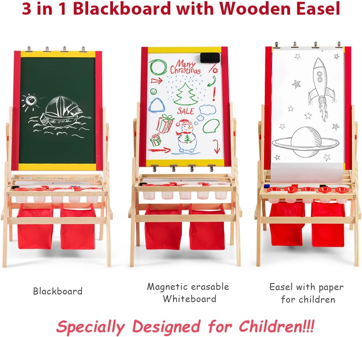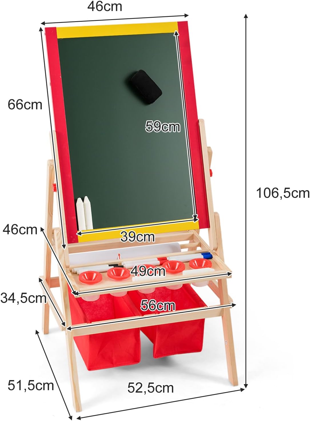 TAVOLETTA TRIPLO USO: Questa lavagna per bambini unisce una lavagna in gesso e una lavagna magnetica in un unico prodotto, utilizzabile su entrambi i lati. Il lato in gesso può essere scritto con il gesso, mentre il lato con la lavagna magnetica è adatto all'uso dei pennarelli. Può essere combinato anche con un rotolo di carta da disegno da 5 metri gratuito, così che il vostro bambino possa disegnare a volontà LEGNO STABILE E DUREVOLE: La lavagna magnetica per bambini è realizzata in legno di pino di alta qualità, ecologico e non tossico, per garantire la crescita sana del vostro bambino. Il telaio in legno di pino è solido e stabile, la struttura ad A garantisce che la lavagna per bambini con cavalletto sia molto stabile durante il processo di pittura, consentendo ai bambini di dipingere in tutta tranquillità ACCESSORI RICCHI: La lavagna bambini è fornita con 2 scatole portaoggetti rosse, 5 bicchieri per colori, 6 pennarelli per lavagna, 2 gessetti, una gomma per lavagna e altri accessori. Inoltre, ci sono 26 magneti con l'alfabeto inglese per consentire ai bambini di imparare qualcosa sull'alfabeto mentre disegnano. Quattro clip in ferro per fissare la carta da disegno rendono la pittura più comoda SPAZIO DI ARCHIVIAZIONE: Sotto il cavalletto disegno bambini si trovano 2 scomparti e 2 ampie scatole portaoggetti, in cui i bambini possono imparare a organizzare i loro strumenti da disegno. Il bambino impara a conservare i propri strumenti e a mantenere l'ambiente di disegno più ordinato e pulito BUONI AIUTANTI PER PROMUOVERE L'AMICIZIA: Questa lavagna cavalletto per bambini non è adatta solo ai bambini che dipingono da soli, ma anche a due bambini che possono lavorare contemporaneamente, per favorire l'interazione e la comunicazione tra coetanei. Dipingendo insieme, si promuovono le capacità comunicative, l'immaginazione e la creatività dei bambini
