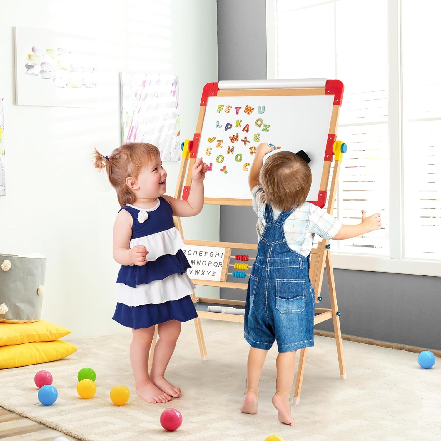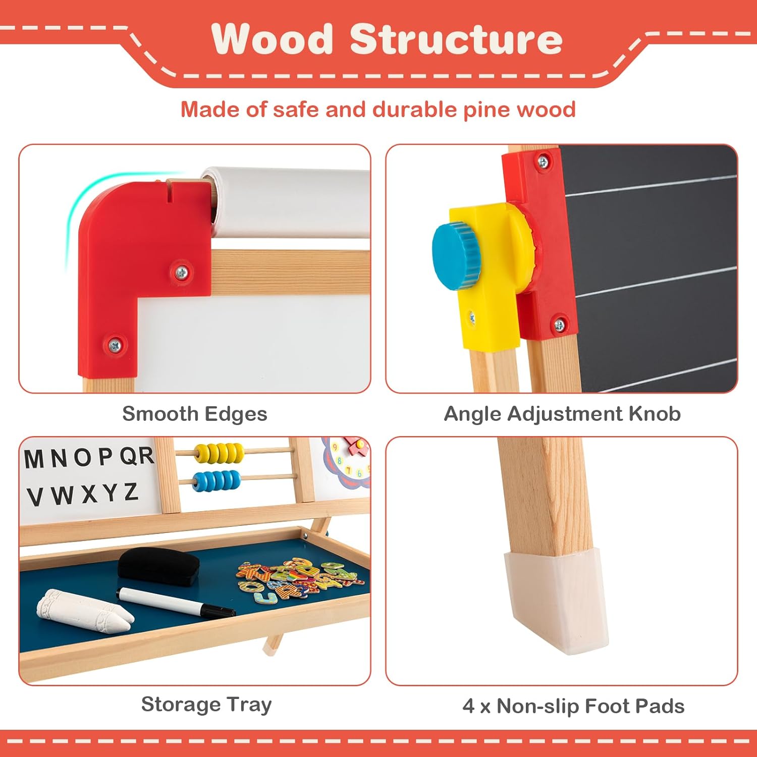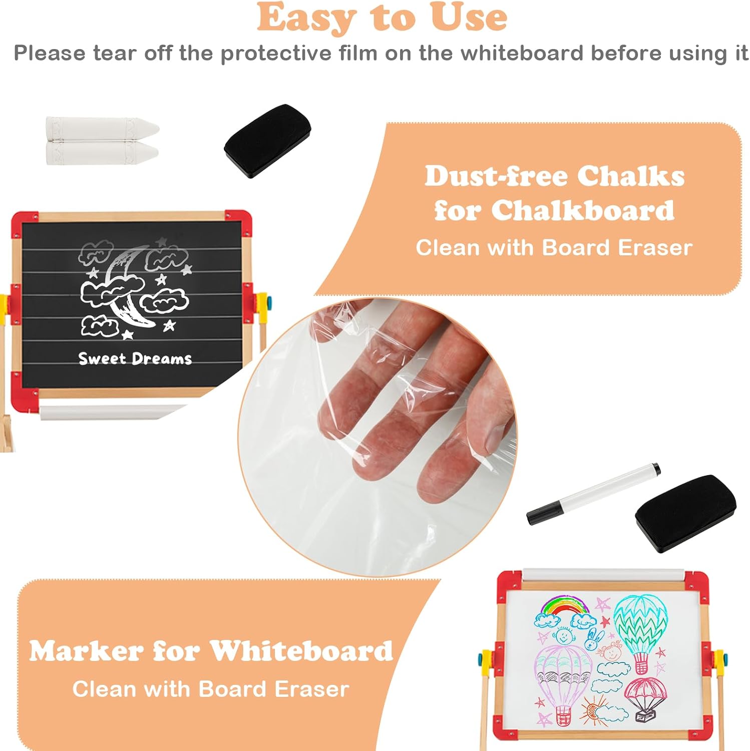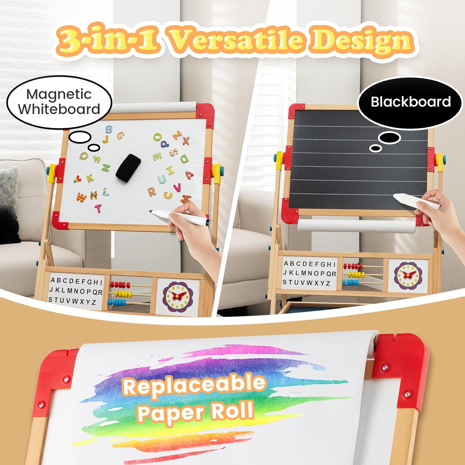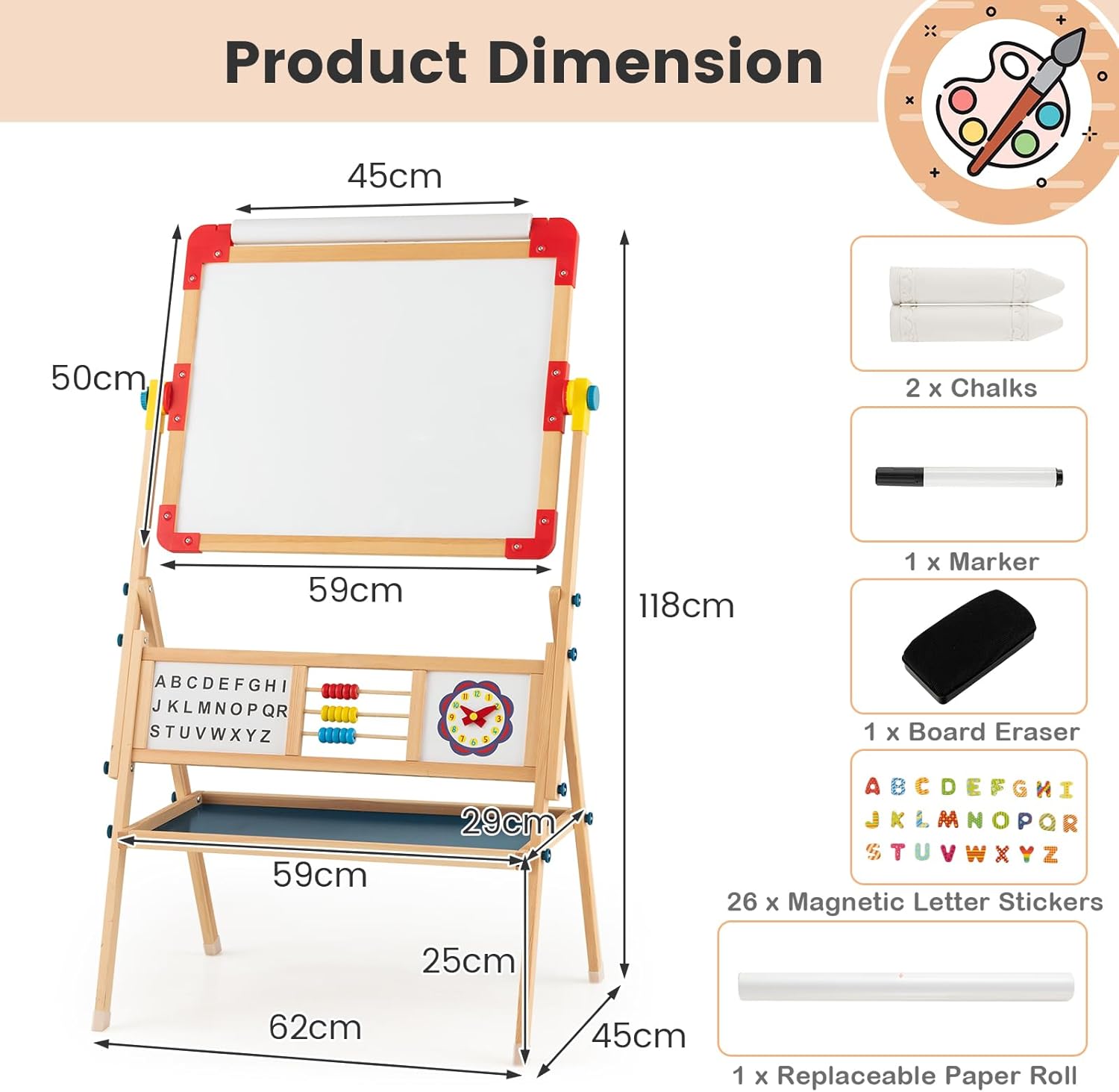 LAVAGNA PER BAMBINI A DOPPIA FACCIA CREATIVA: Questa lavagna per bambini combina una lavagna per gessetti e un lavagna magnetica in un'unica soluzione, entrambi i lati possono essere ruotati e regolati liberamente per soddisfare le diverse esigenze creative dei vostri bambini. La tavoletta da disegno di 62x45 cm consente al vostro bambino di esprimere liberamente la propria creatività. La cornice in legno di pino è stabile e resistente DESIGN GIRANTE A 360°: Con un semplice pulsante di comando, la lavagna bambini con cavalletto può ruotare di 360° e bloccarsi, permettendo un facile adattamento alla scrittura verticale, al disegno orizzontale o all'utilizzo come tavolo. L'altezza di 118 cm si adatta alle esigenze di altezza dei bambini di varie età ACCESSORI RICCHI: La lavagna montessoriana per bambini è dotata di carta da disegno 3M, 2 pezzi di gessetti, 1 gomma da lavagna, 1 pennarello e 26 adesivi magnetici con lettere dell'alfabeto. Gli adesivi magnetici con lettere dell'alfabeto facilitano ai bambini l'apprendimento dell'ortografia e lo sviluppo del riconoscimento delle lettere e delle parole. Il ripiano sotto la lavagna (59x29 cm) fornisce spazio per altre cancelleria e oggetti MATERIALI SICURI PER IL TUO BAMBINO: La lavagna cavalletto per bambini è realizzata in legno di pino selezionato, ecologico, non tossico e resistente. I bordi arrotondati e il design per bambini prevengono efficacemente graffi e collisioni, offrendo un ambiente sicuro per i bambini. I piedini antiscivolo migliorano la stabilità e garantiscono che la lavagnetta cancellabile bambini sia stabile e non si ribalti COMPAGNO DI CRESCITA: Questo cavalletto pittura bambini a doppia faccia non è solo un potente alleato per il tuo bambino nell'apprendere a disegnare, ma anche un ottimo strumento per coltivare la creatività e l'immaginazione. Attraverso il disegno e la creazione, i bambini possono esprimere il loro mondo interiore e godersi il divertimento e i successi della crescita