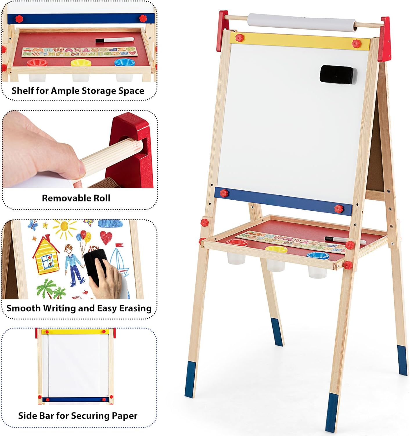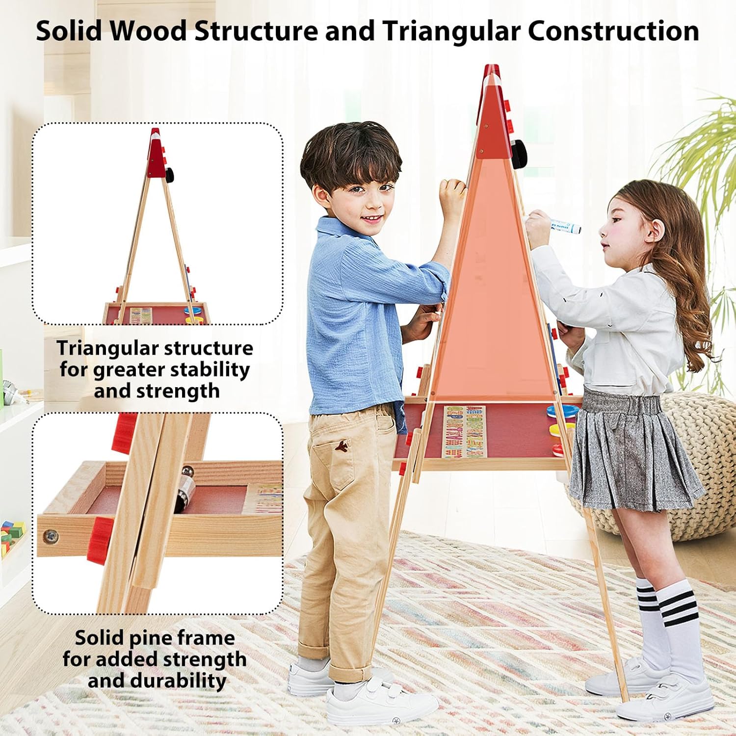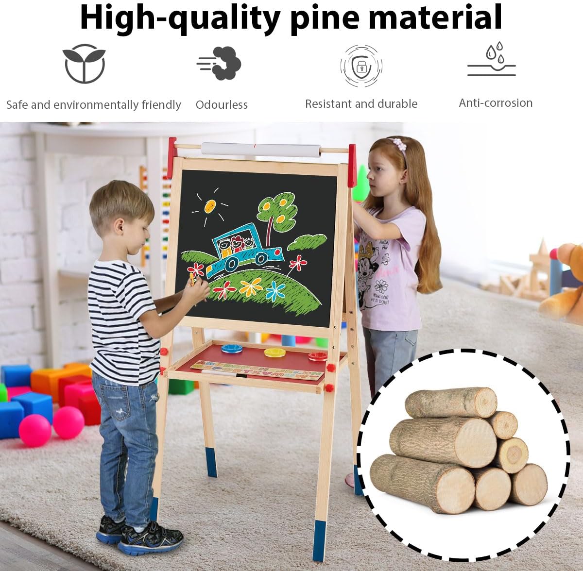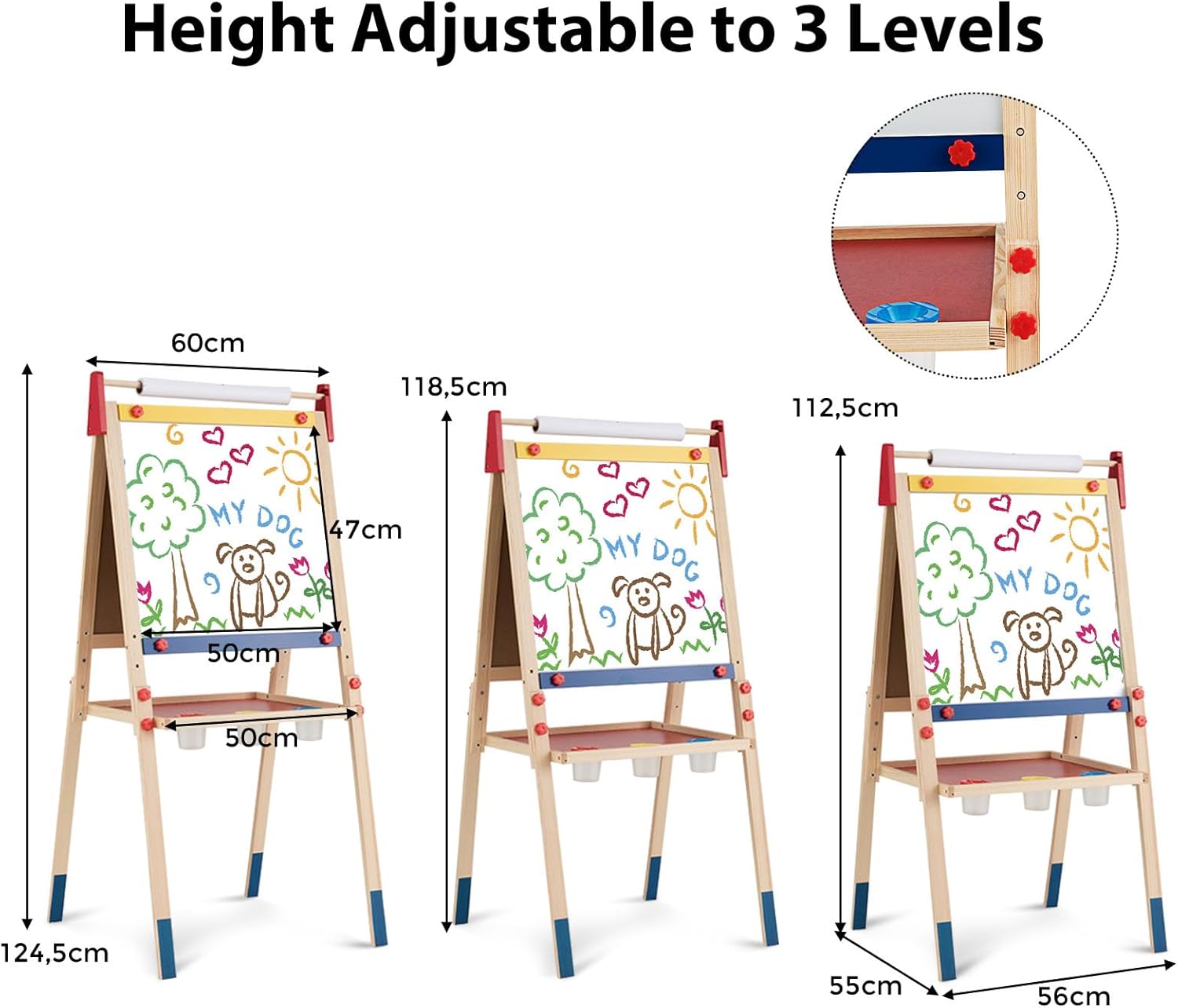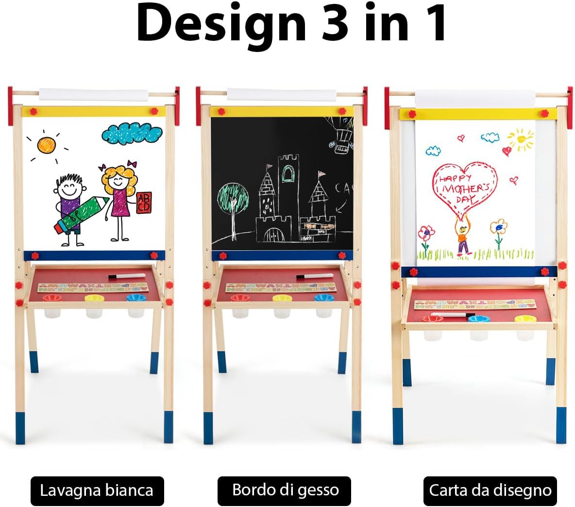 DESIGN MULTIFUNZIONALE COMBINATO: Questo cavalletto pittura bambini in legno include una lavagna magnetica su entrambi i lati e un rotolo di carta, offrendo funzioni ricche. La lavagna nera può essere utilizzata per disegnare con il gesso, permettendo di creare opere dettagliate; la lavagna bianca è adatta per pennarelli magnetici sicuri e senza polvere, garantendo la sicurezza creativa dei bambini; il design a guida scorrevole sulla parte superiore offre ancora più spazio alla creatività dei bambini ALTEZZA REGOLABILE PER LA CRESCITA: Questo cavalletto per bambini supporta tre livelli di regolazione dell’altezza, rispettivamente 124,5 cm, 118,5 cm e 112,5 cm, adatti a bambini dai 3 ai 12 anni. L’altezza può essere adattata in modo flessibile in base all’altezza e all’età del bambino, rendendo il cavalletto adatto dall’asilo alla scuola elementare SUPPORTA L’APPRENDIMENTO E L’INTERAZIONE: Questa lavagna bambini con cavalletto è uno strumento pratico per l’apprendimento del disegno, della scrittura e altre abilità. Il design a doppia faccia consente a due bambini di disegnare contemporaneamente, favorendo l’interazione e l’amicizia tra i bambini; inoltre, aiuta a sviluppare le abilità motorie e a liberare pienamente la creatività ACCESSORI COMPLETI: Il vassoio della lavagna per bambini è dotato di 3 contenitori per vernice anti-goccia, per evitare schizzi durante la pittura dei bambini. Inoltre, sono inclusi un supporto per pennarelli per lavagna bianca, una lavagnetta da cancellare, due pezzi di gesso e 26 magneti con lettere dell’alfabeto inglese, per soddisfare diversi scenari d’uso STRUTTURA ROBUSTA E STABILE: Questa lavagna per disegnare bambini è realizzata con una cornice in legno di pino, resistente e durevole nel tempo. La struttura a triangolo aumenta la stabilità, permettendo un utilizzo stabile su varie superfici