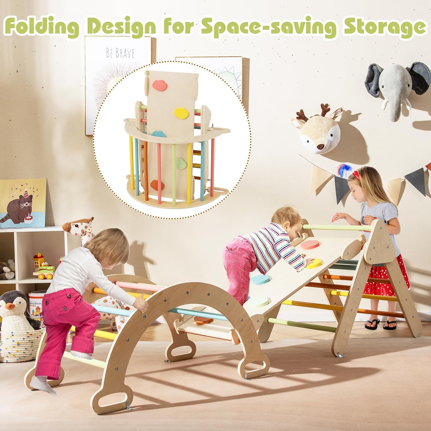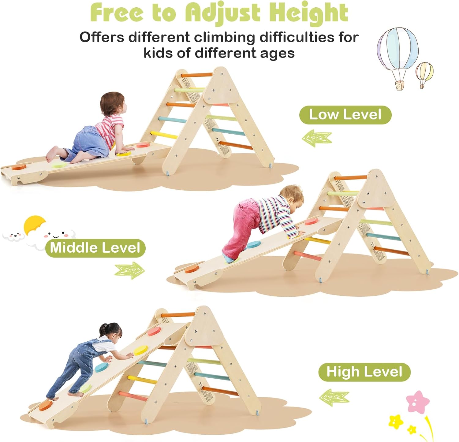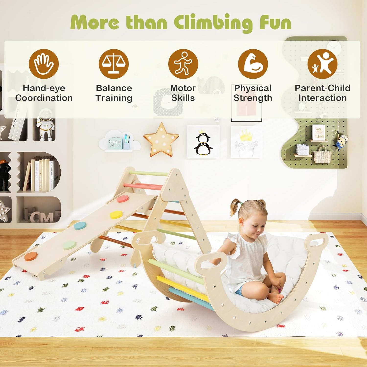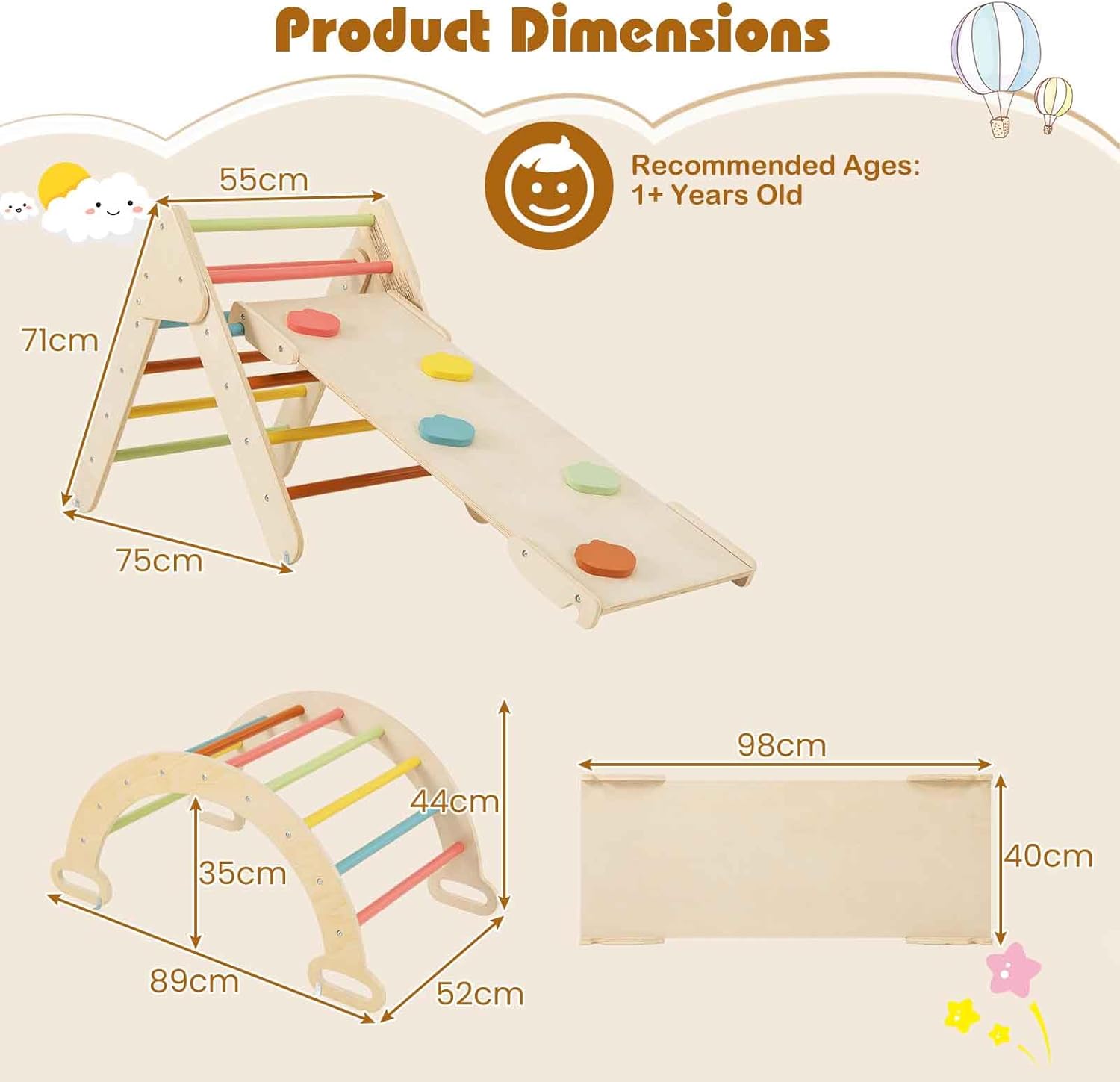 🎁~ Multiple combinazioni aggiungono divertimento ~ Questo set di arrampicata consiste in un triangolo di arrampicata, un arco di arrampicata e una rampa, che possono essere combinati in diverse forme secondo le preferenze del vostro bambino, permettendogli di godere di divertimento e creatività senza fine. 🎁~ Innovativo design a doppio lato ~ La rampa presenta un design a doppio lato che consente ai bambini di scivolare o arrampicarsi a loro piacimento per una maggiore versatilità nel gioco. I triangoli per l'arrampicata e le rampe vengono utilizzati in combinazione in modo che i bambini possano scegliere tra diverse altezze. Inoltre, l'arco di arrampicata può essere convertito in un dondolo, aggiungendo ulteriori opzioni di gioco. 🎁~ Costruzione robusta e affidabile ~ Questo parco giochi per l'arrampicata è progettato con una struttura robusta che impedisce efficacemente ai bambini di cadere durante il gioco. La solida connessione migliora la stabilità complessiva e offre maggiore tranquillità ai genitori. 🎁~ Materiale sicuro e resistente ~ Il set di arrampicata in legno è realizzato in legno di faggio naturale, che non solo è resistente e sicuro, ma dura anche più a lungo. I bordi del parco giochi sono lisci e privi di sbavature per garantire la sicurezza dei bambini durante il gioco. 🎁~ Promuove lo sviluppo generale dei bambini ~ Questo set di giocattoli di legno per l'arrampicata è il regalo perfetto per i bambini di età superiore a 1 anno. I bambini possono non solo sviluppare equilibrio e capacità di apprendimento, ma anche migliorare le loro abilità sociali e varie altre abilità durante il gioco. Fornisce un ambiente per lo sviluppo integrato dei bambini.