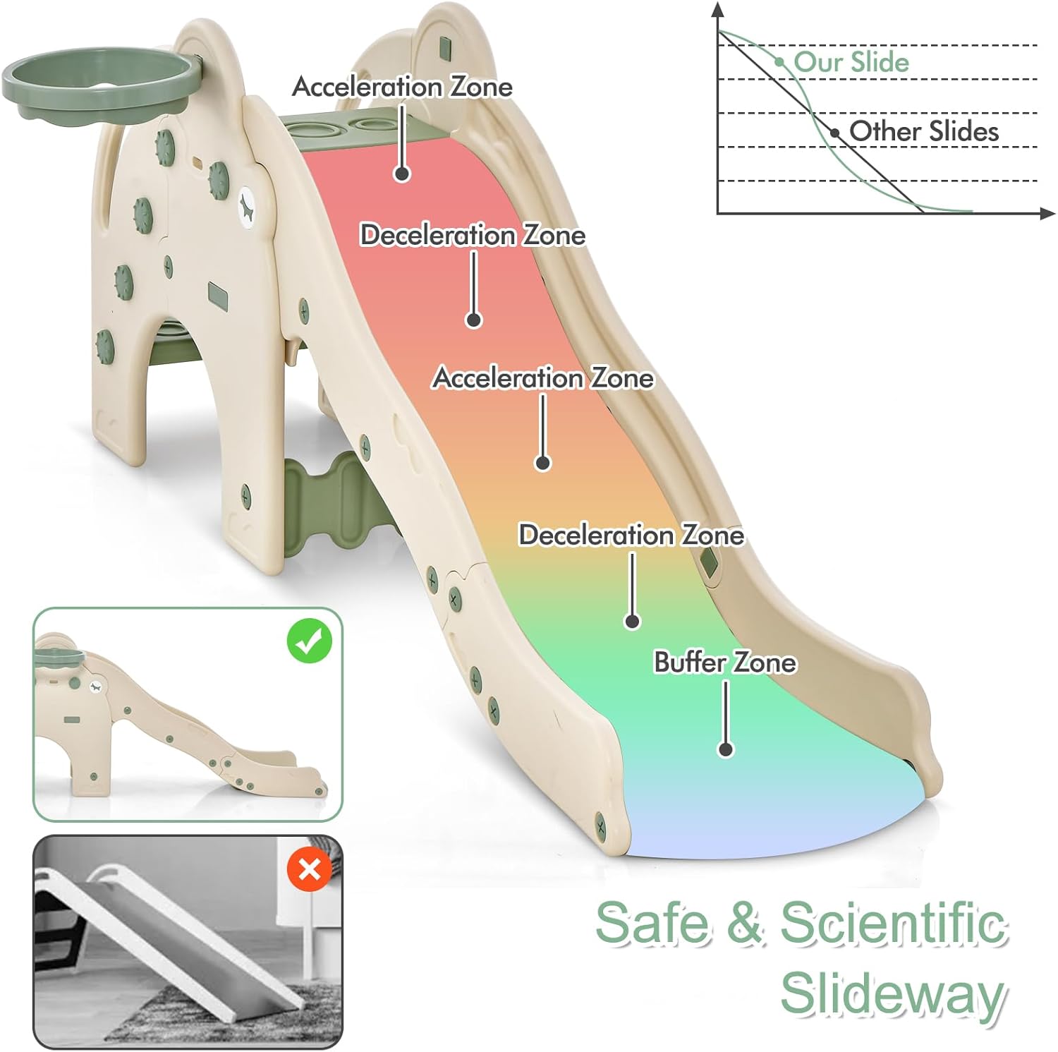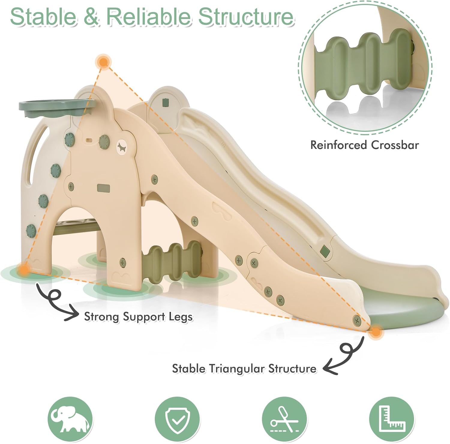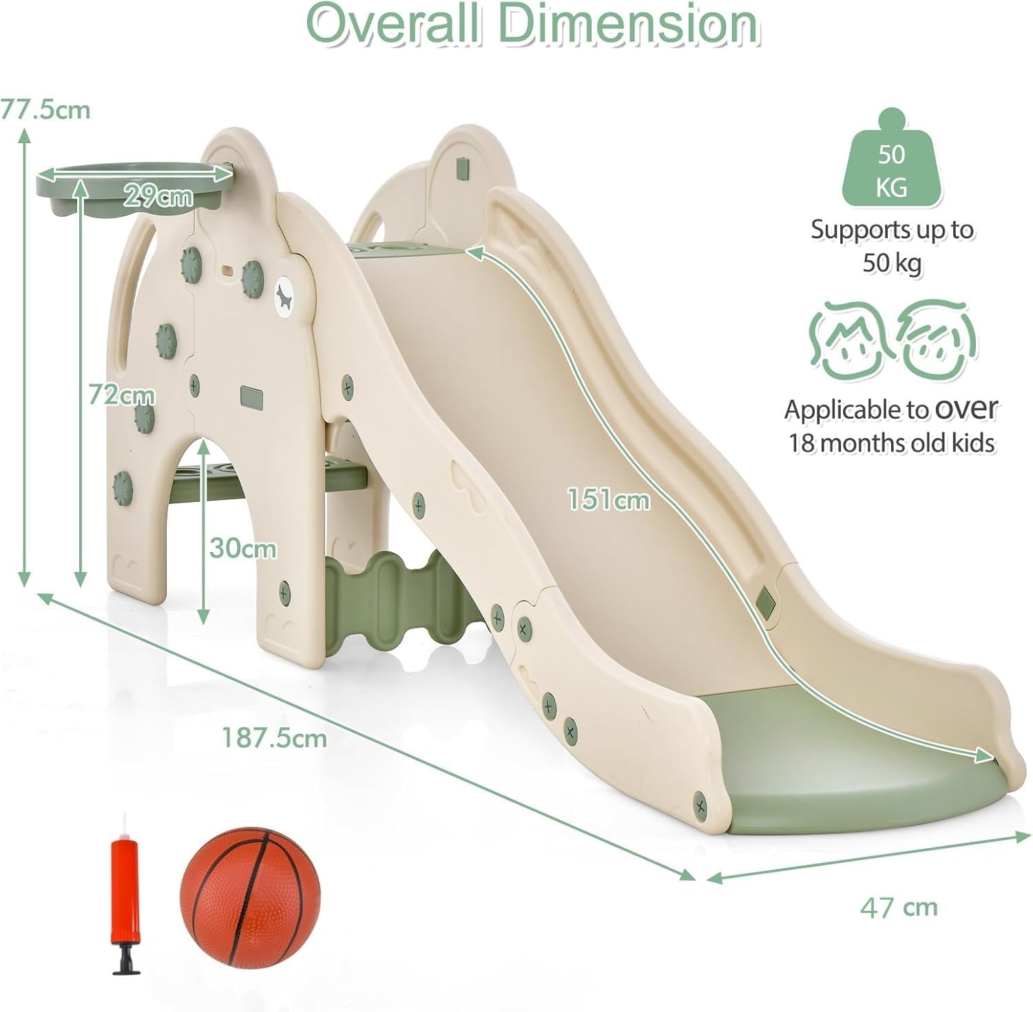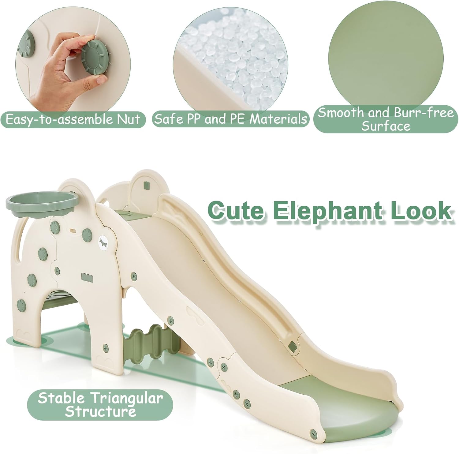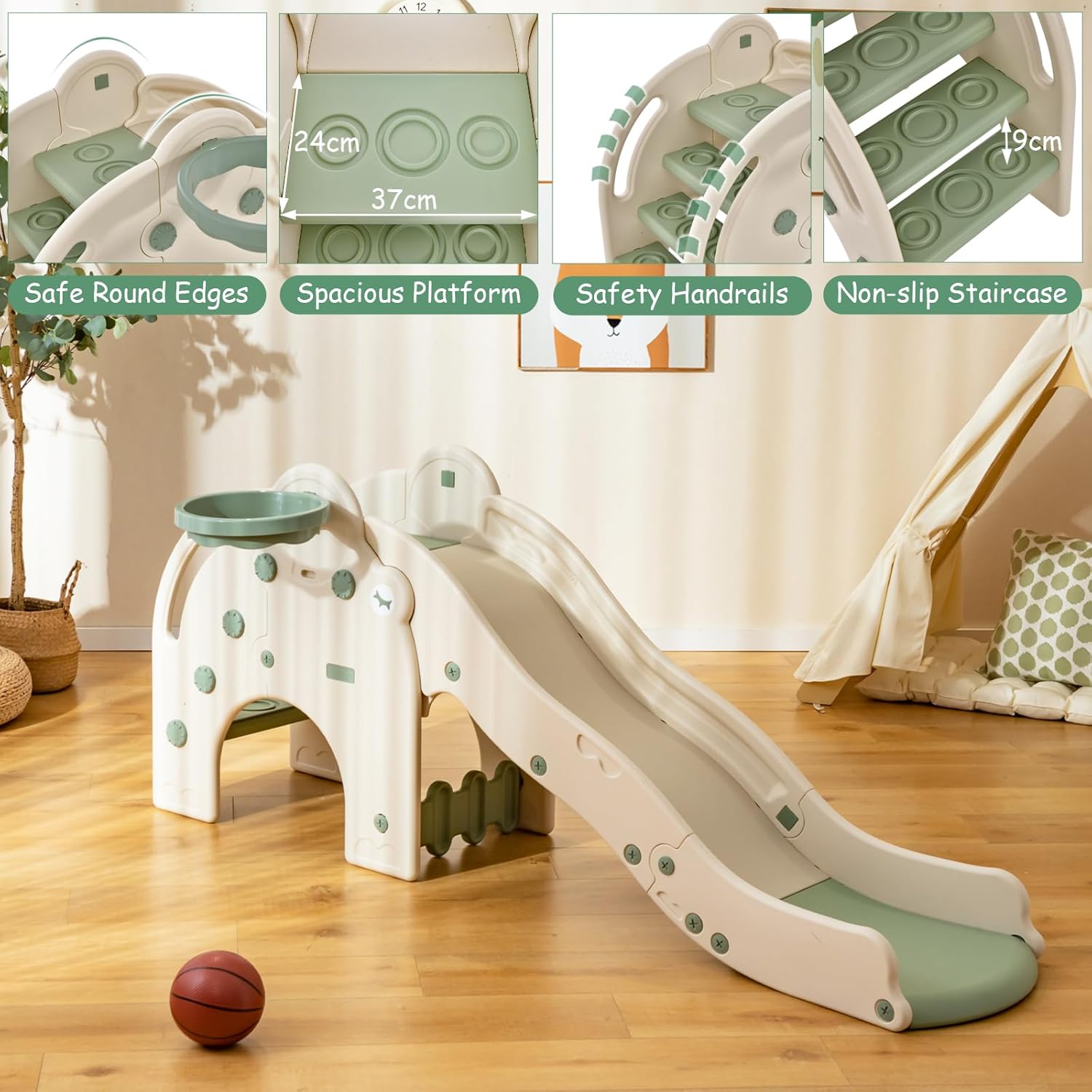 PARCO GIOCHI PER BAMBINI 4-IN-1: Questo parco giochi bambini interno è una struttura ricreativa multifunzionale che combina scivolo, canestro, scale e tunnel, in grado di offrire non solo diverse esperienze ludiche, ma anche di stimolare l'immaginazione e la creatività dei bambini, consentendo loro di svilupparsi a tutto tondo mentre giocano SCIVOLO A ONDA: Realizzato con materiali di alta qualità come HDPE e PP, questo giochi montessori per bambini include anche uno scivolo a onda. Grazie al design curvilineo dello scivolo a onda, i bambini incontreranno molte curve e punti di svolta durante la discesa, i quali rallenteranno la velocità dello scivolo e ridurranno l'impatto durante il percorso. Le maniglie e le sponde di sicurezza integrati garantiscono ulteriormente la sicurezza dei bambini durante il gioco SVILUPPO DELLE CAPACITÀ MOTORIE DEI BAMBINI: Questo parco giochi per bambini multifunzionale consente ai bambini di sviluppare la forza muscolare e la coordinazione corporea attraverso attività come scalare le scale, scivolare sullo scivolo e fare canestro, oltre a promuovere il coraggio e la fiducia in sé stessi. Inoltre, stimola l'interesse dei bambini per l'attività fisica, gettando così le basi per una salute futura solida DESIGN DIVERTENTE A FORMA DI ELEFANTE: Questo scivolo per bambini da casa interno presenta un design a forma di elefante adorabile, dai colori brillanti e dalle forme vivaci, che regala ai bambini più divertimento e sorprese. Gli elefanti sono uno dei animali preferiti dei bambini e questo design non solo rispecchia il loro gusto estetico, ma stimola anche la loro immaginazione e desiderio di esplorare COMPLETO DI ACCESSORI, FACILE DA MONTARE: Questo scivolo per bambini è dotato di palline e pompa per gonfiaggio, consentendo ai bambini di iniziare subito a giocare a canestro, aggiungendo così divertimento e interazione. Inoltre, l'installazione della struttura è semplice, permettendo ai genitori e ai bambini di parteciparvi insieme, godendo così del divertimento e rafforzando il legame genitore-figlio