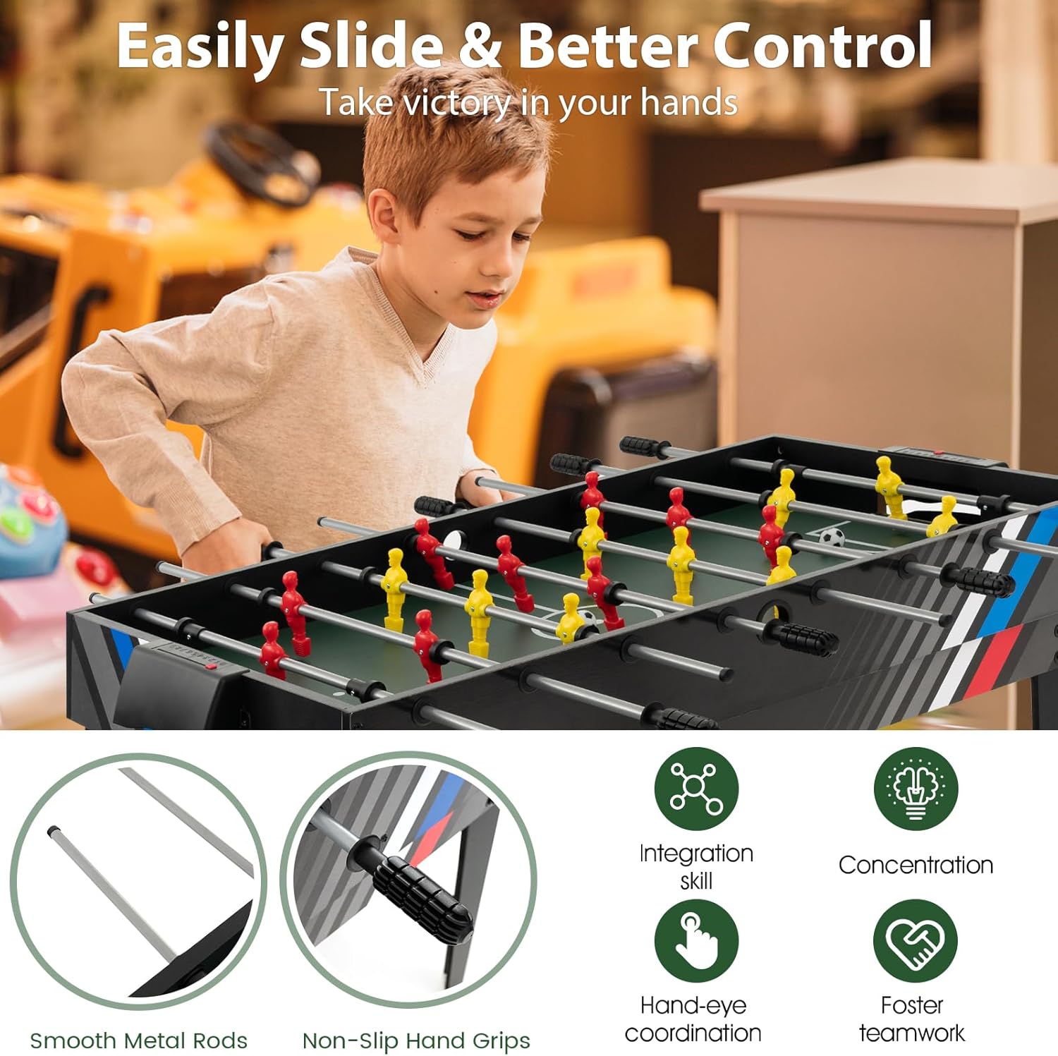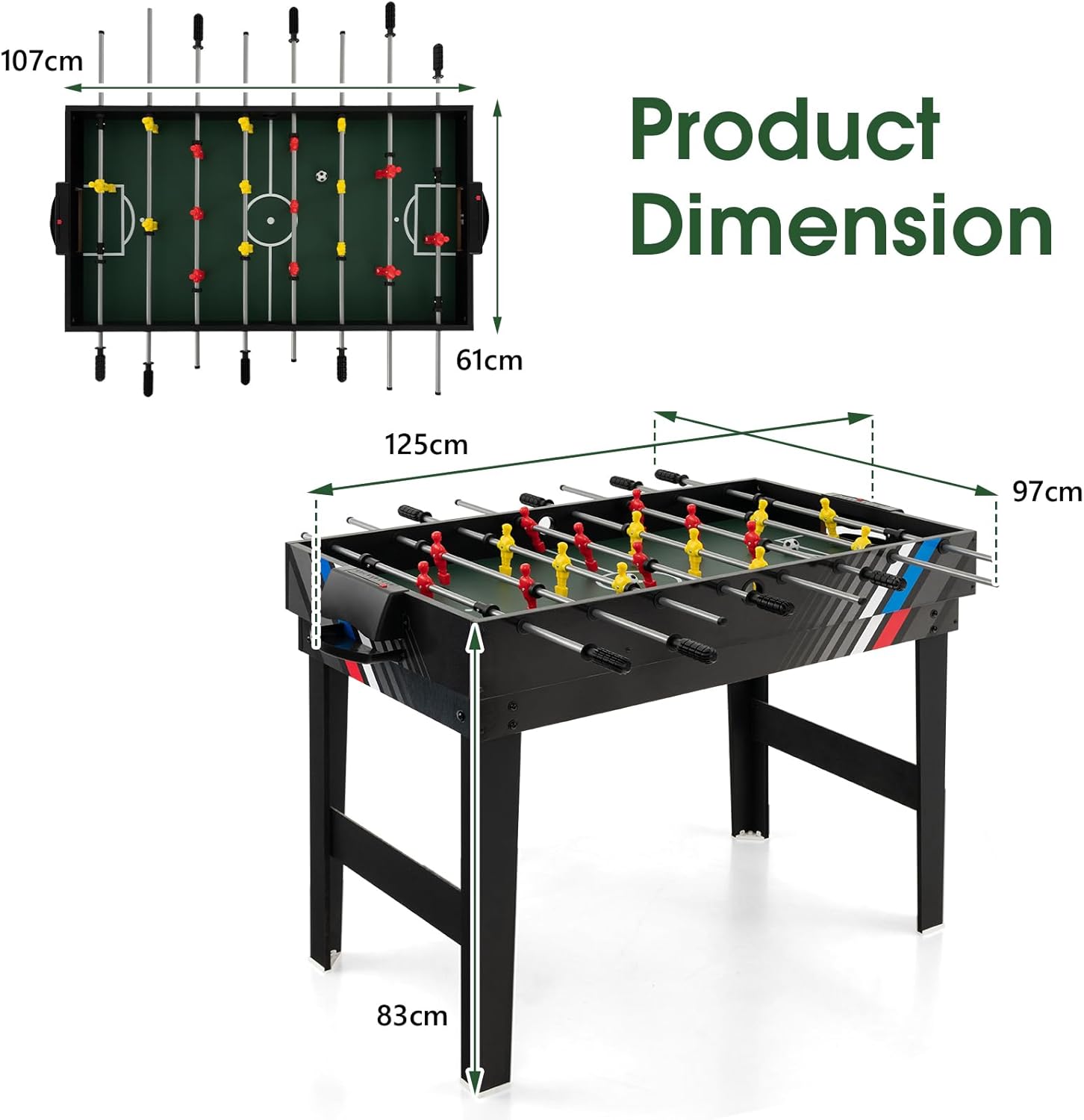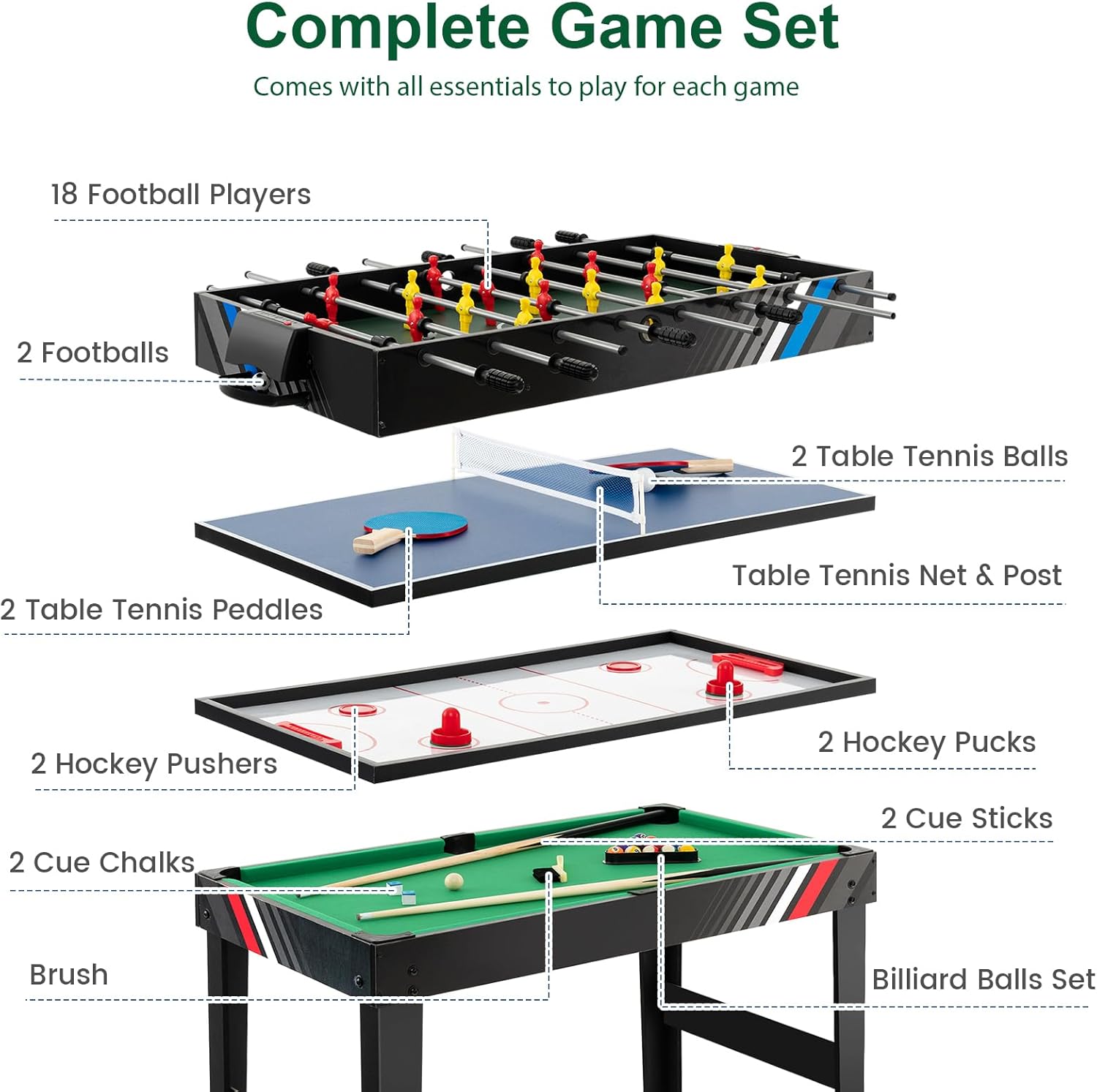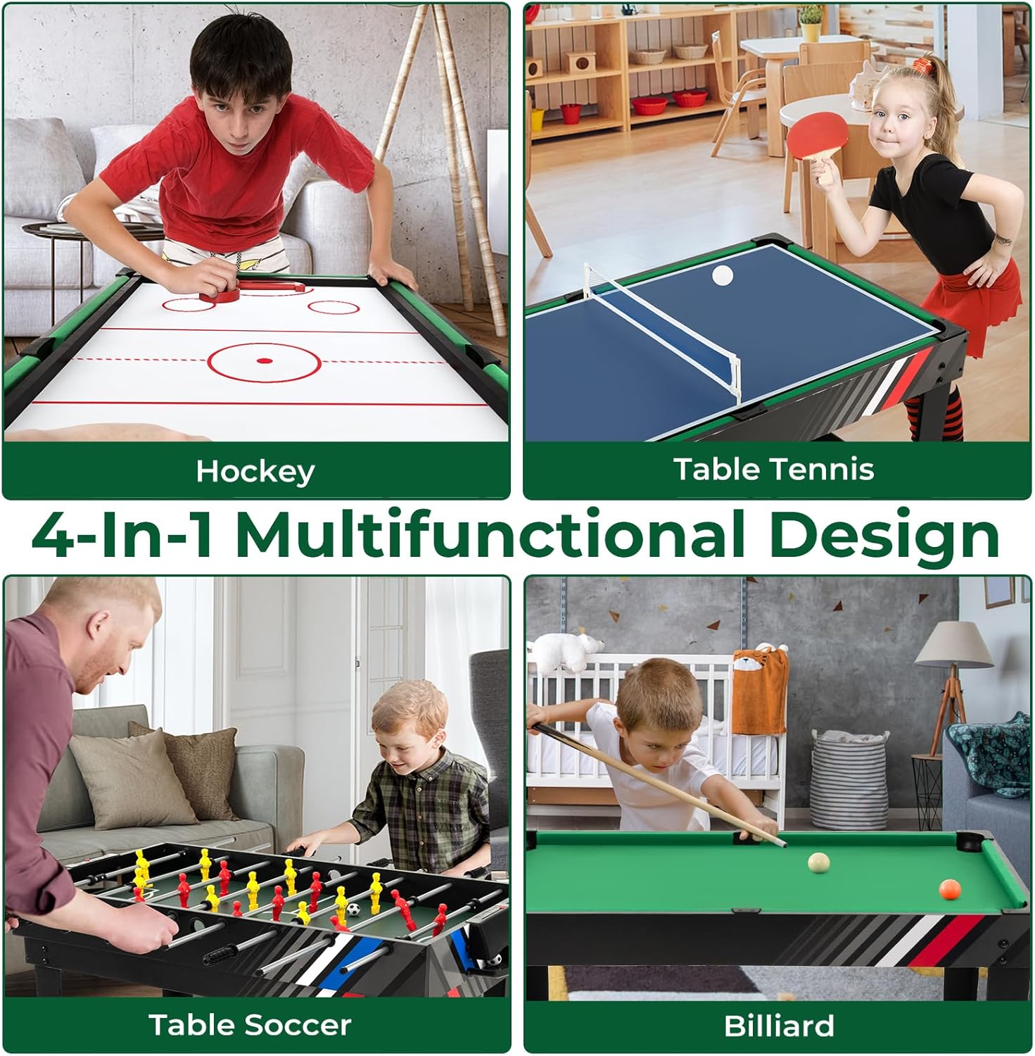 TAVOLO DA GIOCO 4 IN 1: Questo tavolo multigioco combina calcio, biliardo, hockey da tavolo e ping pong in un unico prodotto, adatto a soddisfare le esigenze di intrattenimento di tutta la famiglia. Con quattro modalità di gioco diverse, ogni riunione familiare sarà piena di divertimento e novità ACCESSORI COMPLETI: Il tavolo da calcio balilla è dotato di tutti gli accessori necessari per giocare a calcio, biliardo, hockey su ghiaccio e ping pong, evitando così di dover acquistare nulla di aggiuntivo per un'esperienza di gioco completa. Dai bastoni da calcio alle palline da biliardo, tutto il necessario è incluso per garantire un'esperienza di gioco senza intoppi ROBUSTO E RESISTENTE: Il biliardino per bambini è progettato con piedini a forma di H e dotato di tappetini antiscivolo sulla base, garantendo che la superficie resti stabile durante il gioco e non scivoli facilmente. Che si tratti di una partita intensa a biliardo o di un tiro a porta nel calcio, il tavolo può resistere facilmente, rendendo il gioco più divertente e prolungando allo stesso tempo la durata di utilizzo del calcetto balilla EDUCAZIONE E DIVERTIMENTO: Questo tavolo biliardo trasformabile non è solo un prodotto per l'intrattenimento, ma anche una risorsa educativa. Attraverso il gioco, i membri della famiglia possono allenare il corpo, migliorare la prontezza e la capacità di reazione. Inoltre, le diverse modalità di gioco possono stimolare l'intelligenza, incoraggiare lo spirito di squadra e la competitività, aiutando così i membri della famiglia a crescere divertendosi DIMENSIONI IDEALI: Il tavolo ping pong ha delle dimensioni perfette, con una dimensione principale del tavolo da gioco di 125 x 97 x 83 cm e una dimensione del piano di 107 x 61 cm, adatto sia per l'uso domestico che per non occupare troppo spazio. Che sia posizionato in salotto, in sala giochi o sul balcone, il tavolo si integrerà facilmente nell'ambiente, portando alla famiglia momenti di gioia infinita