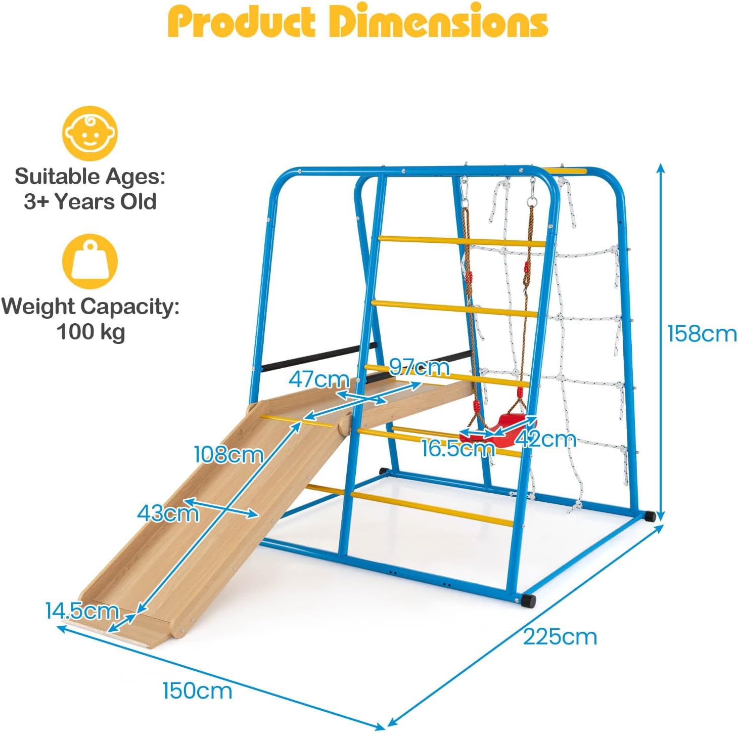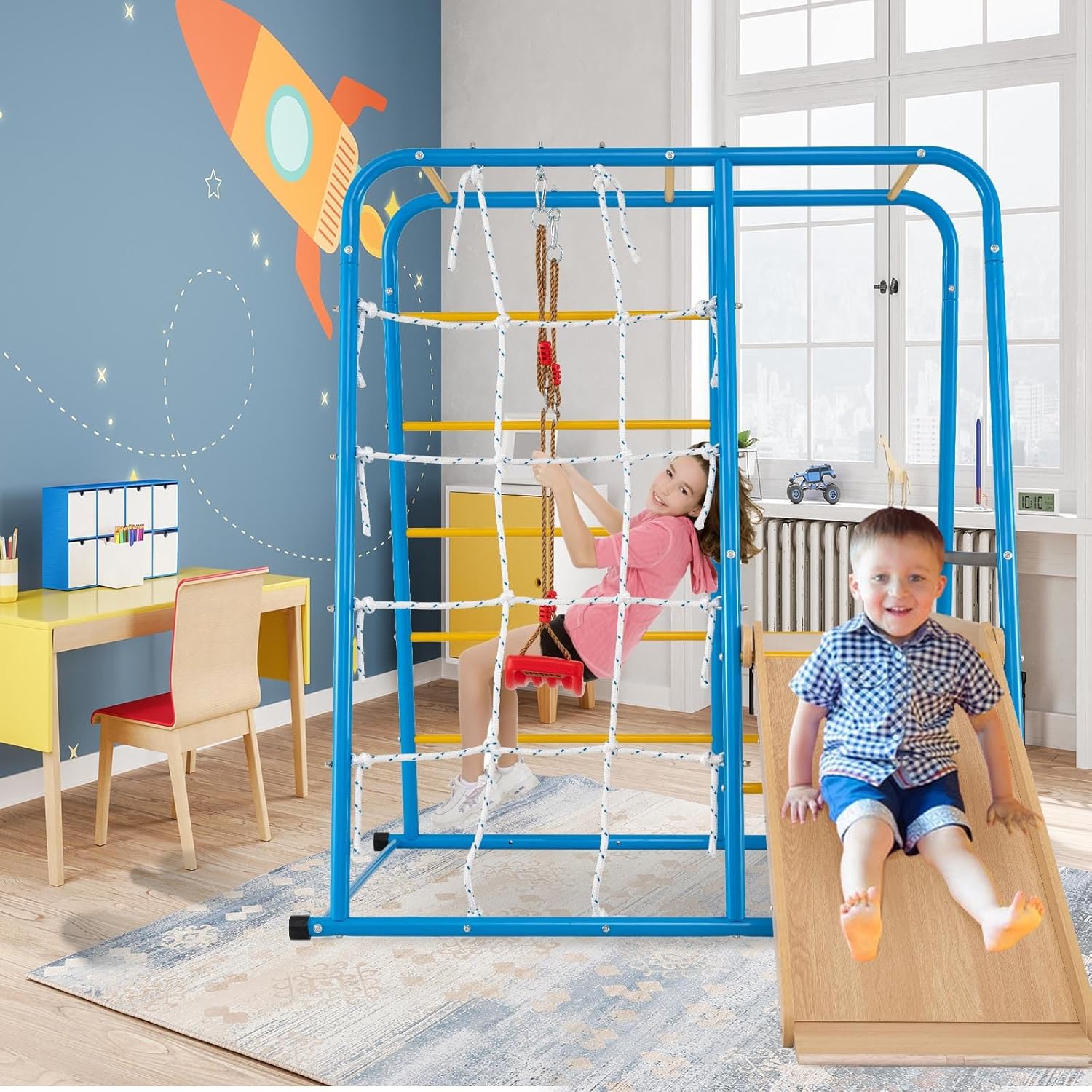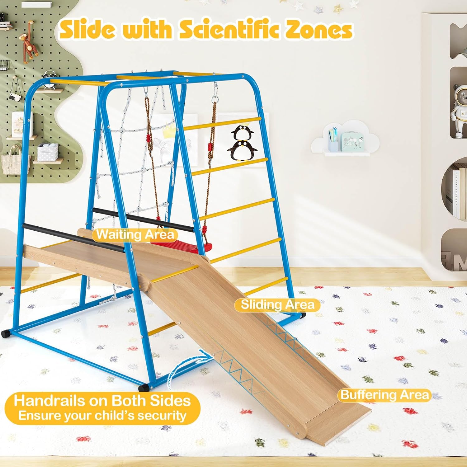 AREA GIOCO MULTIPLA: Questo set di arrampicata per bambini con scivolo offre sei aree gioco che includono un monopiede, una parete di corda, un'altalena, un parco giochi per arrampicarsi, uno scivolo e un parco giochi per arrampicarsi CONFIGURAZIONE FLESSIBILE: Questo set arrampicata montessori è dotato di scivoli regolabili che possono essere posizionati in diverse posizioni per adattarsi a qualsiasi spazio. Le altalene regolabili in altezza offrono un'esperienza di gioco personalizzata che si adatta allo sviluppo e alla crescita dei bambini SCIVOLO TRIPLO SICURO: Questa palestra montessoriana per bambini è progettato con aree differenziate per offrire la massima protezione. Include una piattaforma di attesa con superficie antiscivolo, un canale di scivolamento ergonomico e una zona di frenata morbida per un arresto sicuro. Inoltre, incorporate ringhiere laterali che forniscono una presa salda durante l'uso, garantendo maggiore sicurezza e controllo STRUTTURA INDUSTRIALE RESISTENTE: Struttura metallica premium con capacità certificata per 50 kg, che garantisce massima resistenza e stabilità del parco giochi per bambini. La base include piedi antiscivolo per una maggiore sicurezza e stabilità in ogni momento IDEALE PER LO SVILUPPO INFANTILE: Questa altalena per bambini stimola abilità chiave come coordinazione, forza muscolare ed equilibrio mentre i bambini giocano. Un ottimo regalo educativo per compleanni, Natale o occasioni speciali che unisce divertimento e apprendimento