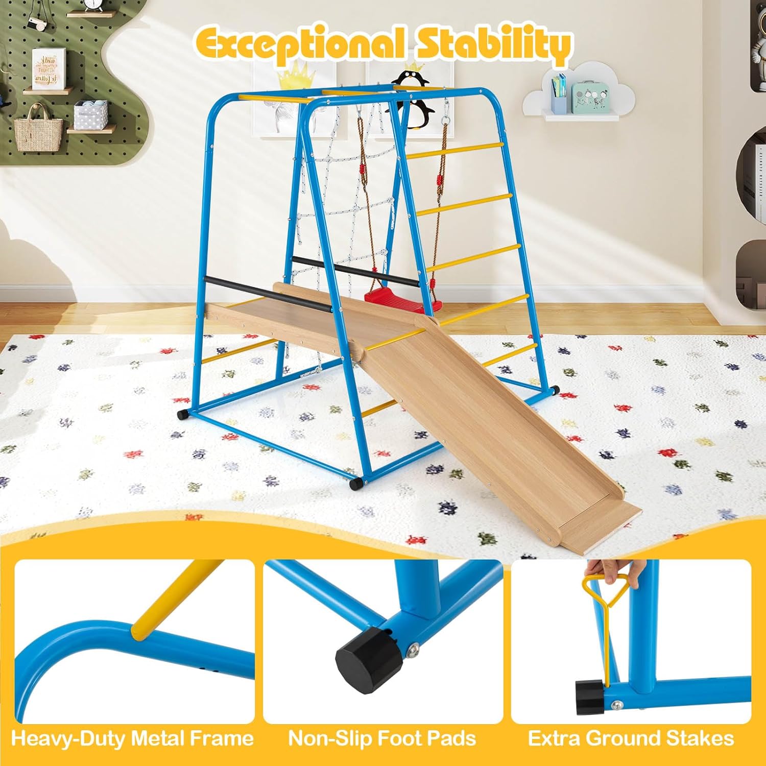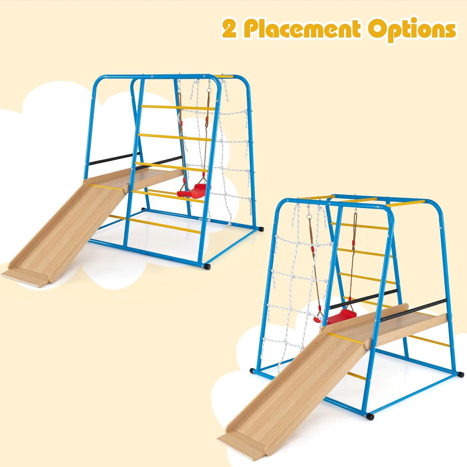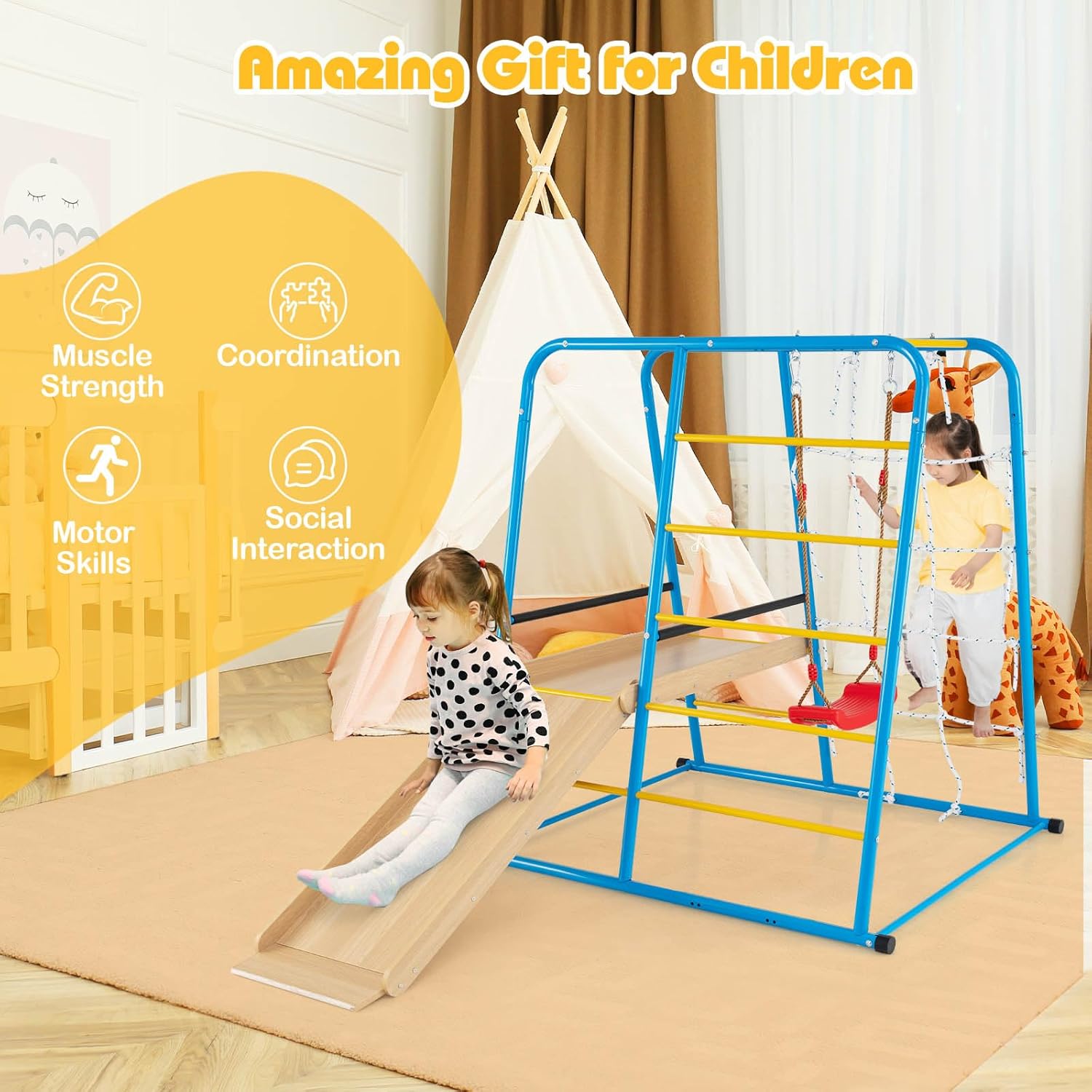 AREA GIOCO MULTIPLA: Questo set di arrampicata per bambini con scivolo offre sei aree gioco che includono un monopiede, una parete di corda, un'altalena, un parco giochi per arrampicarsi, uno scivolo e un parco giochi per arrampicarsi CONFIGURAZIONE FLESSIBILE: Questo set arrampicata montessori è dotato di scivoli regolabili che possono essere posizionati in diverse posizioni per adattarsi a qualsiasi spazio. Le altalene regolabili in altezza offrono un'esperienza di gioco personalizzata che si adatta allo sviluppo e alla crescita dei bambini SCIVOLO TRIPLO SICURO: Questa palestra montessoriana per bambini è progettato con aree differenziate per offrire la massima protezione. Include una piattaforma di attesa con superficie antiscivolo, un canale di scivolamento ergonomico e una zona di frenata morbida per un arresto sicuro. Inoltre, incorporate ringhiere laterali che forniscono una presa salda durante l'uso, garantendo maggiore sicurezza e controllo STRUTTURA INDUSTRIALE RESISTENTE: Struttura metallica premium con capacità certificata per 50 kg, che garantisce massima resistenza e stabilità del parco giochi per bambini. La base include piedi antiscivolo per una maggiore sicurezza e stabilità in ogni momento IDEALE PER LO SVILUPPO INFANTILE: Questa altalena per bambini stimola abilità chiave come coordinazione, forza muscolare ed equilibrio mentre i bambini giocano. Un ottimo regalo educativo per compleanni, Natale o occasioni speciali che unisce divertimento e apprendimento