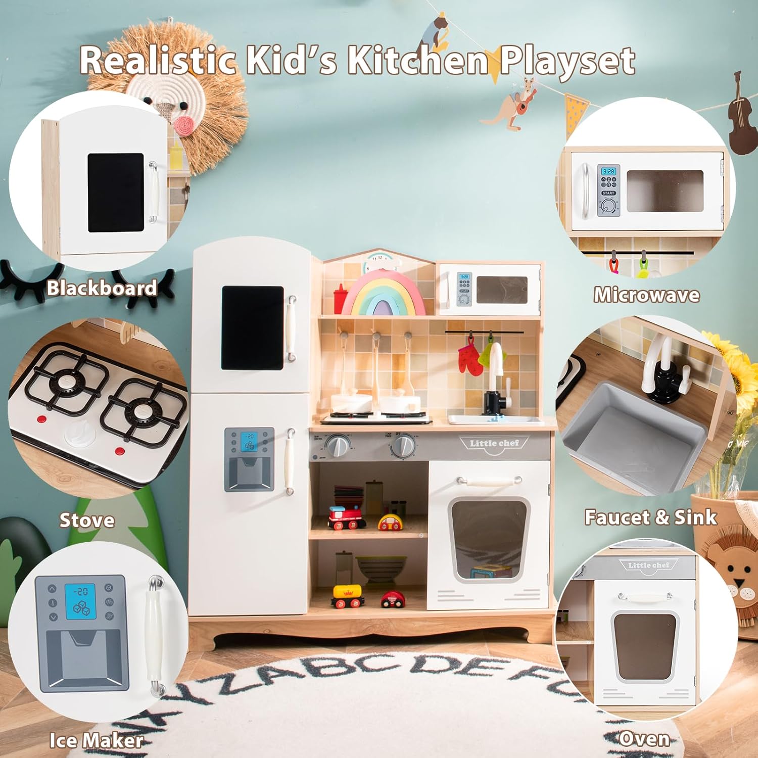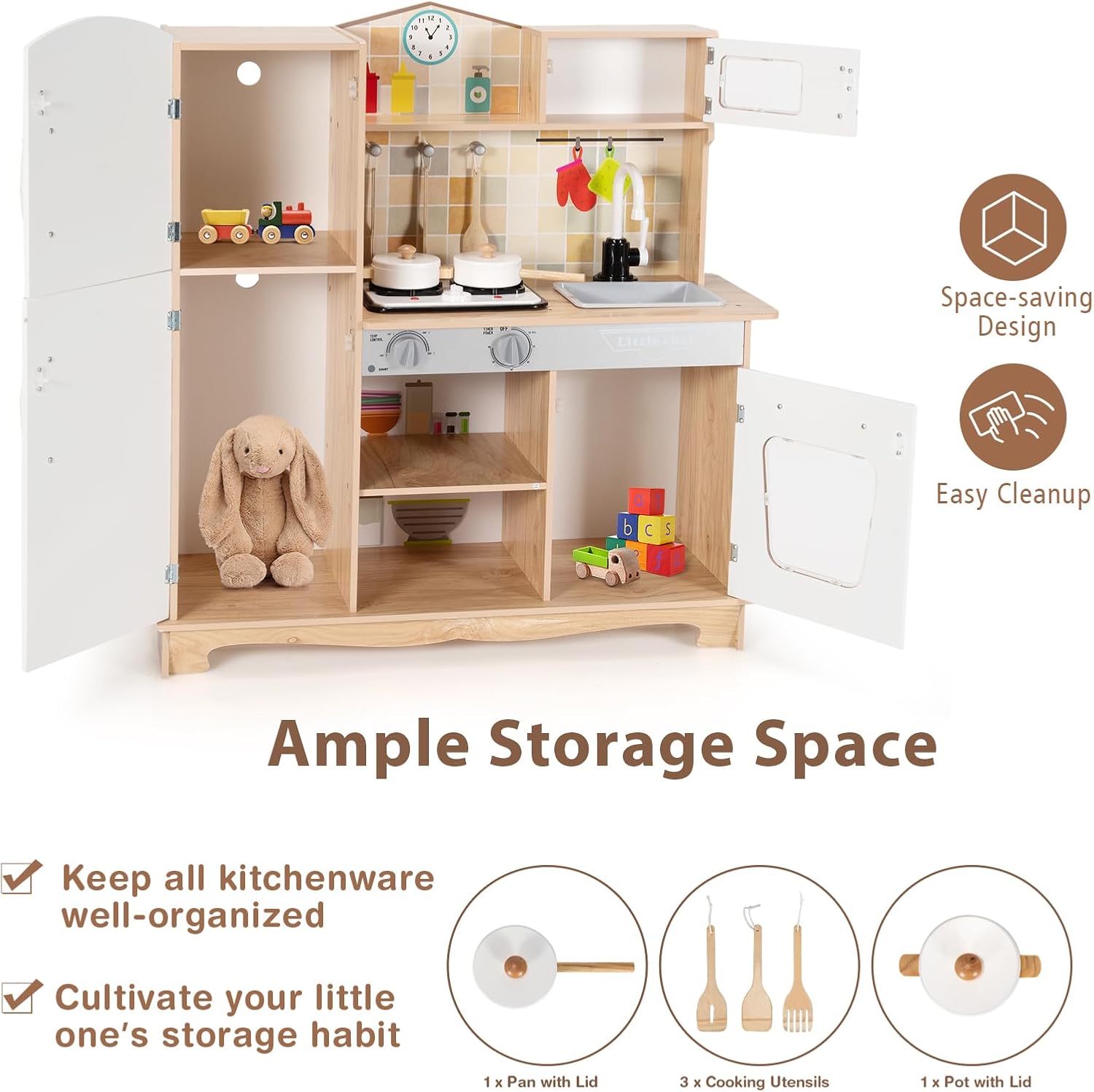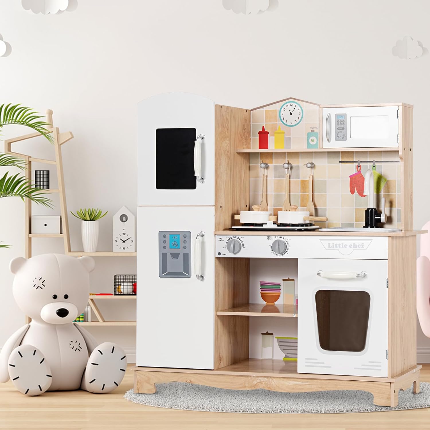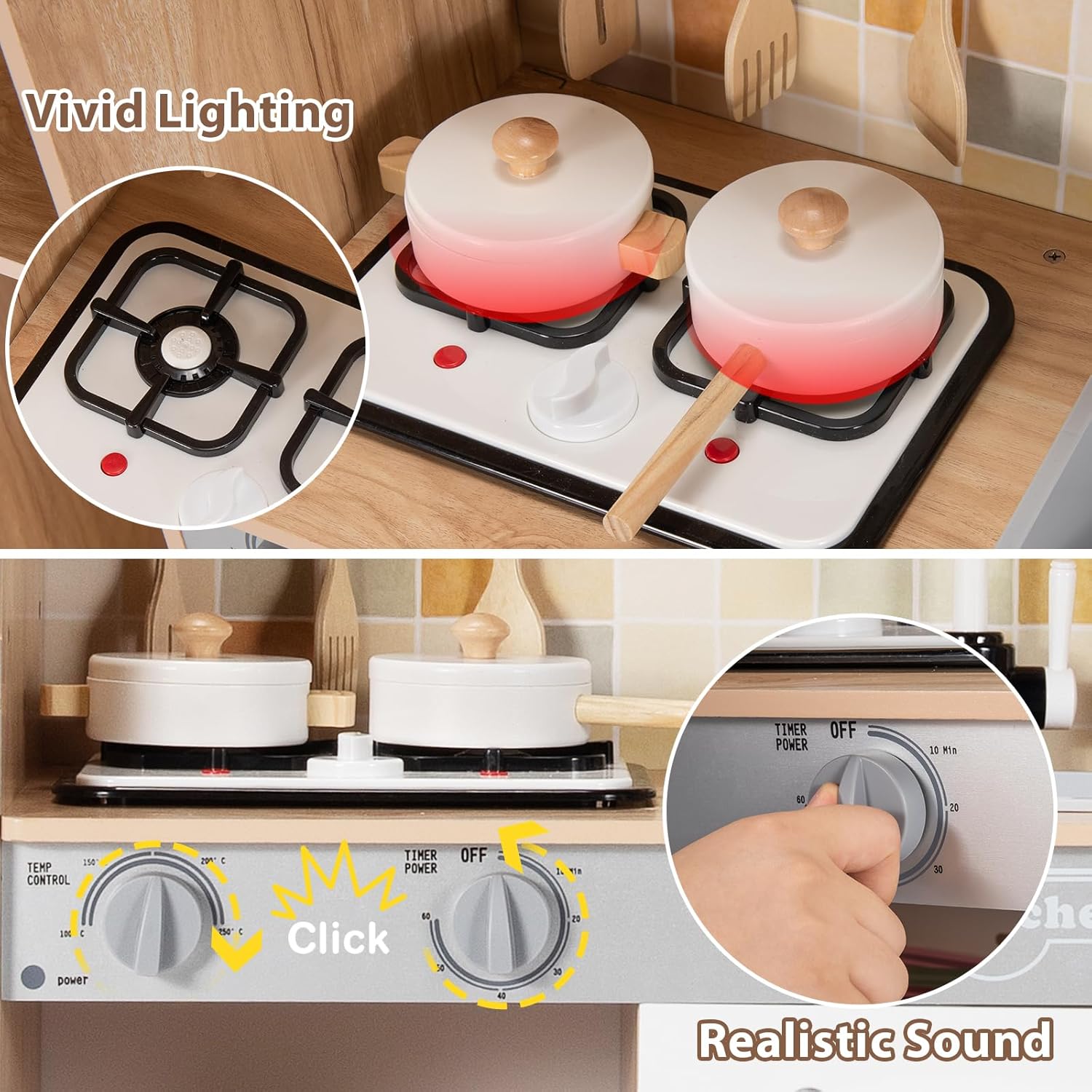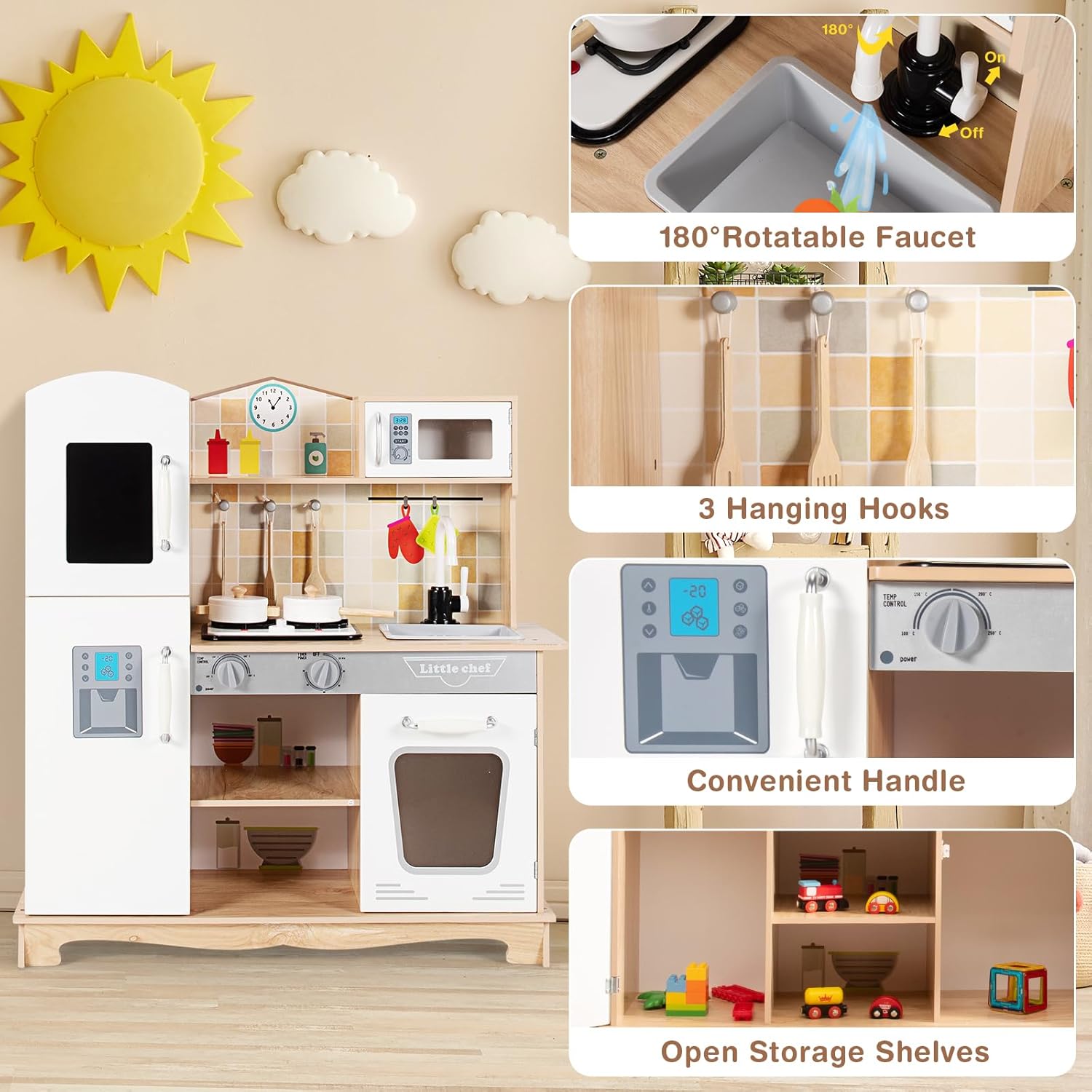 ACCESSORI RICCHI: Questa cucina giocattolo per bambini è dotata di diversi accessori, tra cui 2 pentole carine per simulare diverse situazioni di cottura e 3 pratici mestoli perfetti per mescolare e servire i "piatti" SICUREZZA E STABILITÀ: La struttura di questa cucina legno per bambini è stata progettata con cura per garantire una buona stabilità, riducendo il rischio di ribaltamenti durante il gioco. Gli angoli sono arrotondati e privi di tagli. Inoltre, i materiali utilizzati sono ecologici e privi di sostanze nocive, rispettando gli standard di sicurezza per consentire ai genitori di lasciare i bambini giocare in tranquillità DESIGN CON LUCI E SUONI: Questa cucina per bambini presenta luci e suoni. Accendendo il "fornello", si attiva una luce soffusa che simula realisticamente le fiamme e si sentono suoni realistici quando si gira la manopola, offrendo un'esperienza interattiva coinvolgente ESPERIENZA DI CUCINA REALISTICA: Le dimensioni di questa cucinetta per bambini sono progettate per adattarsi alla taglia e alle abitudini di gioco dei bambini, ricreando fedelmente un'esperienza di cucina realistica. Dall'aspetto generale alla distribuzione delle funzioni, tutto è pensato per far sentire ai bambini di avere uno spazio cucina personalizzato APPRENDIMENTO ATTRAVERSO IL GIOCO: Questo giocattolo da cucina, progettato appositamente per bambini dai 3 ai 7 anni, consente ai bambini di imparare abilità di vita mentre si divertono giocando. Durante la simulazione del processo di cottura, i bambini impareranno a riconoscere l'uso di diversi utensili da cucina, allenare le abilità manuali e la coordinazione occhio-mano. Allo stesso tempo, i bambini potranno sviluppare pazienza, concentrazione e capacità di risolvere problemi attraverso il gioco