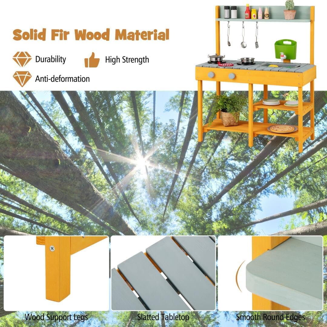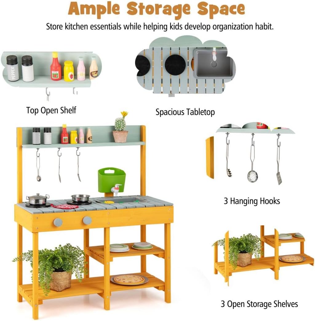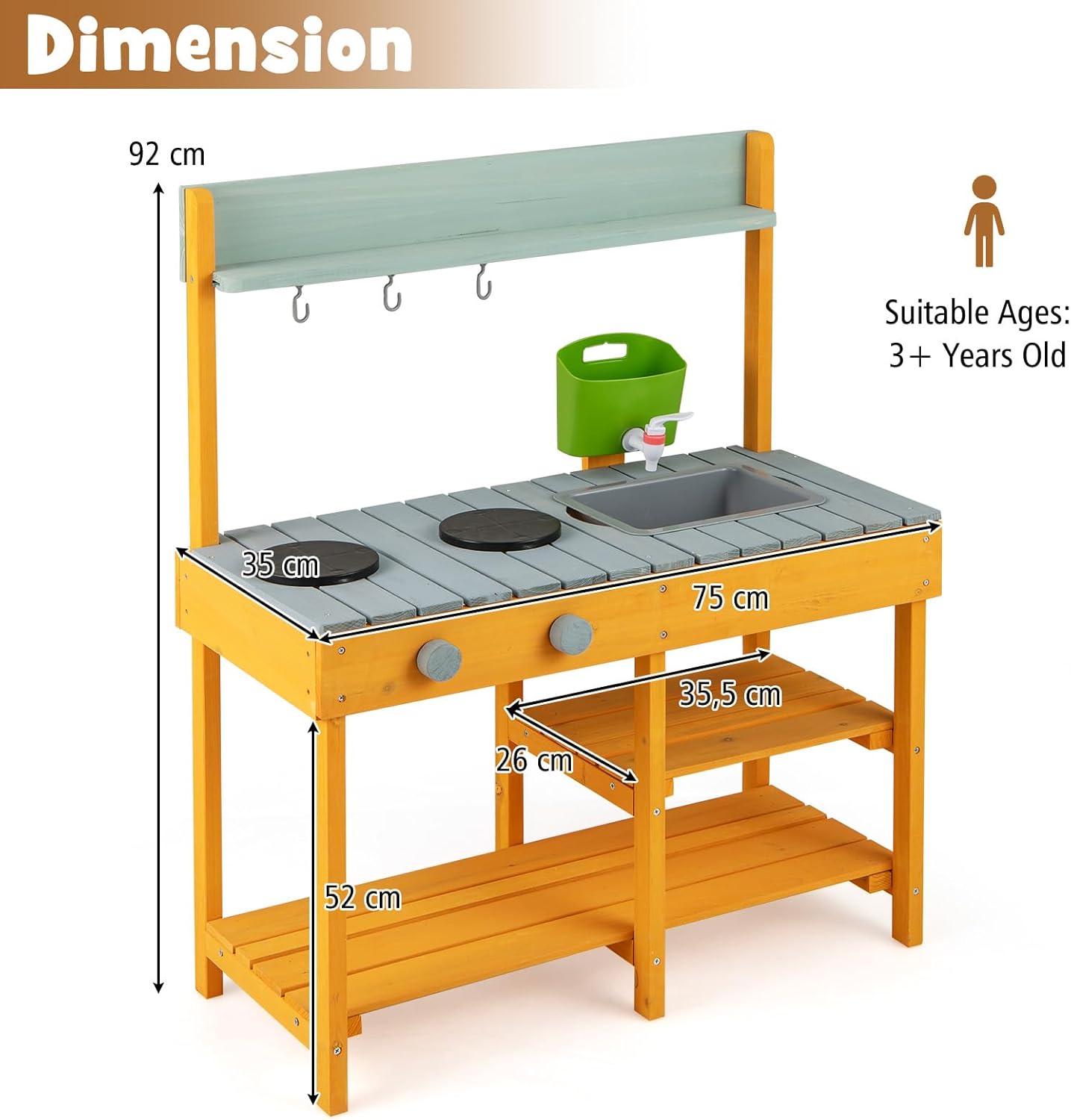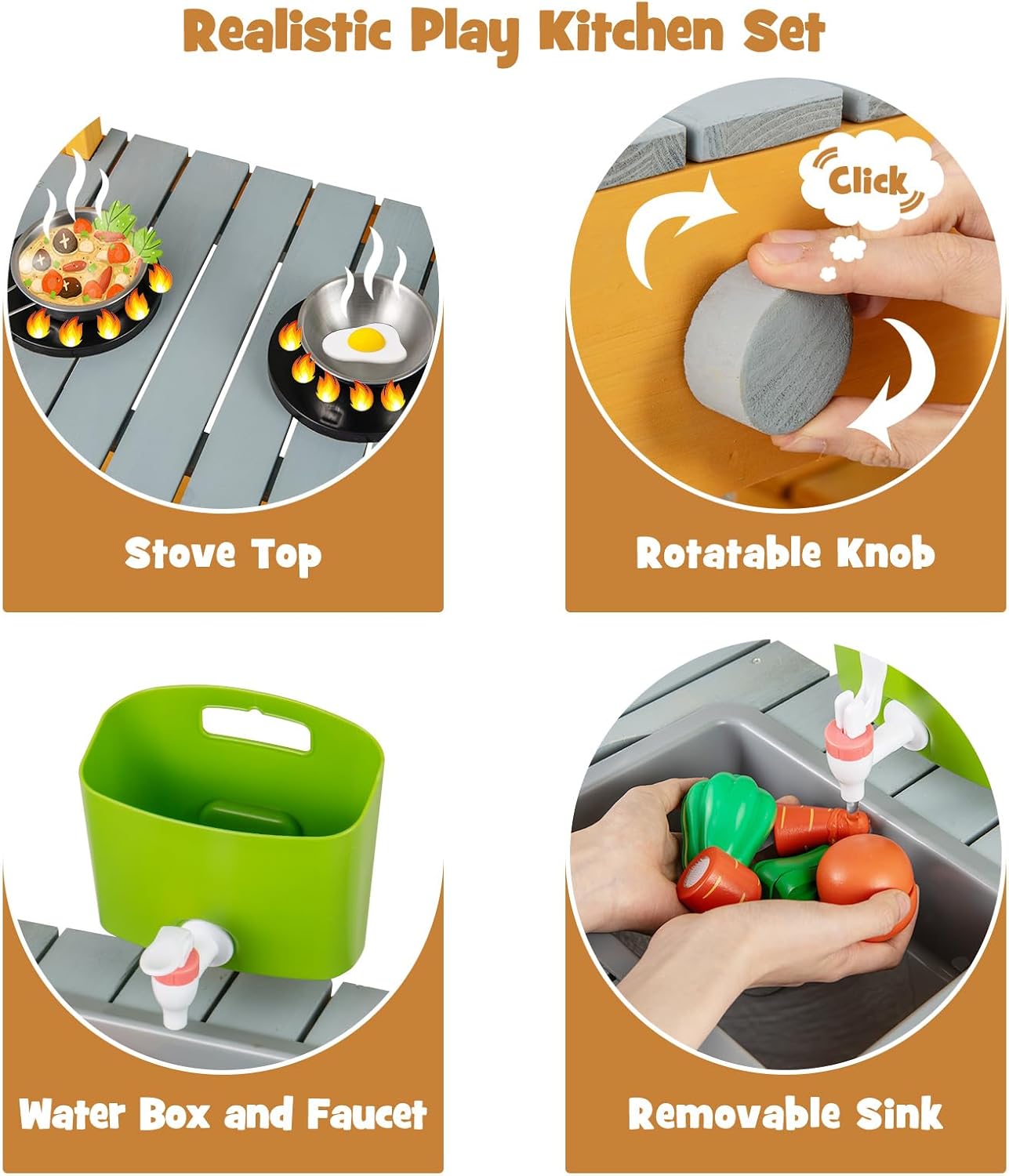 ESPERIENZA DI CUCINA REALISTICA: Questa cucina per bambini in legno introduce i bambini nel mondo della cucina con apparecchi realistici. I due fuochi in plastica con manopole in legno meccaniche producono un suono nitido di "clic" ad ogni giro, come se fossero in una vera cucina, e il piano di lavoro di 75x35 cm con un'altezza di 51 cm è facile da usare per i bambini DESIGN DIVERTENTE CON ACQUA CORRENTE: La cucinetta per bambini è dotata di un serbatoio d'acqua e di un rubinetto, in modo che i bambini possano riempire il serbatoio con le mani e poi aprire il rubinetto per godersi il suono rilassante dell'acqua che scorre. Il lavandino è spazioso e rimovibile, consentendo di lavare facilmente verdure giocattolo o fango. Al contempo, questo design allena le abilità pratiche e le competenze di vita dei bambini COSTRUZIONE IN LEGNO MASSICCIO SICURA E DUREVOLE: La cucina giocattolo per bambini è realizzata in robusto e resistente legno di cedro con PP e ABS per creare una cucina bambina bella e pratica. Le quattro gambe solide sostengono l'intera cucina e non sono facili da far sbilanciare, mentre gli angoli arrotondati evitano il rischio di collisioni durante il gioco SPAZIO DI ARCHIVIAZIONE MULTIFUNZIONALE: La cucina legno bambini ha un ripiano aperto incorporato, un ampio piano di lavoro, tre ganci e tre ripiani aperti che offrono ai bambini abbondante spazio di archiviazione e area di esposizione. I bambini possono tenere ordinati e puliti i loro giocattoli e utensili da cucina, in modo da potervi facilmente accedere e sviluppare buone abitudini organizzative SVILUPPO DELLE CAPACITÀ: In questa cucina da giardino, i bambini possono imitare gli adulti mentre cucinano e invitare gli amici per condividere insieme la gioia del cibo, sviluppando così la creatività, le abilità sociali e le capacità di comunicazione.