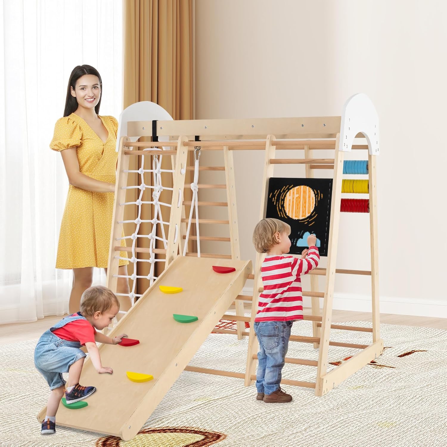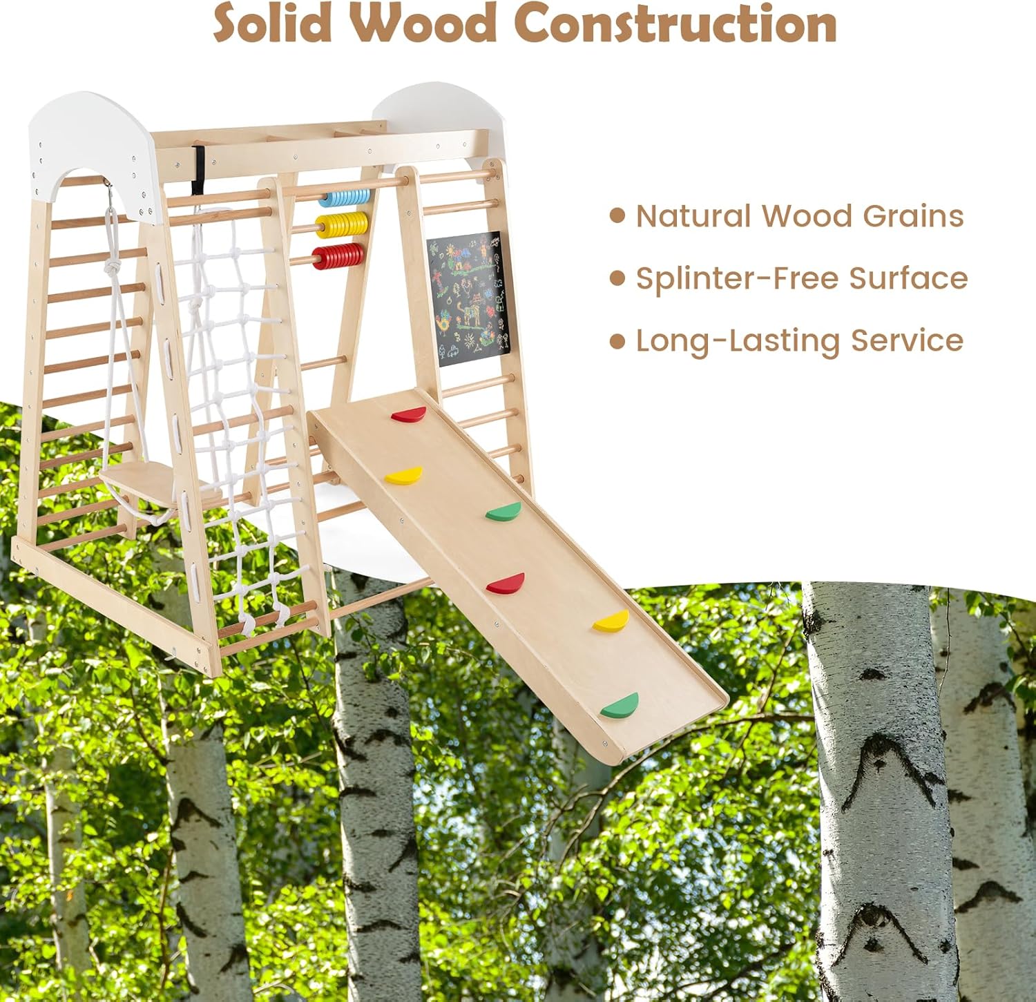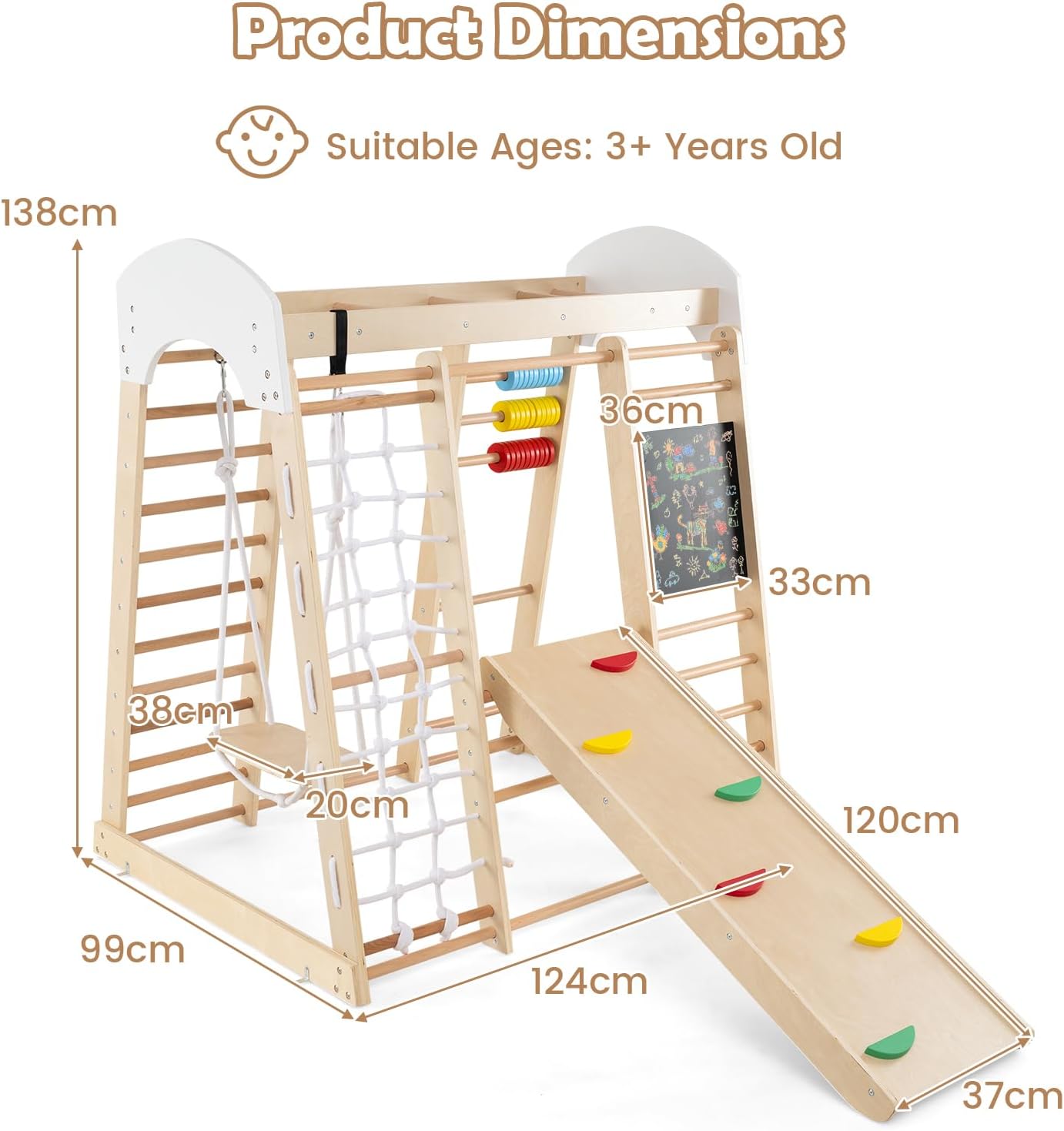 PARCO GIOCHI 7 IN 1 TUTTO-IN-UNO: La struttura da arrampicata combina altalena, parete da arrampicata, scala, rete da arrampicata, abaco, lavagna e gioco delle perle in un mini parco avventura per il vostro bambino. Con dimensioni di 124 x 99 x 138 cm, c'è abbondante spazio per soddisfare le varie esigenze dei bambini dai 3 anni in su durante l'arrampicata, il gattonare, lo scivolare, il calcolo e il disegno, in modo che il divertimento della crescita non abbia limiti ESTETICA NATURALE E SICUREZZA: Il giocattolo da arrampicata è realizzato in legno di betulla e faggio, con una struttura solida e una capacità di carico di 50 kg. La base in legno originale è decorata con steli rossi, gialli, blu, verdi e viola dai colori vivaci, che insieme alla superficie finemente levigata e liscia non solo sono belli, ma garantiscono anche la sicurezza e permettono ai bambini di giocare liberamente con colori naturali DETTAGLI PER FORZA FISICA E INTELLETTUALE: Il triangolo da arrampicata dispone di un piano scala con sassi da arrampicata incorporati, sui quali i bambini possono scalare per allenare la forza delle braccia. È inoltre dotato di una lavagna e perle di conto tricolori per promuovere lo sviluppo delle capacità di disegno e conteggio dei bambini, offrendo una stimolazione intellettuale ed un divertimento STRUTTURA TRIANGOLARE STABILE: Il parco giochi per bambini utilizza la classica costruzione meccanica triangolare per garantire che l'intera struttura sia stabile e non traballi. Il cordino laterale dell'altalena è lungo 110 cm e ha un diametro di 7 mm, con una capacità di carico individuale di 25 kg, garantendo un alto coefficiente di sicurezza e fornendo al vostro bambino il supporto più solido MONTAGGIO E PULIZIA FACILI: Le attrezzature da arrampicata sono fornite in 2 pacchetti con un'ampia guida all'assemblaggio e sono facili e veloci da montare. La superficie impermeabile è liscia e facile da pulire. Dal soggiorno alla camera dei bambini, create uno spazio sicuro e divertente per il vostro bambino, in modo che possa crescere in un ambiente sicuro e divertente in qualsiasi momento e ovunque