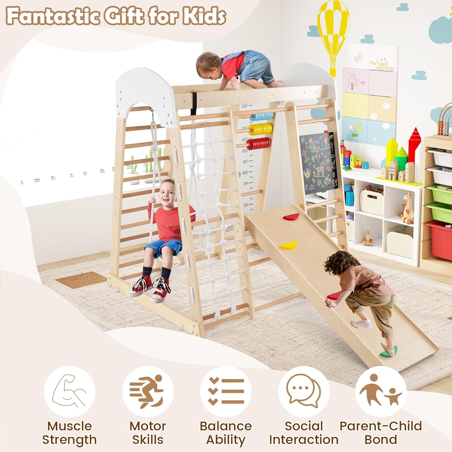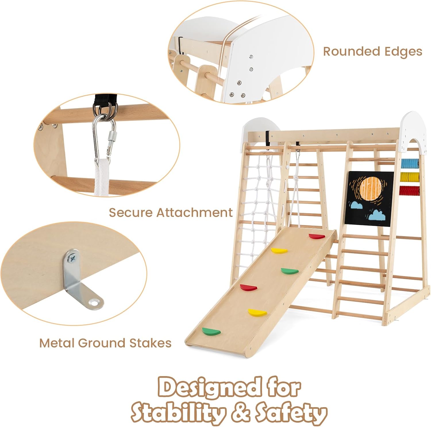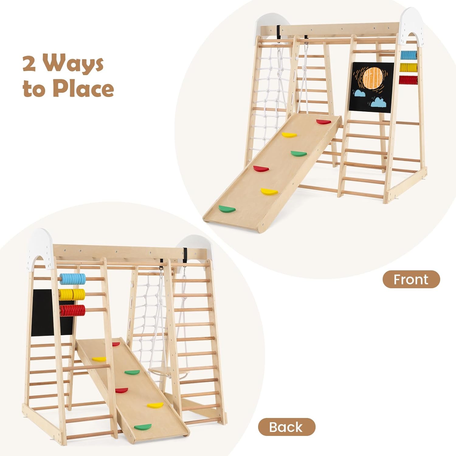 PARCO GIOCHI 7 IN 1 TUTTO-IN-UNO: La struttura da arrampicata combina altalena, parete da arrampicata, scala, rete da arrampicata, abaco, lavagna e gioco delle perle in un mini parco avventura per il vostro bambino. Con dimensioni di 124 x 99 x 138 cm, c'è abbondante spazio per soddisfare le varie esigenze dei bambini dai 3 anni in su durante l'arrampicata, il gattonare, lo scivolare, il calcolo e il disegno, in modo che il divertimento della crescita non abbia limiti ESTETICA NATURALE E SICUREZZA: Il giocattolo da arrampicata è realizzato in legno di betulla e faggio, con una struttura solida e una capacità di carico di 50 kg. La base in legno originale è decorata con steli rossi, gialli, blu, verdi e viola dai colori vivaci, che insieme alla superficie finemente levigata e liscia non solo sono belli, ma garantiscono anche la sicurezza e permettono ai bambini di giocare liberamente con colori naturali DETTAGLI PER FORZA FISICA E INTELLETTUALE: Il triangolo da arrampicata dispone di un piano scala con sassi da arrampicata incorporati, sui quali i bambini possono scalare per allenare la forza delle braccia. È inoltre dotato di una lavagna e perle di conto tricolori per promuovere lo sviluppo delle capacità di disegno e conteggio dei bambini, offrendo una stimolazione intellettuale ed un divertimento STRUTTURA TRIANGOLARE STABILE: Il parco giochi per bambini utilizza la classica costruzione meccanica triangolare per garantire che l'intera struttura sia stabile e non traballi. Il cordino laterale dell'altalena è lungo 110 cm e ha un diametro di 7 mm, con una capacità di carico individuale di 25 kg, garantendo un alto coefficiente di sicurezza e fornendo al vostro bambino il supporto più solido MONTAGGIO E PULIZIA FACILI: Le attrezzature da arrampicata sono fornite in 2 pacchetti con un'ampia guida all'assemblaggio e sono facili e veloci da montare. La superficie impermeabile è liscia e facile da pulire. Dal soggiorno alla camera dei bambini, create uno spazio sicuro e divertente per il vostro bambino, in modo che possa crescere in un ambiente sicuro e divertente in qualsiasi momento e ovunque
