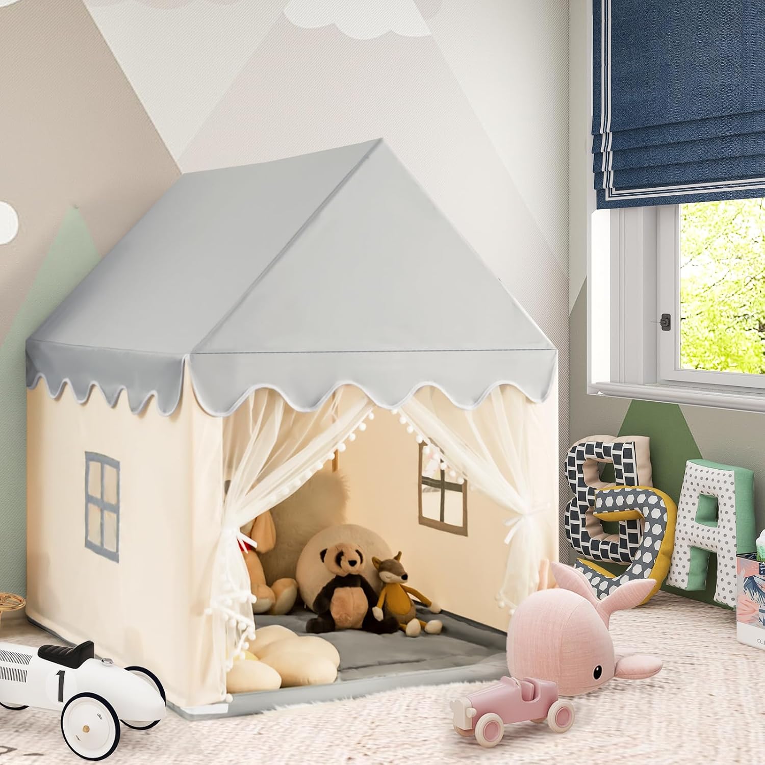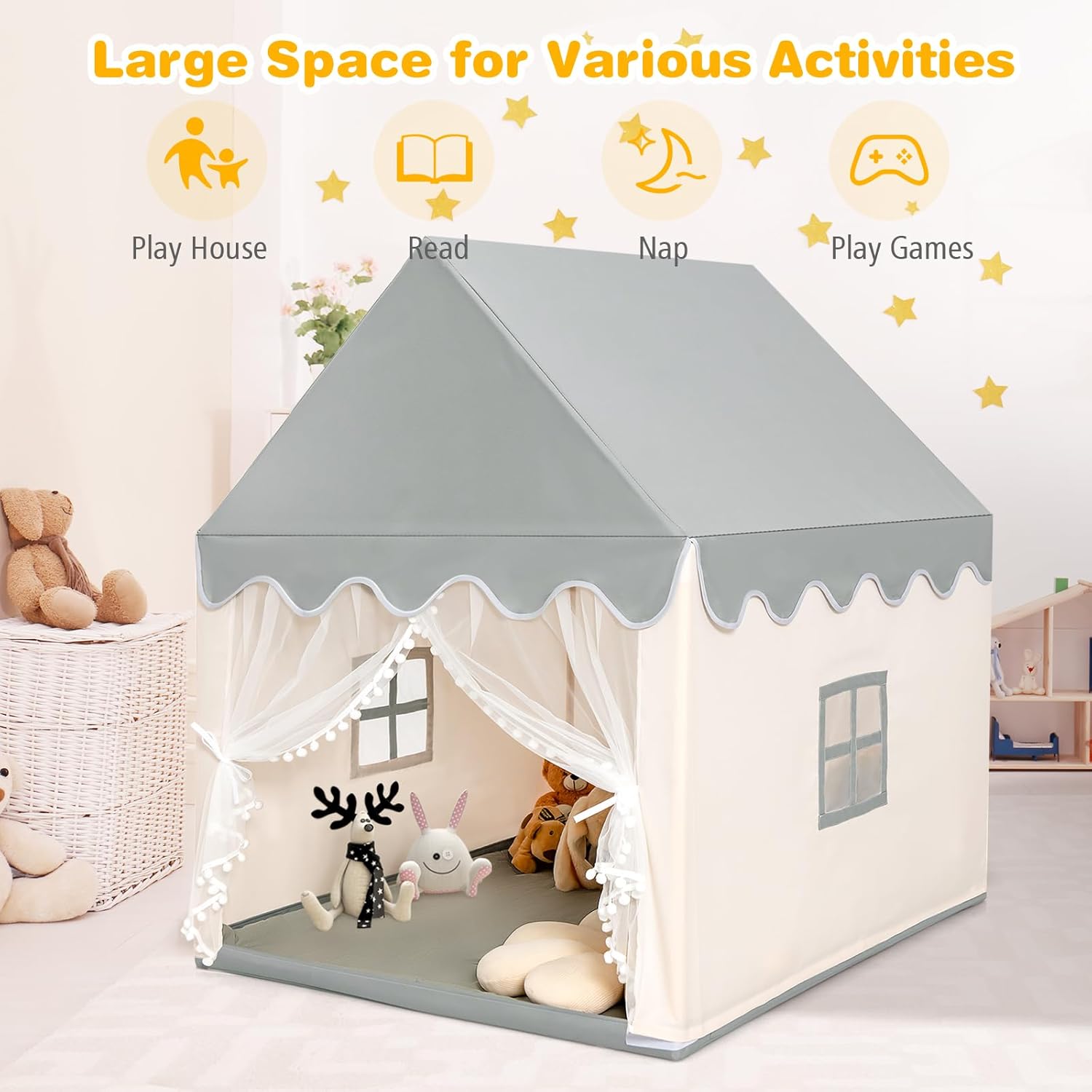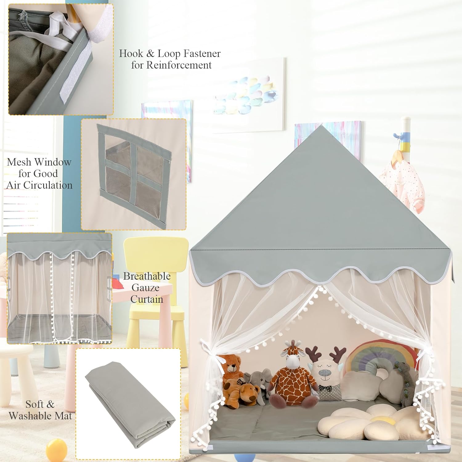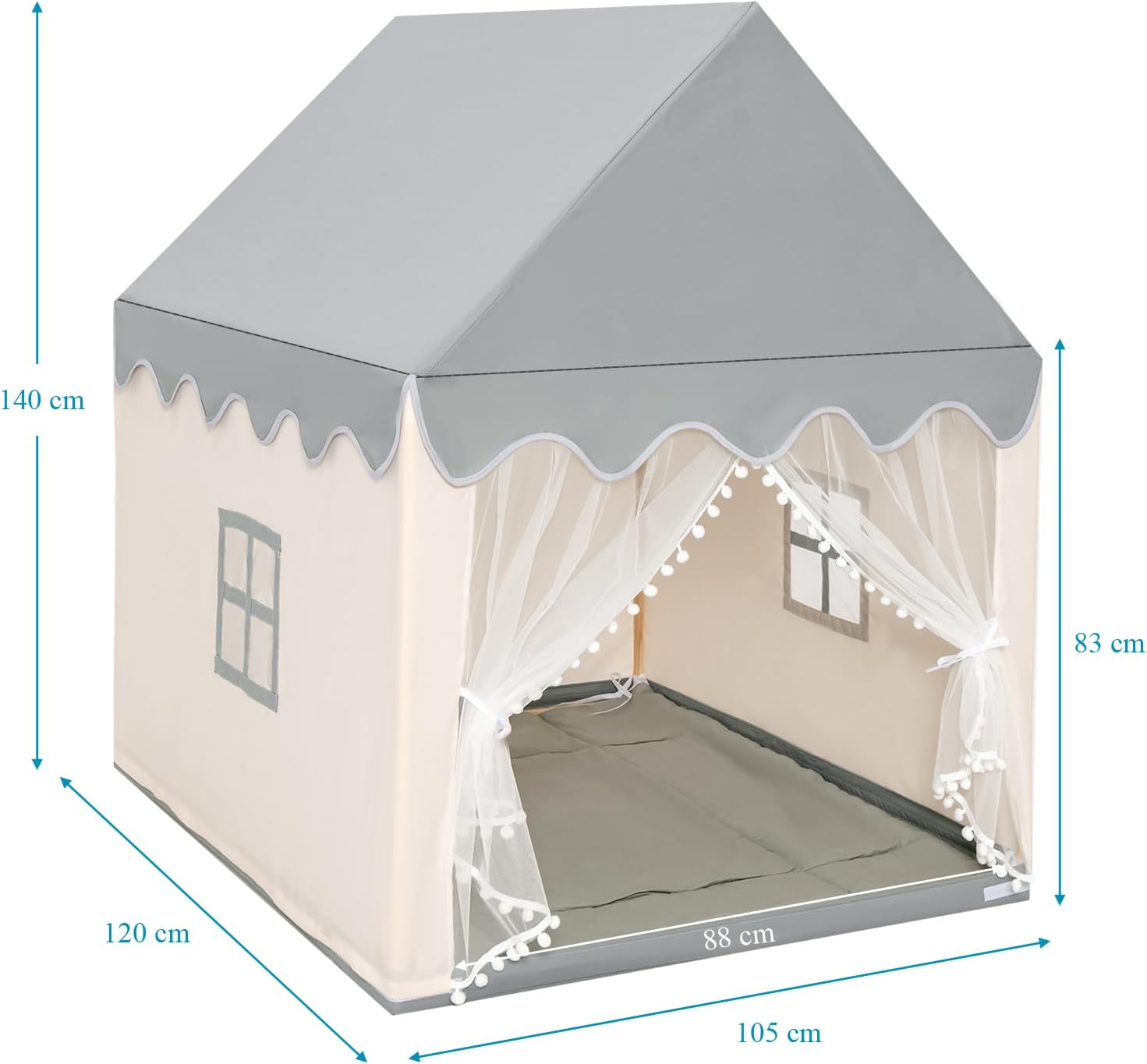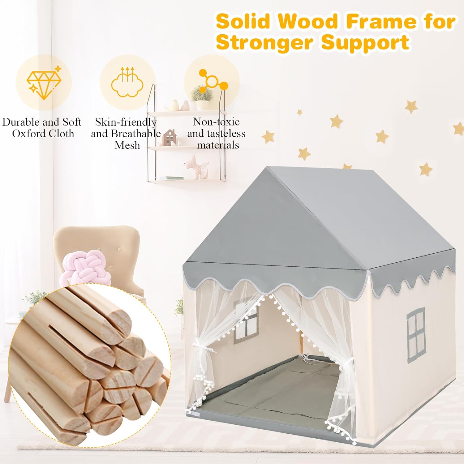 CORNICE IN LEGNO STABILE E DUREVOLE: Questa casetta per bambini è realizzata con una cornice in legno di pino per garantire una grande stabilità e offrire uno spazio di gioco solido e sicuro per i bambini. Rispetto alle tende da campeggio tradizionali, questa tenda per bambini ha un supporto più resistente per mantenere la sua forma stabile, rendendola più sicura e senza preoccupazioni per far giocare i bambini al suo interno SPAZIOSO E COMODO: La tenda gioco bambini è progettata con una dimensione moderata, sufficiente per permettere a 3-4 bambini di muoversi liberamente. I spessi tappeti di cotone e il tessuto Oxford non tossico offrono ai bambini un tocco confortevole e creano un angolo accogliente e caldo dove giocare liberamente DESIGN TRASPIRANTE E VENTILATO: La tenda bambini cameretta è dotata di 2 finestre traspiranti e 1 tenda in rete per garantire una buona circolazione dell'aria. Le tende possono essere separate e appese ai lati per mantenere la porta aperta per un accesso rapido, offrendo ai bambini aria fresca e privacy allo stesso tempo SPAZIO DI GIOCO MULTIFUNZIONALE: Non solo adatta per le famiglie, questa tenda da gioco per bambini è adatta anche per asili, parchi giochi e molto altro ancora. Offre un ambiente confortevole per diverse attività come leggere, giocare a scacchi, dormire, promuovere le abilità sociali e lo sviluppo intellettuale dei bambini, creando uno spazio di gioco rilassante e piacevole per loro DESIGN DAL BELLO ASPETTO: Le capanne per bambini da interno hanno un design elegante e incantevole che può catturare facilmente l'attenzione dei bambini. Facile e veloce da montare, impiega solo circa 10 minuti, quindi i bambini possono subito godere del divertimento di questo squisito spazio di gioco