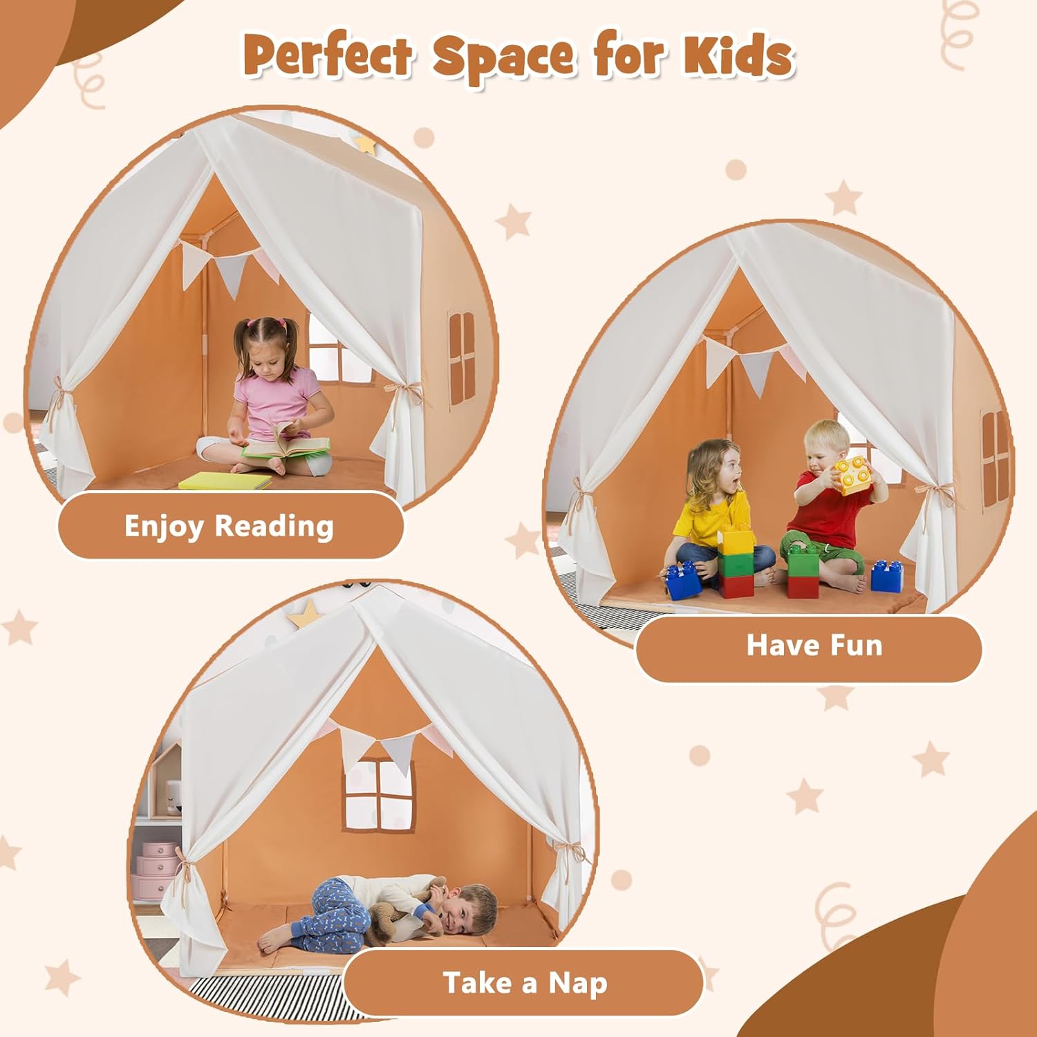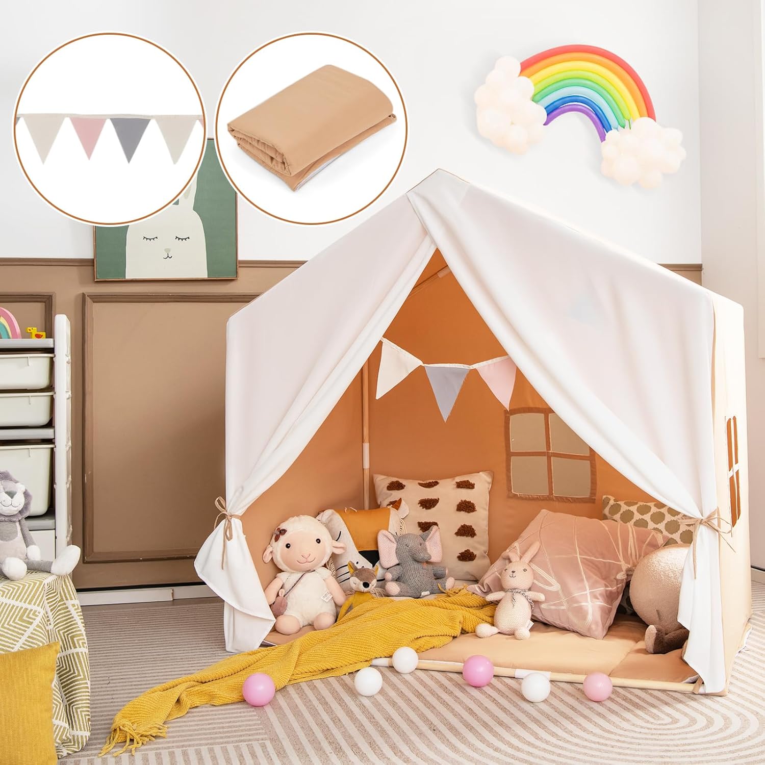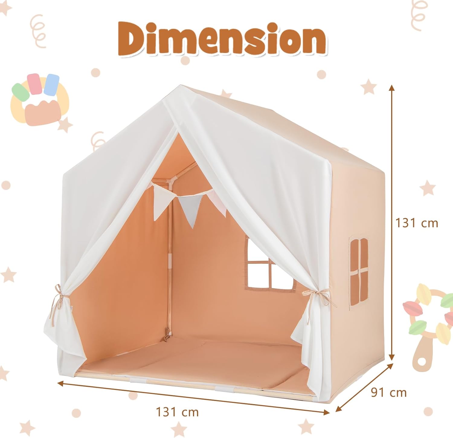 SPAZIOSO & ACCOGLIENTE PER MOMENTI DIVERTENTI: Con una generosa area di 131 x 91 x 131 cm, questa tenda per bambini crea un'esclusiva piccola mondo solo per i bambini. Può ospitare fino a 3 bambini per feste divertenti e interazioni genitore-bambino. I colori caldi Marrone Chiaro e Rosa rendono l'interno della tenda luminoso e accogliente, rendendolo un luogo ideale per i bambini per leggere, giocare e riposare MATERIALE SICURO & LAVABILE, AMICO DELLA PELLE: La casa da gioco è realizzata in tessuto di poliestere-cotone, morbido e amico della pelle. Anche il cuscino è realizzato in tessuto di alta qualità e cotone, morbido e lavabile, per mantenere pulito e igienico l'interno della tenda bambini cameretta AMBIENTE DA SOGNO: La tenda da gioco è dotata di finestre su entrambi i lati, tende e bandiere colorate che garantisco una buona ventilazione e illuminazione, ma creano anche un'atmosfera romantica e sognante. Inoltre, l'ingresso della capanna per bambini da interno è spazioso, consentendo ad adulti e bambini di entrare e uscire comodamente STRUTTURA STABILE & SICURA: La casa per bambini è realizzata in legno massello di pino naturale, che è resistente e durevole. Le connessioni in plastica rendono la struttura della tenda più stabile e meno soggetta a crolli. Che i bambini giochino nella tenda o facciano un pisolino, possono godere di un ambiente sicuro e stabile FACILE DA MONTARE, FACILE DA TRASPORTARE: La struttura della tenda gioco bambini è semplice e chiara e viene fornita con istruzioni dettagliate, quindi può essere rapidamente montata senza l'uso di attrezzi. È anche facile da smontare e la tenda è leggera e semplice da trasportare una volta smontata, pesa solo 3,5 kg. Il tappetino da gioco può essere piegato e riposto in modo salvaspazio