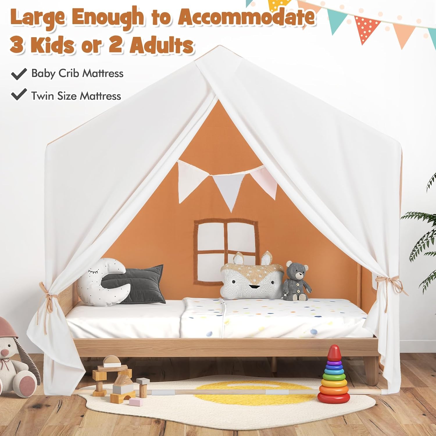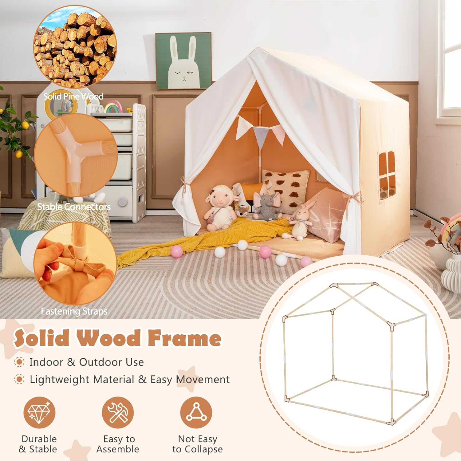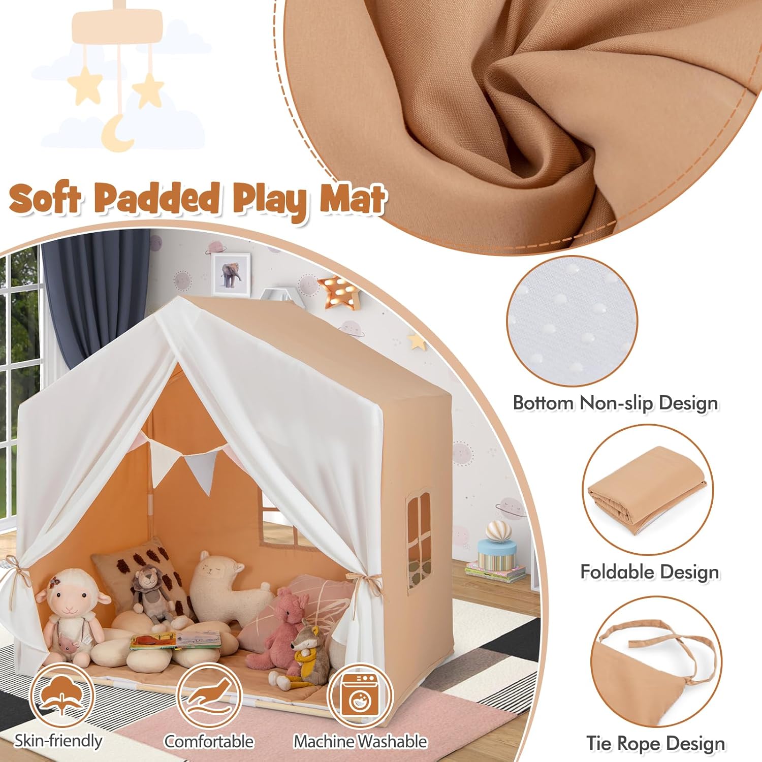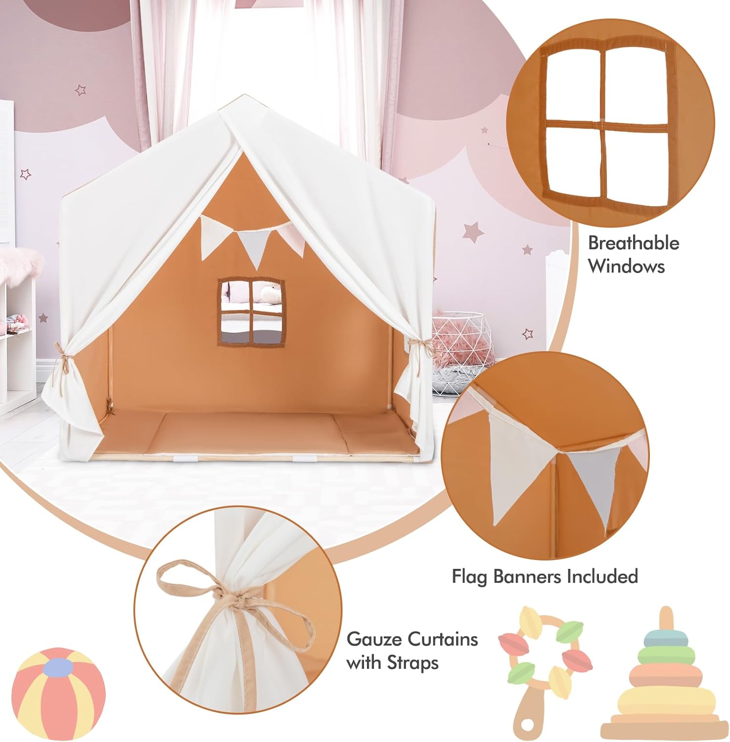 SPAZIOSO & ACCOGLIENTE PER MOMENTI DIVERTENTI: Con una generosa area di 131 x 91 x 131 cm, questa tenda per bambini crea un'esclusiva piccola mondo solo per i bambini. Può ospitare fino a 3 bambini per feste divertenti e interazioni genitore-bambino. I colori caldi Marrone Chiaro e Rosa rendono l'interno della tenda luminoso e accogliente, rendendolo un luogo ideale per i bambini per leggere, giocare e riposare MATERIALE SICURO & LAVABILE, AMICO DELLA PELLE: La casa da gioco è realizzata in tessuto di poliestere-cotone, morbido e amico della pelle. Anche il cuscino è realizzato in tessuto di alta qualità e cotone, morbido e lavabile, per mantenere pulito e igienico l'interno della tenda bambini cameretta AMBIENTE DA SOGNO: La tenda da gioco è dotata di finestre su entrambi i lati, tende e bandiere colorate che garantisco una buona ventilazione e illuminazione, ma creano anche un'atmosfera romantica e sognante. Inoltre, l'ingresso della capanna per bambini da interno è spazioso, consentendo ad adulti e bambini di entrare e uscire comodamente STRUTTURA STABILE & SICURA: La casa per bambini è realizzata in legno massello di pino naturale, che è resistente e durevole. Le connessioni in plastica rendono la struttura della tenda più stabile e meno soggetta a crolli. Che i bambini giochino nella tenda o facciano un pisolino, possono godere di un ambiente sicuro e stabile FACILE DA MONTARE, FACILE DA TRASPORTARE: La struttura della tenda gioco bambini è semplice e chiara e viene fornita con istruzioni dettagliate, quindi può essere rapidamente montata senza l'uso di attrezzi. È anche facile da smontare e la tenda è leggera e semplice da trasportare una volta smontata, pesa solo 3,5 kg. Il tappetino da gioco può essere piegato e riposto in modo salvaspazio