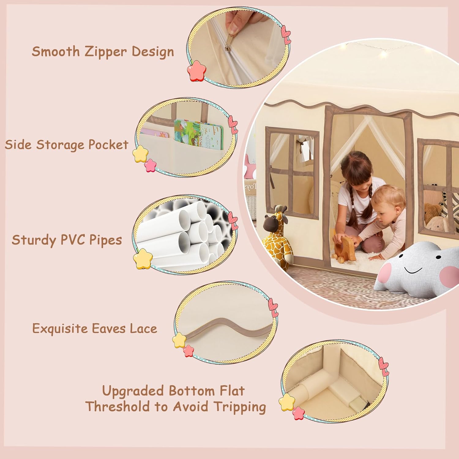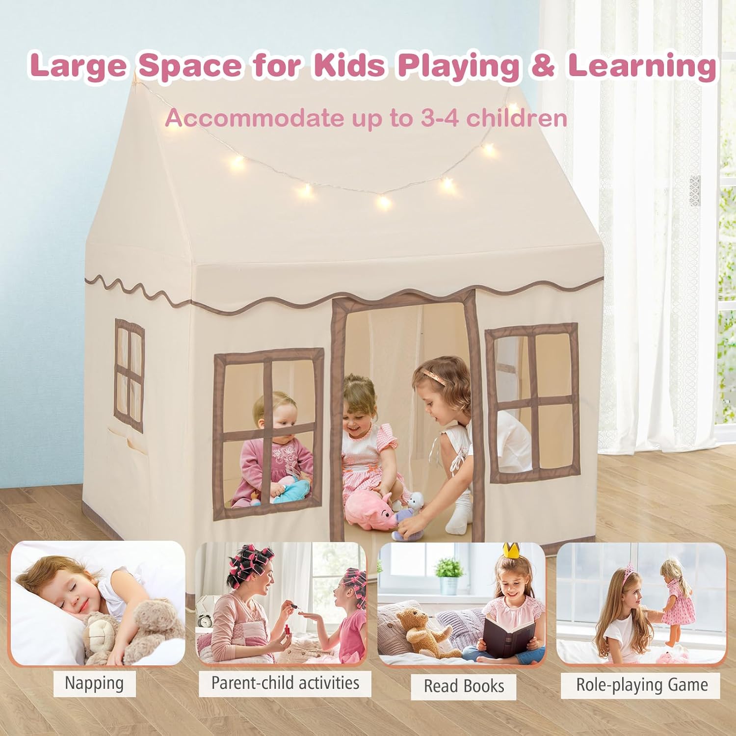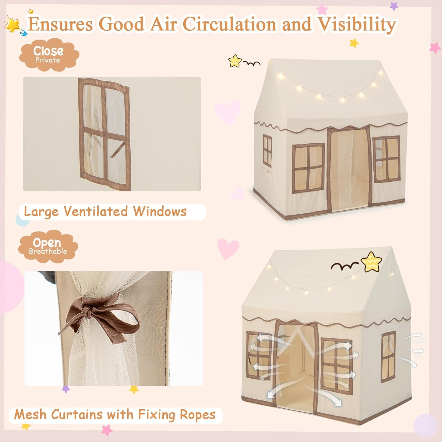 LOOK UNICO E ADORABILE: La tenda per bambini è disegnata in forma di casa incantevole e viene fornita con lucine gialle a forma di stella e morbide stuoie sul pavimento. La tenda da gioco ha 2 finestre e una porta accessibile, in modo che i bambini possano godersi la loro privacy ACCESSORI COMODI E PRATICI: Le finestre e le porte della tenda gioco bambina sono dotate di cordini per fissarle e hanno tasche laterali per riporre facilmente giocattoli e libri. La tenda per bambini è dotata di tendine in mesh traspirante per consentire il passaggio dell'aria e far sentire i bambini al caldo e a loro agio COSTRUZIONE SICURA E STABILE: Il telaio principale realizzato in PVC di alta qualità garantisce la stabilità e la durata della capanna per bambini da interno, offrendo ai bambini un posto sicuro dove giocare. Il tessuto esterno è delicato sulla pelle e morbido per maggior comfort SPAZIOSITÀ: La casa per bambini, delle dimensioni di 121 x 101 x 137 cm, offre spazio per 3-4 bambini o 2 adulti contemporaneamente, offrendo molto spazio ai bambini per giocare e riposare in vari modi REGALO PER I BAMBINI: La tenda da gioco per bambini è uno spazio meraviglioso per giocare e rilassarsi. È molto facile da montare e pulire, adatto ai bambini di età superiore ai 3 anni