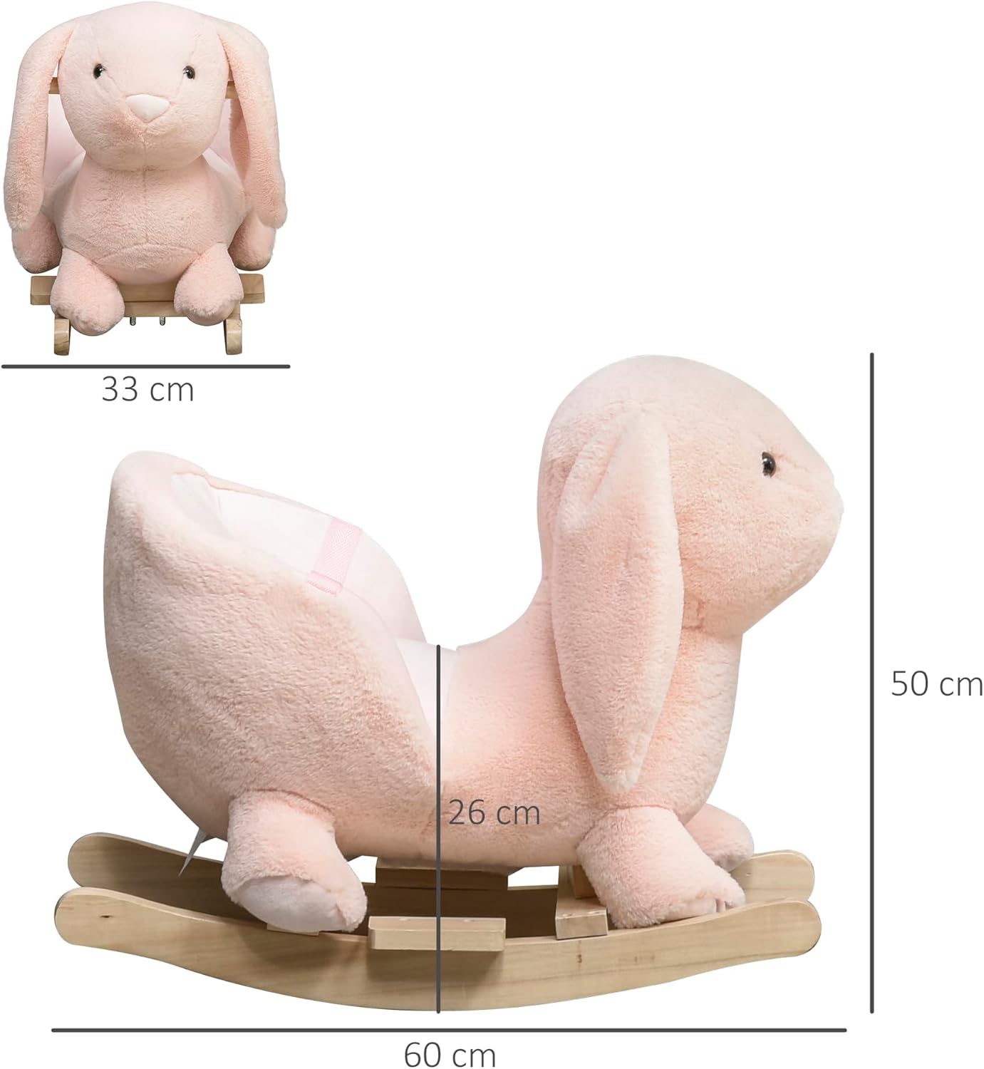 UN DOLCISSIMO CONIGLIO: Con questo cavallo a dondolo a forma di coniglio il divertimento è assicurato, premendo il pulsante sull'orecchio riproduce suoni realistici. MORBIDISSIMO: Rivestito in morbido peluche su cui accomodarsi e dondolarsi. LEGGERO E DUREVOLE: Il dondolo per bambini ha una solida base in legno che sostiene fino a 40kg. SICURO: Questo cavallo a dondolo per bambini è dotato di impugnature, cintura di sicurezza e un alto schienale per tenere i tuoi bimbi al sicuro. DIMENSIONI: Dimensioni generali: 60L x 33P x 50Acm. Altezza seduta: 28cm. Età consigliata: 18-36 mesi. Capacità di carico: 40kg.