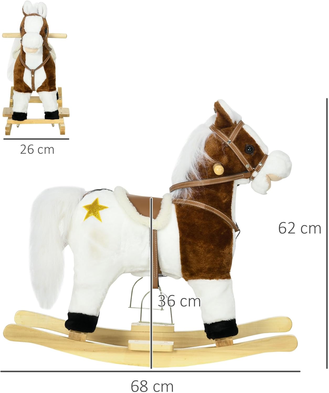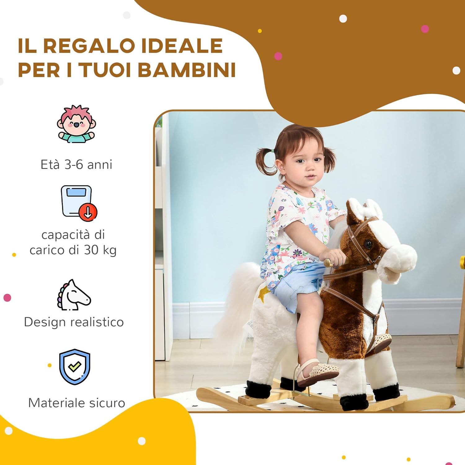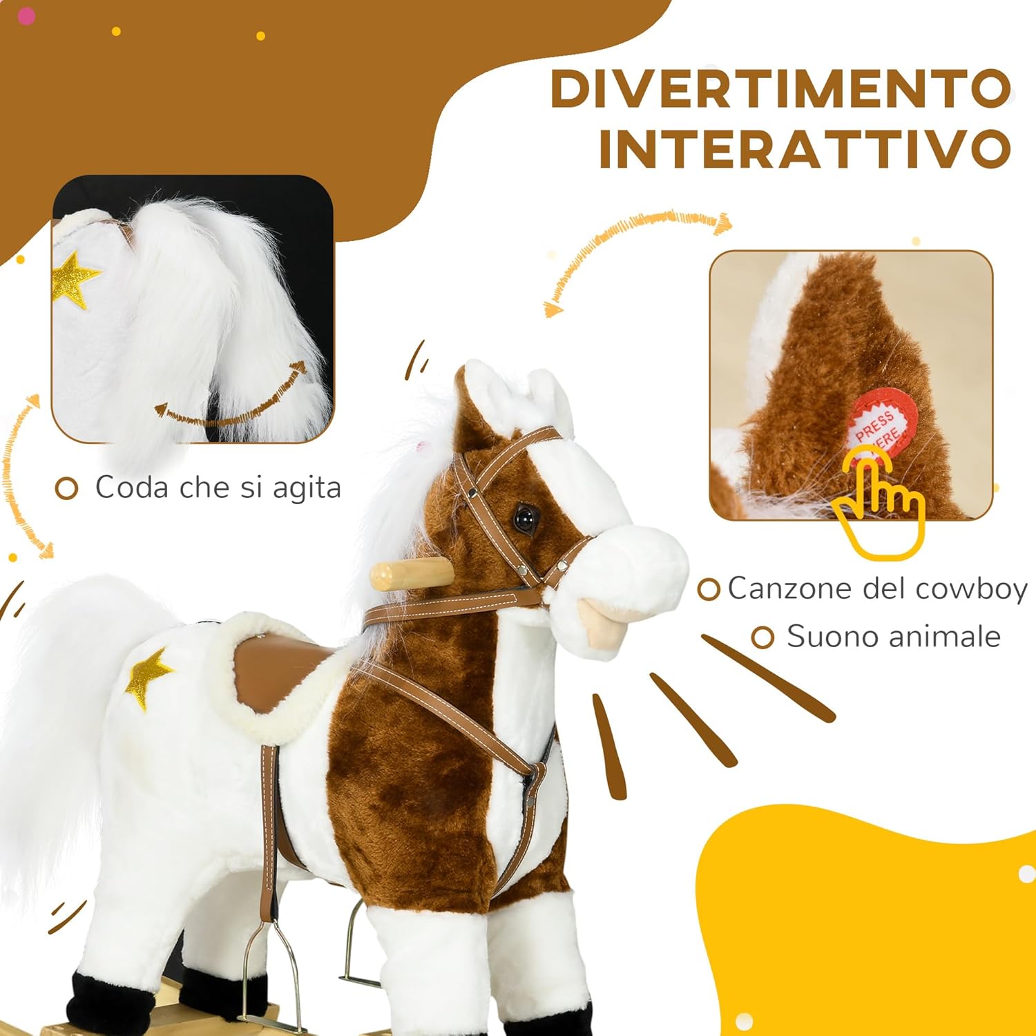 ESPERIENZA REALISTICA: Il battito degli zoccoli e il nitrito di questo cavallo a dondolo aggiungono un tocco divertente al gioco. È inoltre integrata anche una canzone da cowboy che fa muovere la coda a ritmo di musica per divertire ancora di più i i tuoi bimbi SEDUTA CONFORTEVOLE: Il corpo in morbido peluche, la sella separata e i pratici poggiapiedi del cavallino a dondolo garantiscono un'esperienza di gioco confortevole COSTRUZIONE ROBUSTA: Realizzato con una struttura in metallo e una base in legno, questo cavalluccio a dondolo è progettato per durare a lungo FACILE DA SPOSTARE: Il cavallo a dondolo può essere spostato senza problemi in ogni stanza, per lasciare liberi i bambini di vivere le avventure in tutta casa DIMENSIONI: Dimensioni complessive: 68L x 26P x 62A cm. Capacità di peso: 30 kg. Montaggio richiesto