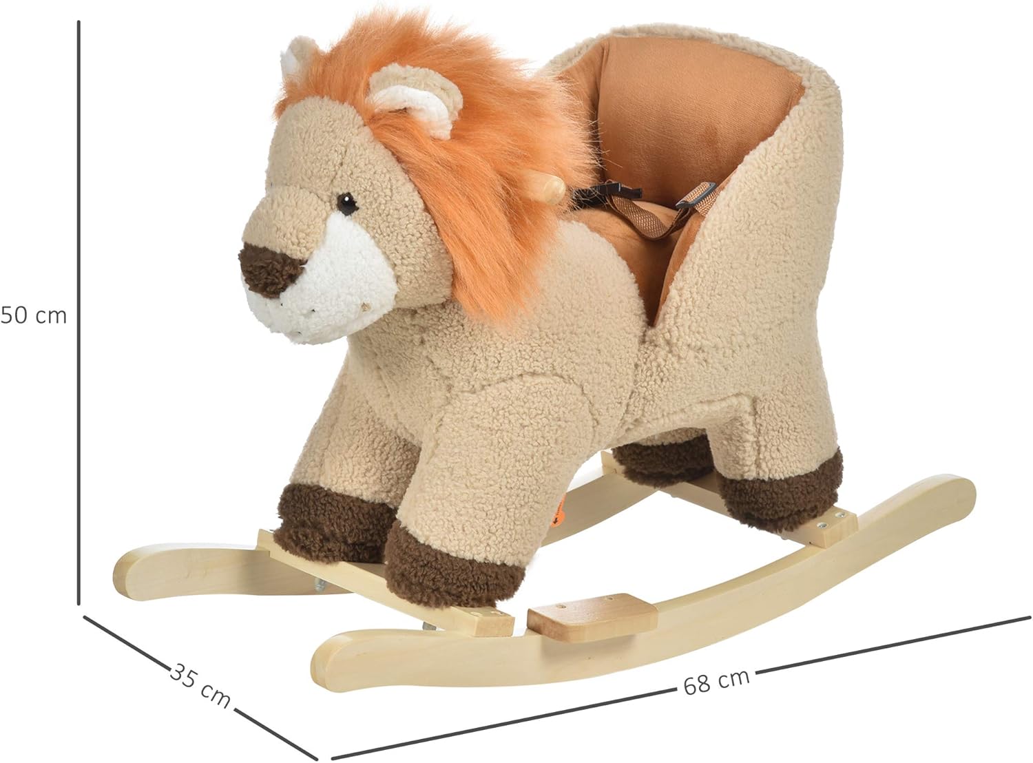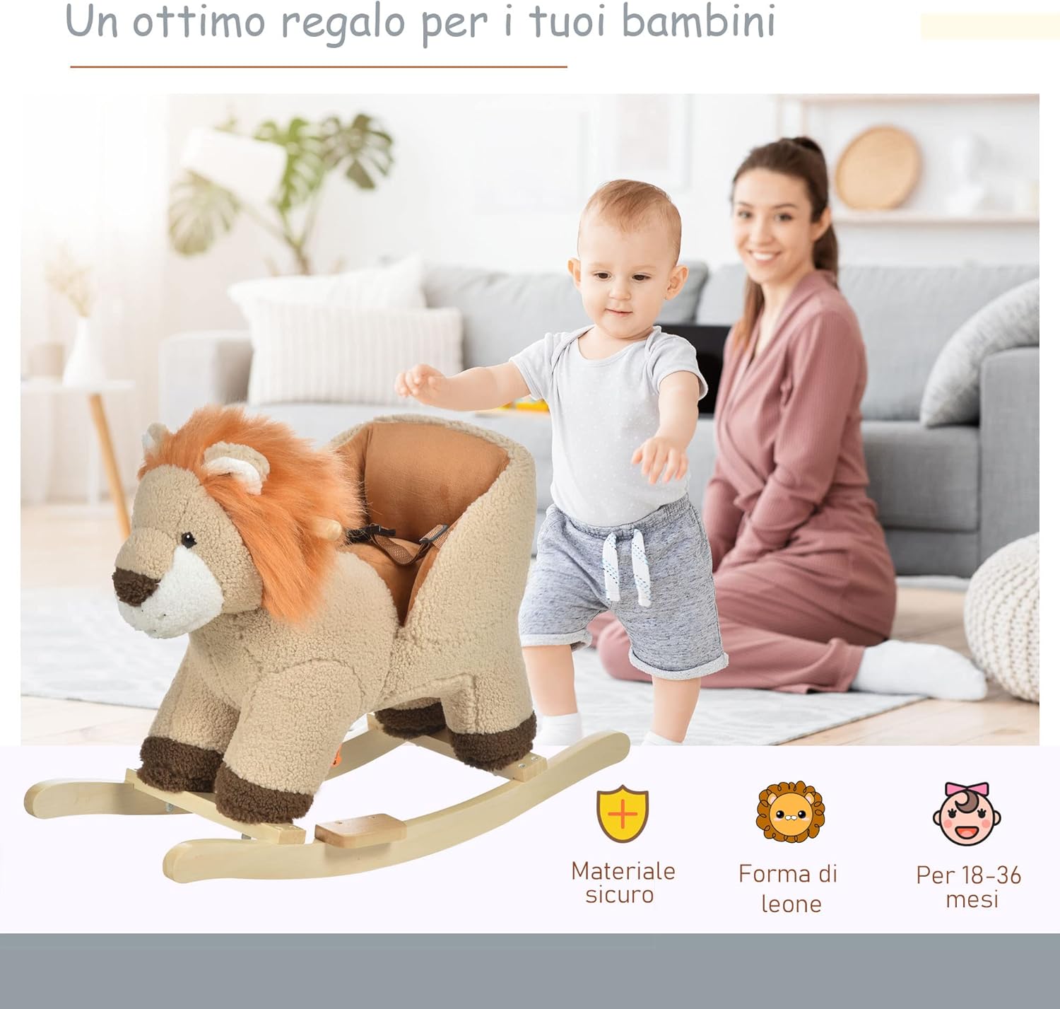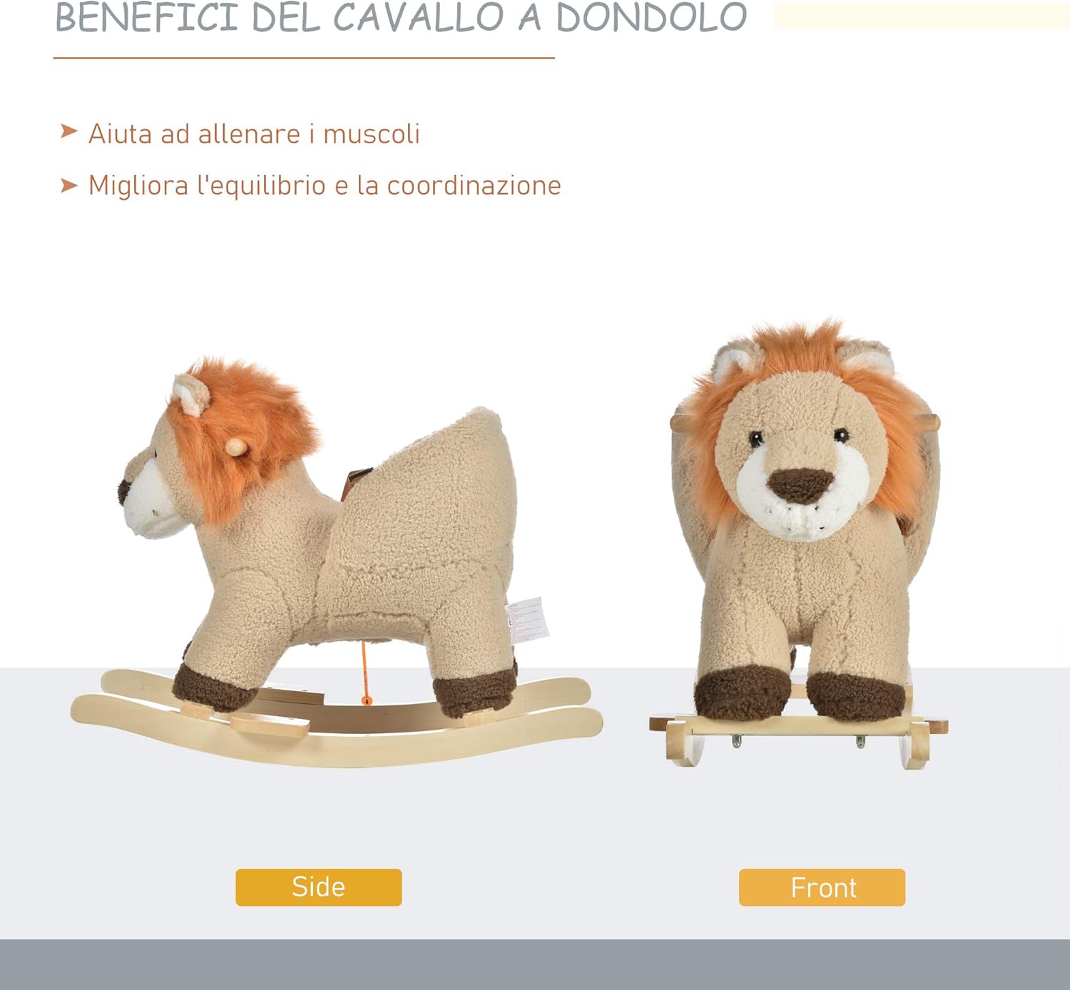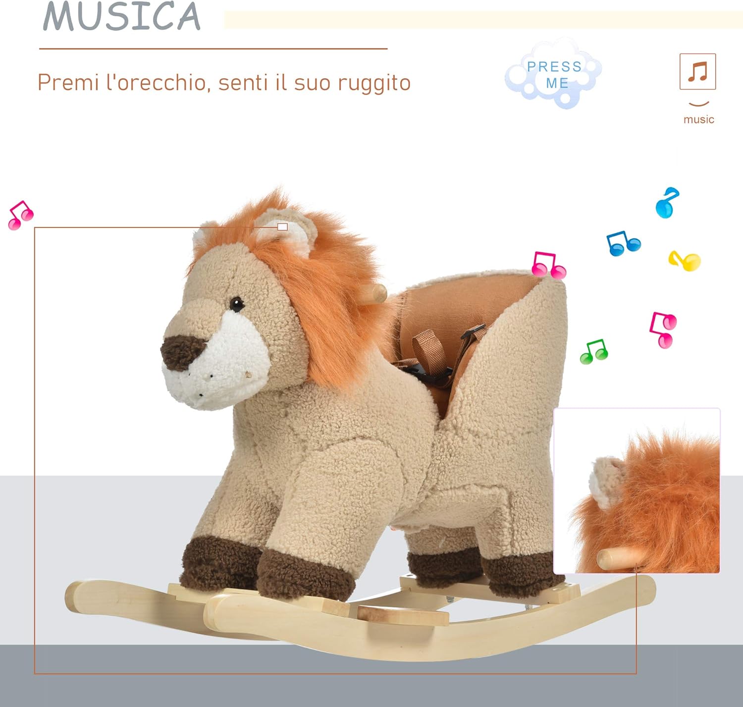 UN SIMPATICO LEONCINO: Viaggia nella savana insieme a questo leoncino a dondolo. Premi il pulsante sul suo orecchio e divertiti a sentire il suo ruggito! MORBIDO: Il corpo del leoncino, la seduta, lo schienale e i braccioli sono imbottiti e rivestiti in morbido peluche (poliestere) marrone. LEGNO DI PIOPPO: La base del dondolo è costruita in legno di pioppo finemente lavorato. Pesa solo 4 kg, ma può sostenere fino a 40kg. SICURO: I tuoi bambini possono accomodarsi sulla sella, impugnare le maniglie in legno, allacciare la cintura di sicurezza e dondolarsi in avanti e indietro senza nessun pericolo. PERFETTO PER BAMBINI: È consigliato per i bambini di età compresa tra i 18-36 mesi fino a 40kg. Dimensioni: 68L x 35P x 50Acm.