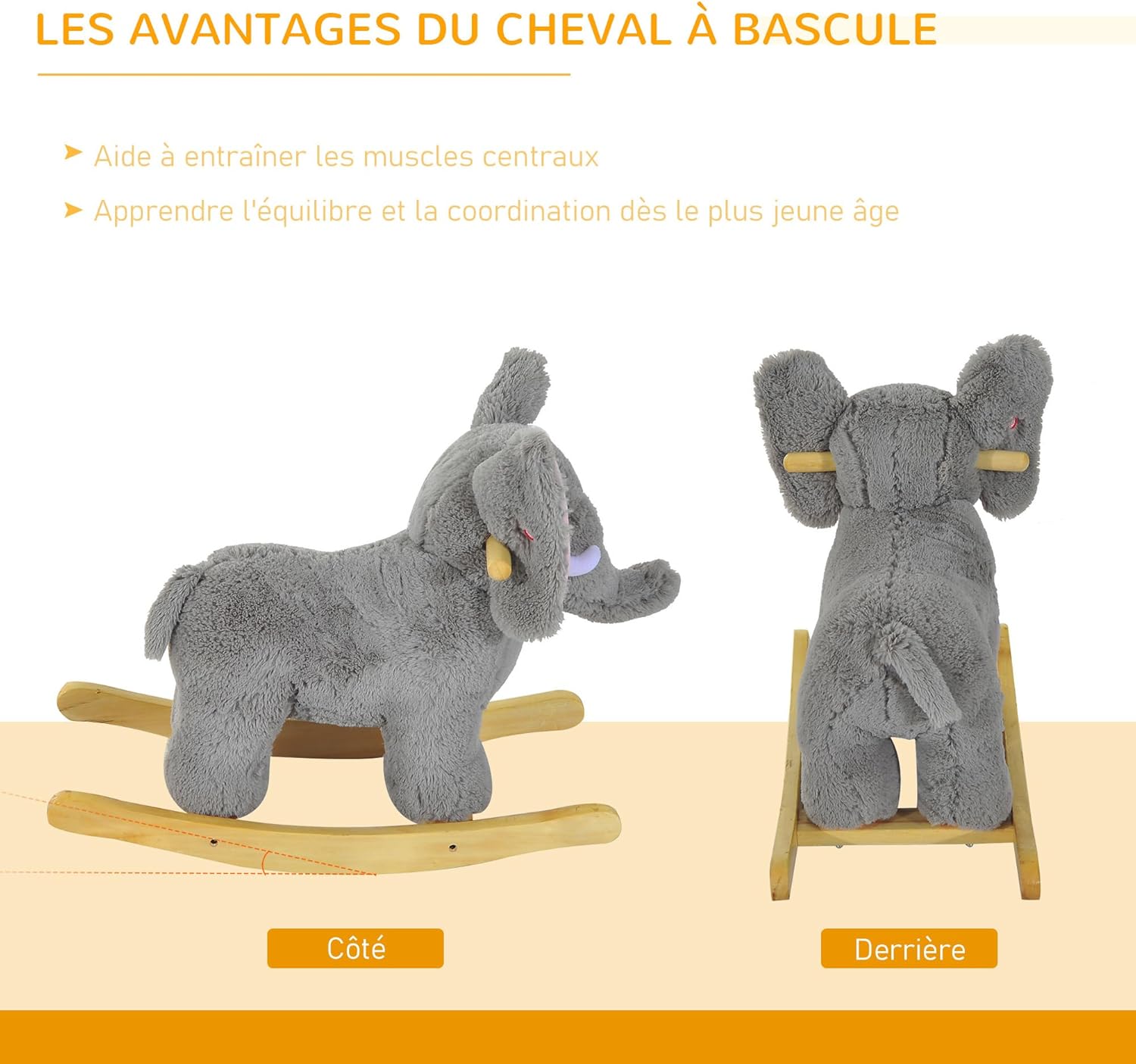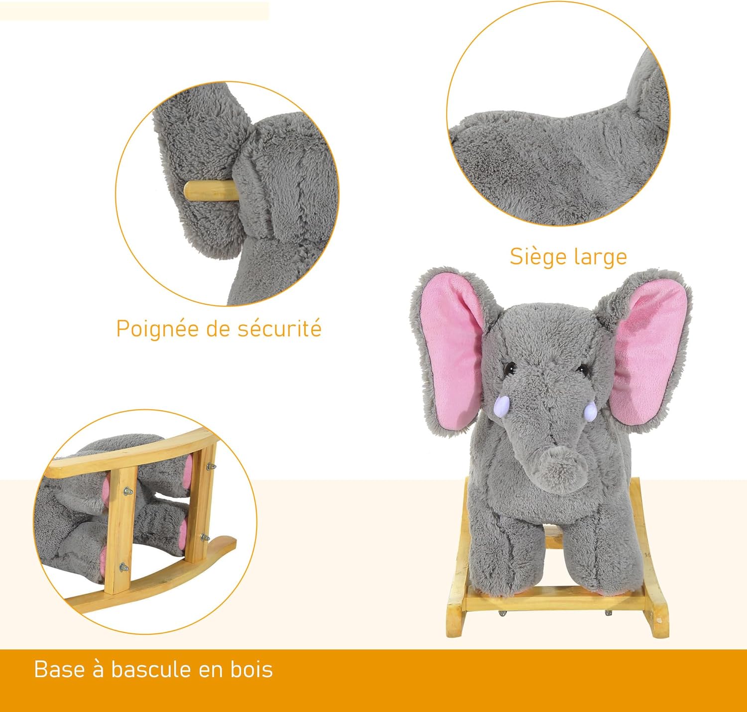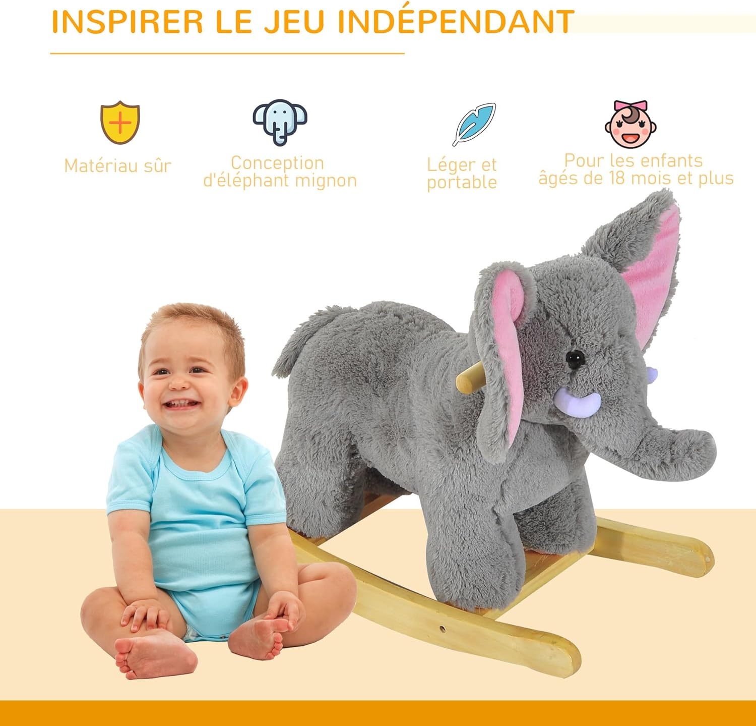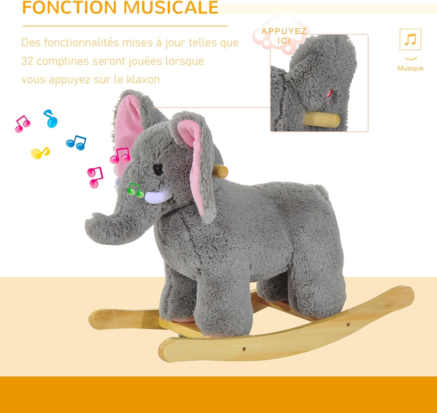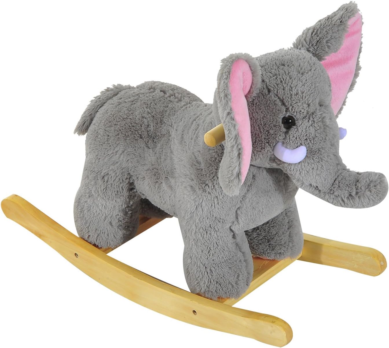 Giocattolo a dondolo a forma di elefante: bel giocattolo a dondolo a forma di elefante: modello che delizierà sicuramente il tuo bambino. Giocattolo a dondolo adatto a bambini di 18+ mesi sotto la supervisione di un adulto. Giocattolo ideale per imparare l'equilibrio. GRANDE COMFORT: Dotato di un rivestimento in peluche ultra morbido e di una barra di supporto anteriore facile da tenere, questo animale a dondolo rinnova l'esperienza esilarante delle passeggiate a cavallo. ROBUSTO E SICUREZZATO: Costruito in legno ad alta resistenza, questo giocattolo a dondolo in peluche supporta efficacemente il tuo bambino durante i suoi movimenti di bilanciere. Ideale per uso frequente. FUNZIONE MUSICALE: Premere le orecchie per attivare 32 diverse melodie che il bambino adorerà. Specifiche: Dimensioni totali: 61 x 23 x 43 cm. Portata max. Consigliato: 60 kg; adatto per bambini dai 18 mesi in su.