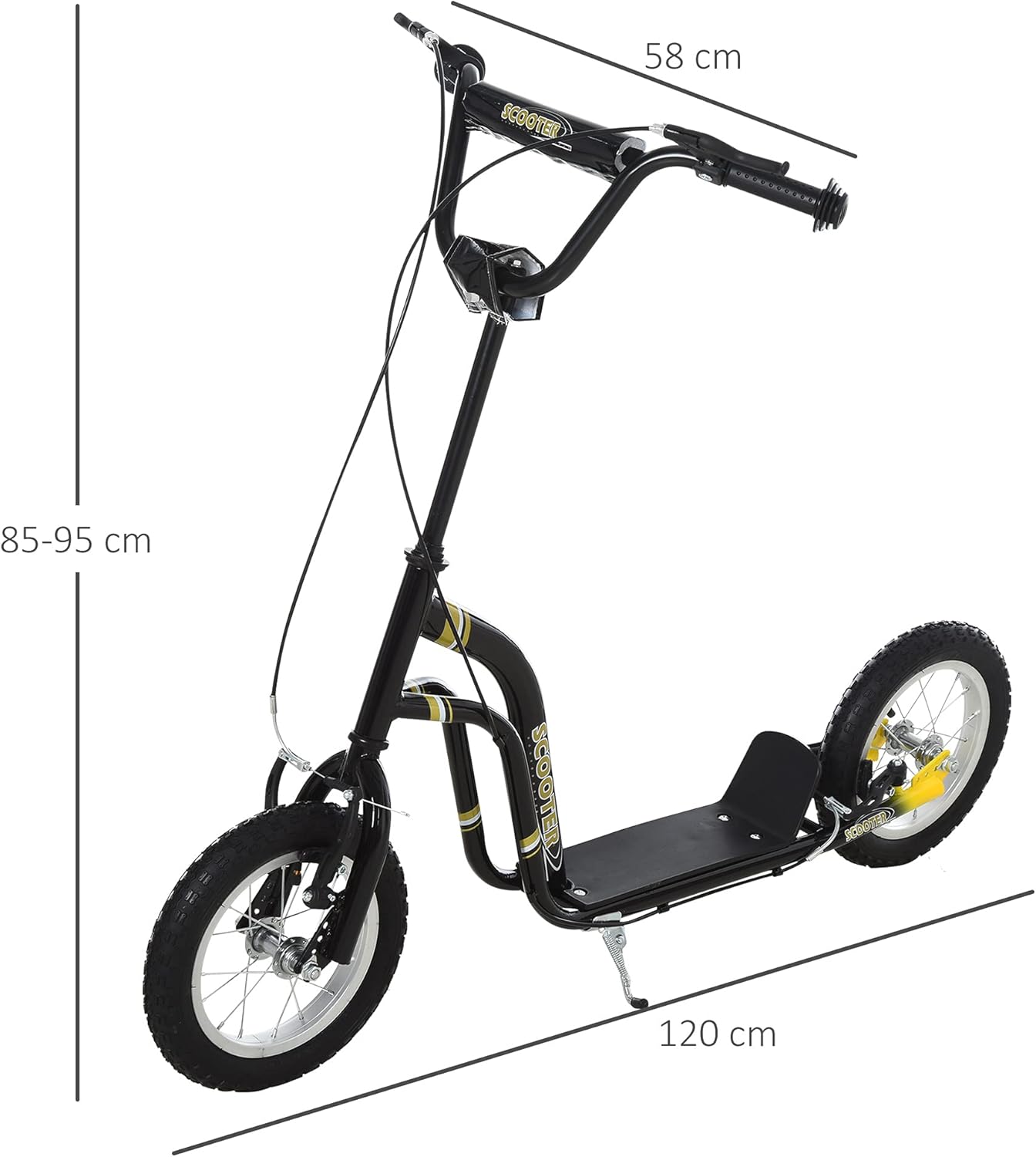 Regolazione in altezza facile: il monopattino per bambini con grande ruota può essere regolato in altezza da 85 a 95 cm, ideale per bambini dai 5 anni in su che crescono insieme ad esso. Guida delicata: dotato di ruote in gomma posteriori e anteriori Ø12", questo monopattino per bambini con ruote grandi consente una guida stabile e tranquilla su diverse superfici come asfalto, ghiaia o lastre per pavimentazione Design resistente: realizzato in robusto acciaio e alluminio con un'ampia copertura in plastica, questo monopattino offre una stabilità affidabile e un ampio spazio per i piedi Frenata sicura: dotato di freni anteriori e posteriori e di un supporto per un facile parcheggio, questo monopattino offre sicurezza e comfort ai giovani ciclisti Dimensioni del kickscooter: 120L x 58B x 85-95H cm. Carico massimo: 100 kg. Montaggio necessario