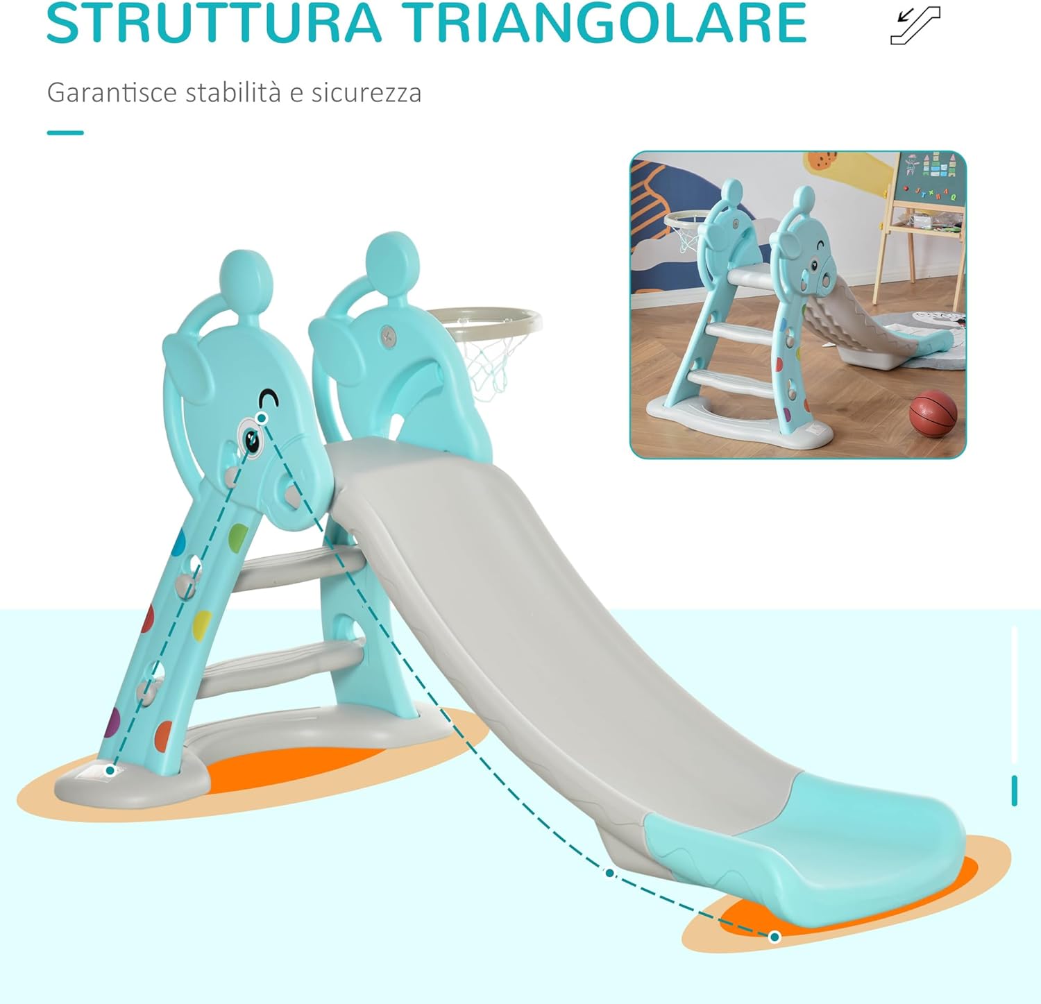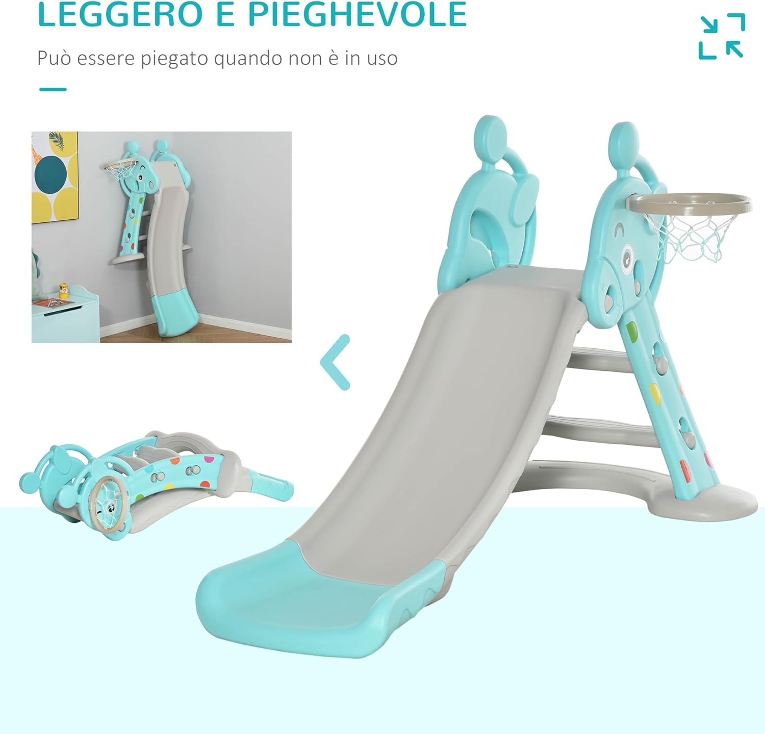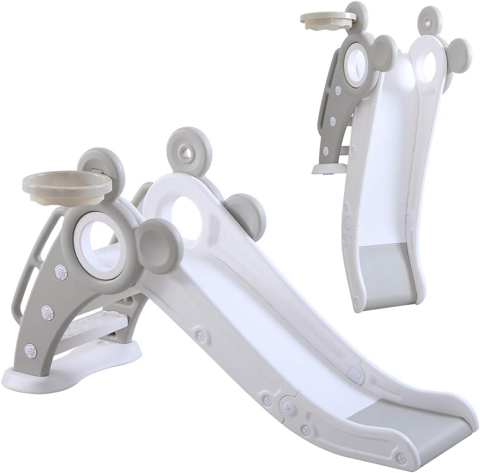 SCIVOLO 2 IN 1: Questo scivolo per bambini con canestro incorporato offre tanto divertimento ai più piccoli! È un gioco ideale per stimolare le capacità motorie, la coordinazione e rafforzare i muscoli. Gli scalini sono facili da usare e lo scivolo ampio permette di giocare in sicurezza RESISTENTE E FACILE DA MONTARE: Non sono necessari attrezzi per l'installazione. Lo scivolo con canestro basket per bambini è realizzato in HDPE non tossico, inodore e sicuro. La struttura liscia con bordi arrotondati permette di giocare in modo sicuro STRUTTURA STABILE: Con il suo design triangolare, gli scalini antiscivolo e un'ampia seduta per prepararsi a scivolare, questo scivolo ti permette di far divertire i bimbi senza pensieri. Lo scivolo spesso e i piedini ampi assicurano una stabilità ottimale PIEGHEVOLE E LEGGERO: Grazie al suo design compatto e leggero lo puoi mettere in diversi spazi della casa. Lo scivolo per bambini è pieghevole, così lo riponi con il minimo ingombro e lo sposti facilmente DIMENSIONI: Dimensioni generali: 147L x 82P x 85.5A cm. Età consigliata: a partire da 18 mesi. Peso massimo supportato: 20 kg; Certificazioni: EN71-1-2-3-8