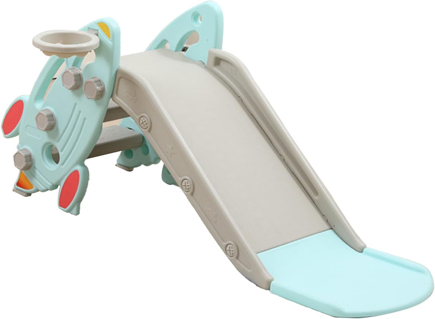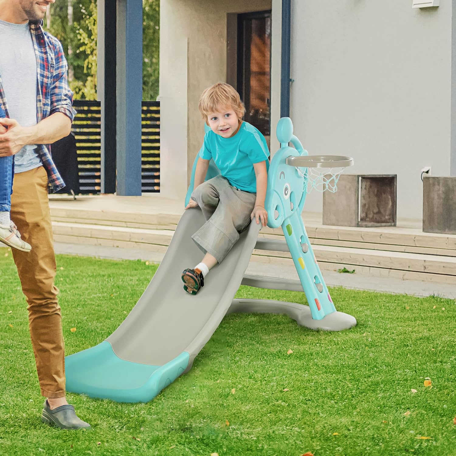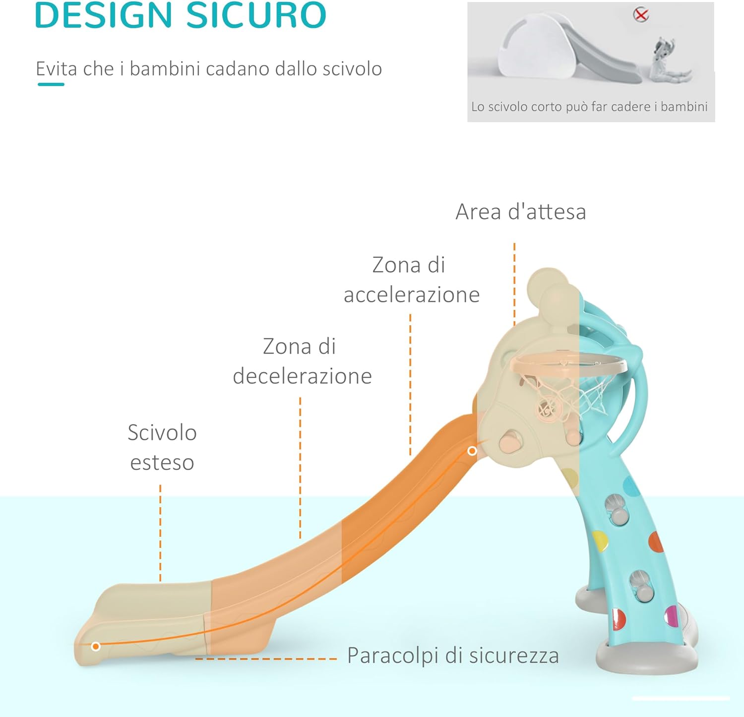 SCIVOLO 2 IN 1: Questo scivolo per bambini con canestro incorporato offre tanto divertimento ai più piccoli! È un gioco ideale per stimolare le capacità motorie, la coordinazione e rafforzare i muscoli. Gli scalini sono facili da usare e lo scivolo ampio permette di giocare in sicurezza RESISTENTE E FACILE DA MONTARE: Non sono necessari attrezzi per l'installazione. Lo scivolo con canestro basket per bambini è realizzato in HDPE non tossico, inodore e sicuro. La struttura liscia con bordi arrotondati permette di giocare in modo sicuro STRUTTURA STABILE: Con il suo design triangolare, gli scalini antiscivolo e un'ampia seduta per prepararsi a scivolare, questo scivolo ti permette di far divertire i bimbi senza pensieri. Lo scivolo spesso e i piedini ampi assicurano una stabilità ottimale PIEGHEVOLE E LEGGERO: Grazie al suo design compatto e leggero lo puoi mettere in diversi spazi della casa. Lo scivolo per bambini è pieghevole, così lo riponi con il minimo ingombro e lo sposti facilmente DIMENSIONI: Dimensioni generali: 147L x 82P x 85.5A cm. Età consigliata: a partire da 18 mesi. Peso massimo supportato: 20 kg; Certificazioni: EN71-1-2-3-8