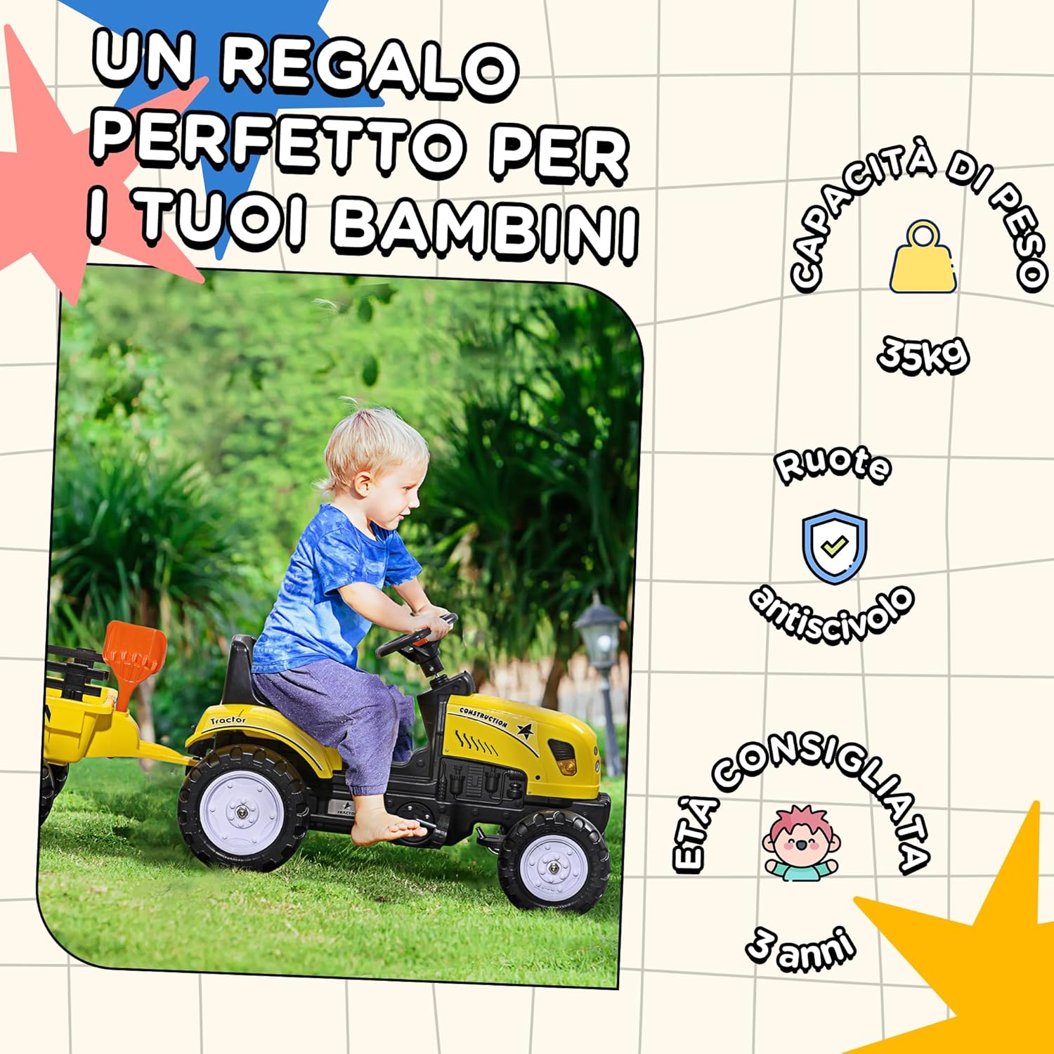 TRATTORE A PEDALI: Questo trattore per bambini è dotato di due pedali che permettono ai giovani piloti di muoversi avanti e indietro, unendo divertimento e movimento RIMORCHIO POSTERIORE: Completo di pala e rastrello da inserire nel rimorchio, questo trattore giocattolo a pedali è perfetto per divertirsi a scavare e portare in giro altri giochi TANTO DIVERTIMENTO: Con il suo clacson funzionante e diverse modalità di gioco, il nostro trattore a pedali trasforma ogni uscita in un'avventura entusiasmante SICUREZZA PRIMA DI TUTTO: Fabbricato in metallo e plastica robusti, il trattore cavalcabile per bambini presenta 4 ruote antiscivolo per garantire ai più piccoli un'esperienza di guida sicura e piacevole nel giardino di casa DIMENSIONI: Dimensioni complessive: 133L x 42P x 51A cm. Ideale per bambini dai 3 anni in su. Capacità di peso massima: 35 kg. Montaggio richiesto