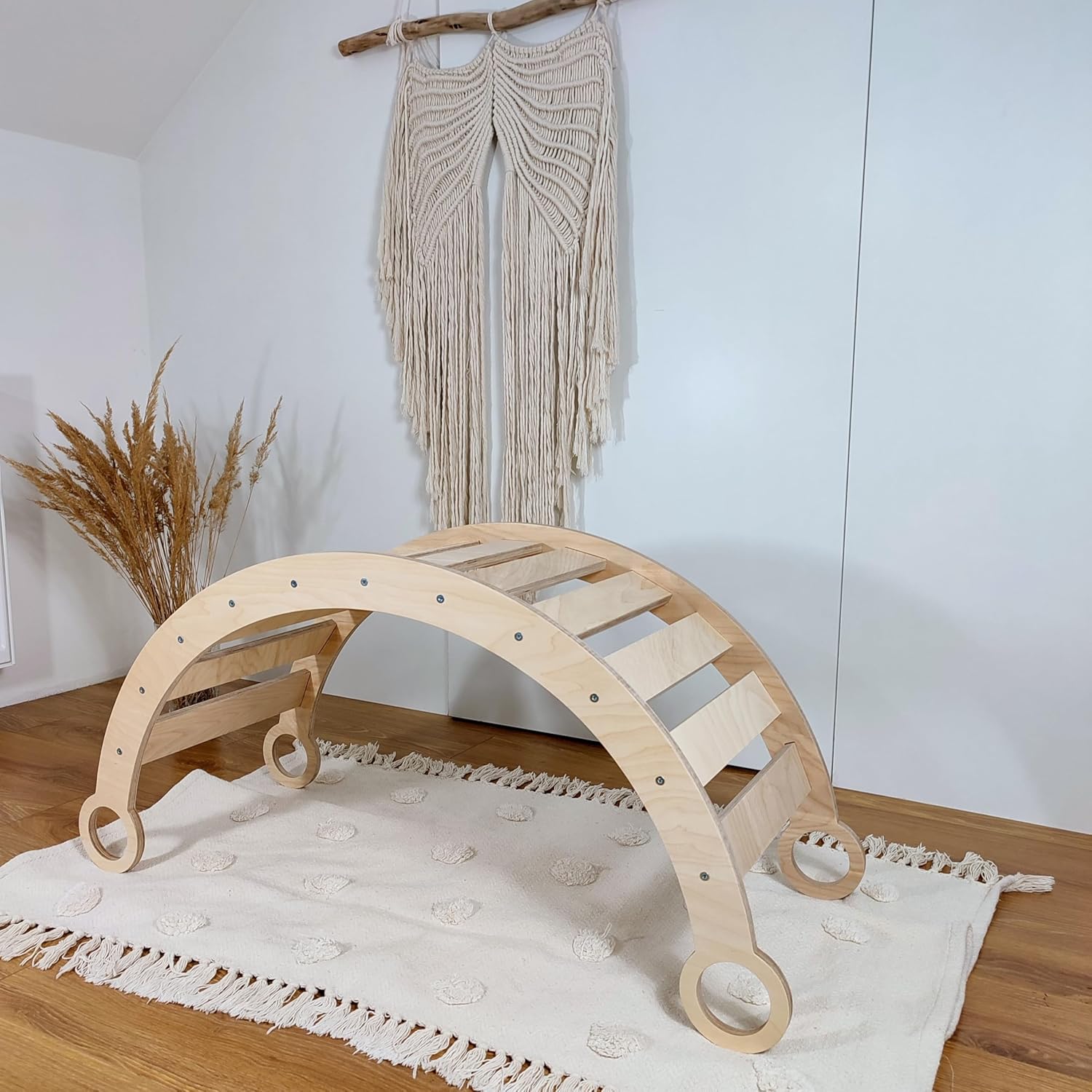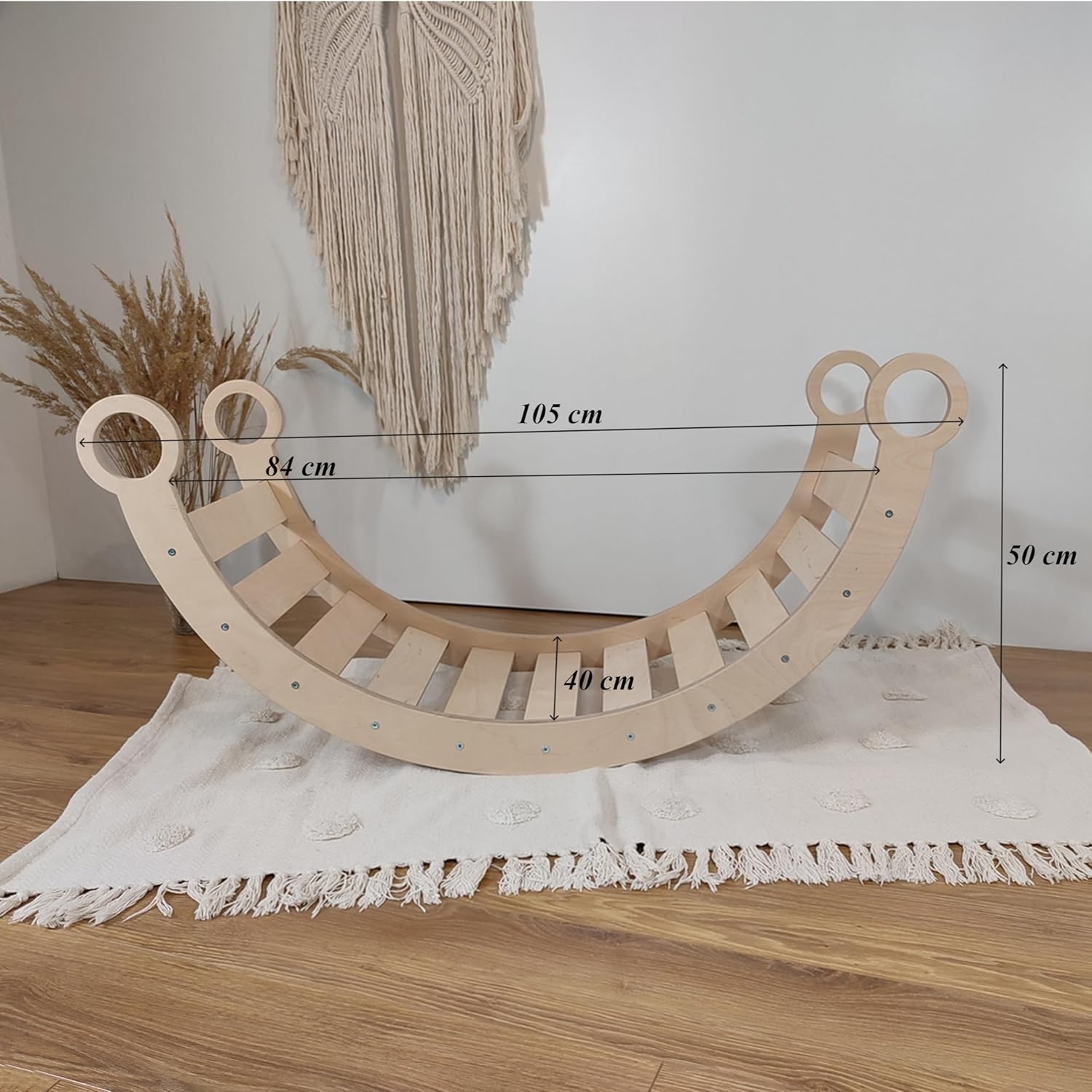 Regala gioia e sicurezza al tuo bambino: la superficie liscia e levigata a mano del dondolo è piacevole al tatto ed è completamente sicura per i più piccoli. Stimola lo sviluppo olistico del tuo bambino: il dondolo non solo rafforza il senso dell'equilibrio, ma stimola anche la creatività e l'immaginazione del tuo bambino. Pause rilassanti per te mentre il tuo bambino sta giocando: il tuo bambino rimarrà occupato per ore mentre potrai concederti un meritato riposo. Versatilità che non conosce limiti – Il dondolo offre infinite possibilità di gioco, sia come ponte, lettino per bambole o baby palestra – tutto in linea con la filosofia Montessori. Dati tecnici: portata fino a 100 kg, peso 8,5 kg, facile da montare, prodotto nell'Unione Europea.