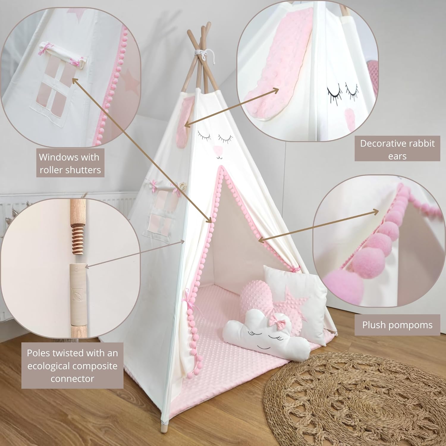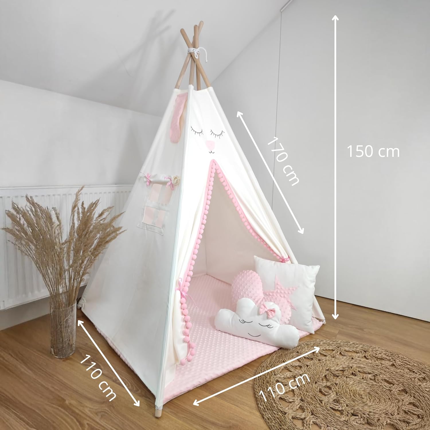 Ritiro magico: crea un incantevole parco giochi per il tuo bambino dove l'immaginazione e i sogni non conoscono limiti. Massimo comfort: il morbido tessuto minky e il cotone di alta qualità offrono una sensazione confortevole e accogliente, ideale per giocare e rilassarsi. Sicuro e sano: il cotone certificato OEKO-TEX e il tessuto Minky garantiscono che il tuo bambino giochi in un ambiente sicuro e privo di sostanze inquinanti. Facile da pulire: il rivestimento sfoderabile è lavabile in lavatrice a 30 gradi, rendendo la pulizia semplice e senza sforzo. Dati tecnici: Distanza massima tra i pali: 110 x 110 cm; Altezza massima: 150 cm; Tappetino: 100 x 100 cm; Cuscino quadrato: 35 x 35 cm; Cuore cuscino: 35 x 35 cm; Cuscino nuvola: 21 x 42 cm
