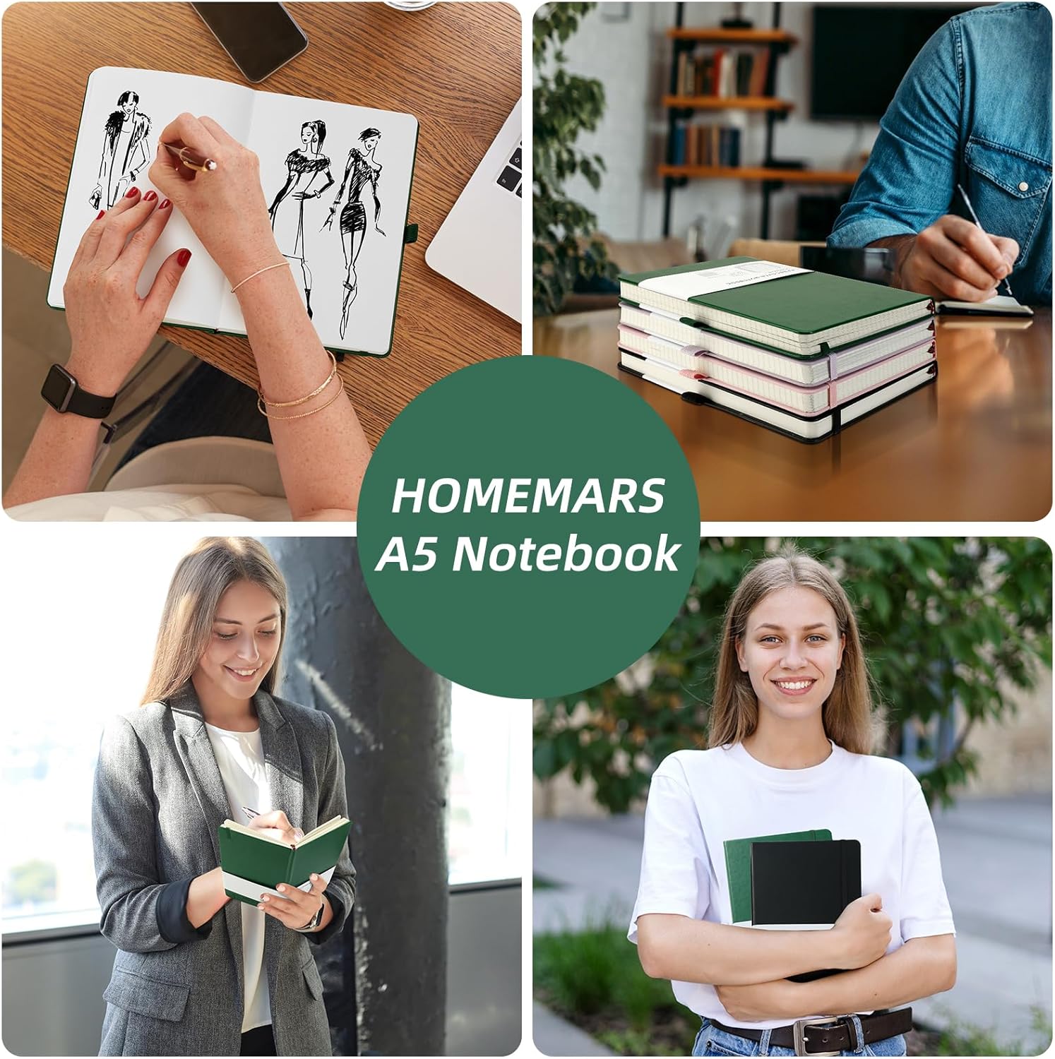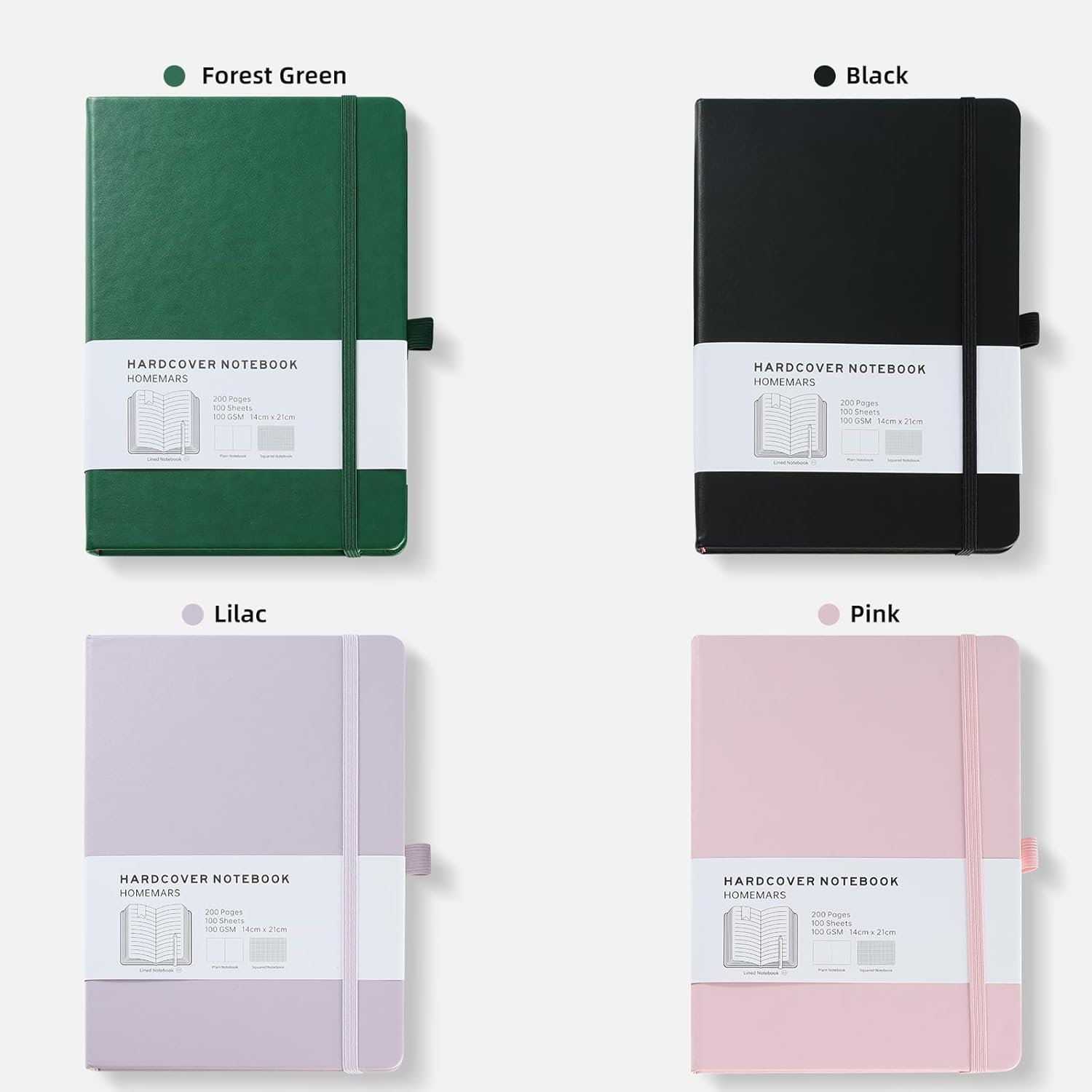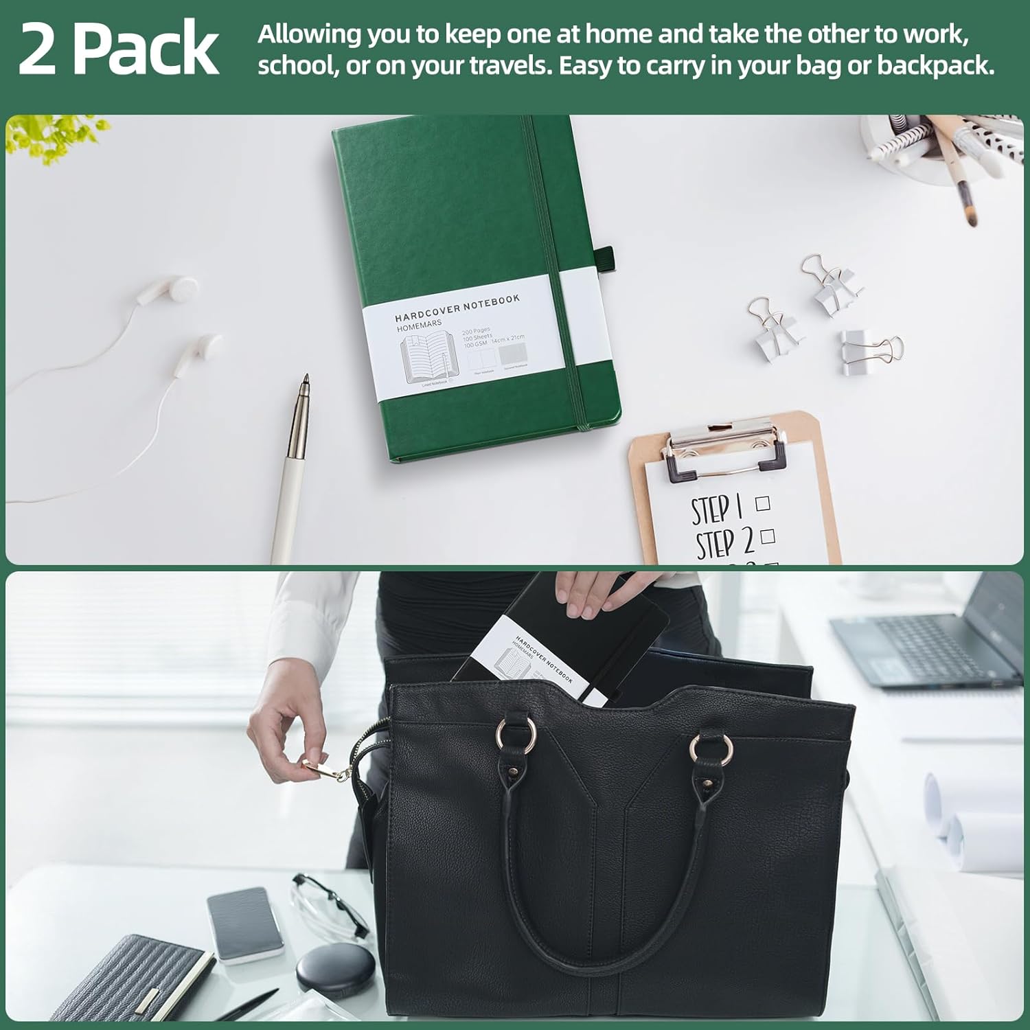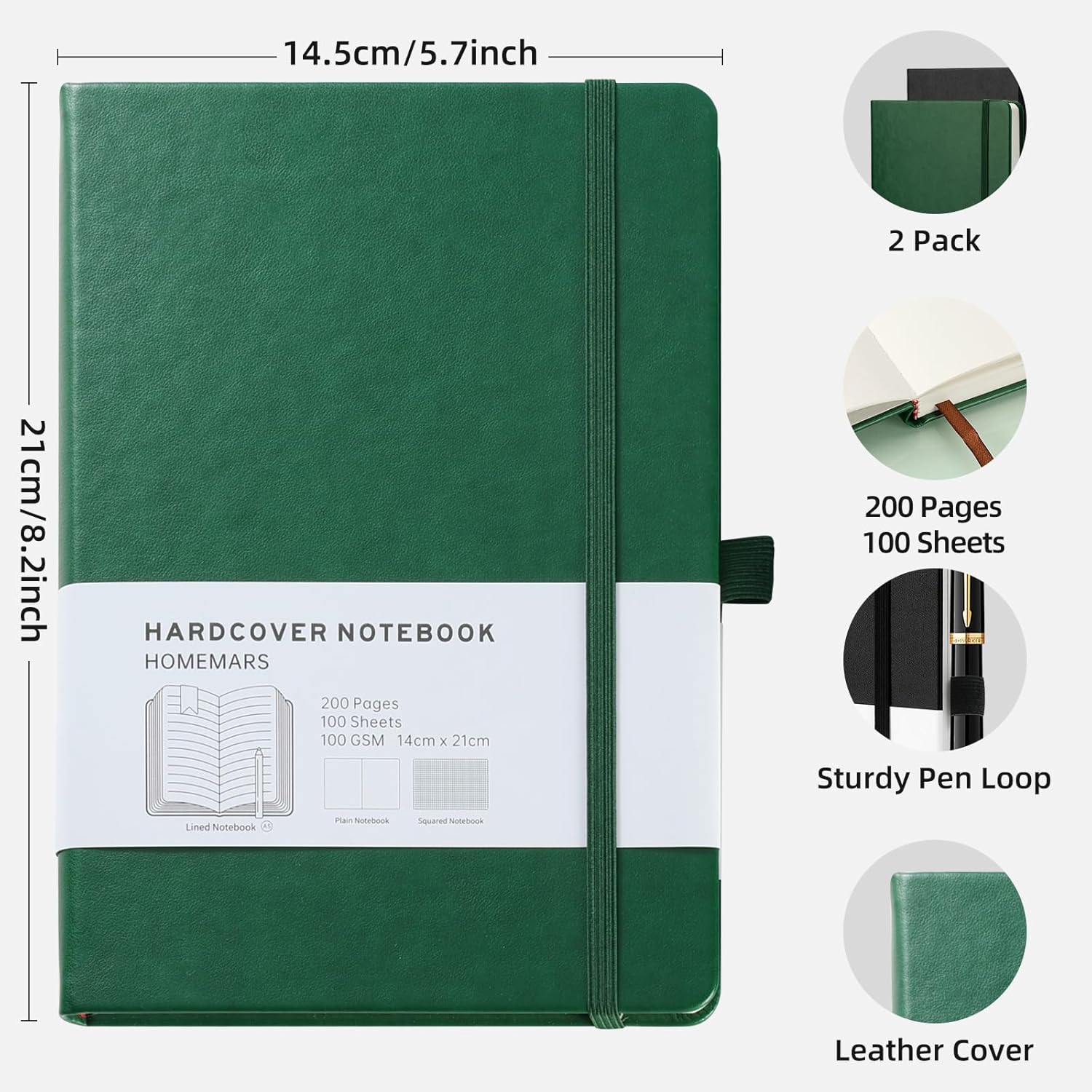 Set di 2 quaderni A5: questa inserzione include due quaderni A5, perfetti per l'uso in ufficio, a casa o a scuola. Carta di alta qualità: ogni taccuino contiene 100 fogli (200 pagine) di carta da 100 g/m², fornendo una superficie di scrittura liscia e robusta. Comodo passante per penna: il robusto passante per penna ti assicura di avere sempre una penna o una matita a portata di mano quando ne hai bisogno. Design durevole: realizzati con una copertina in pelle PU, questi quaderni sono costruiti per resistere all'uso quotidiano e proteggere i tuoi appunti. Chiusura sicura: la fascia elastica mantiene il notebook ben chiuso, impedendo la caduta di pagine o oggetti sciolti.