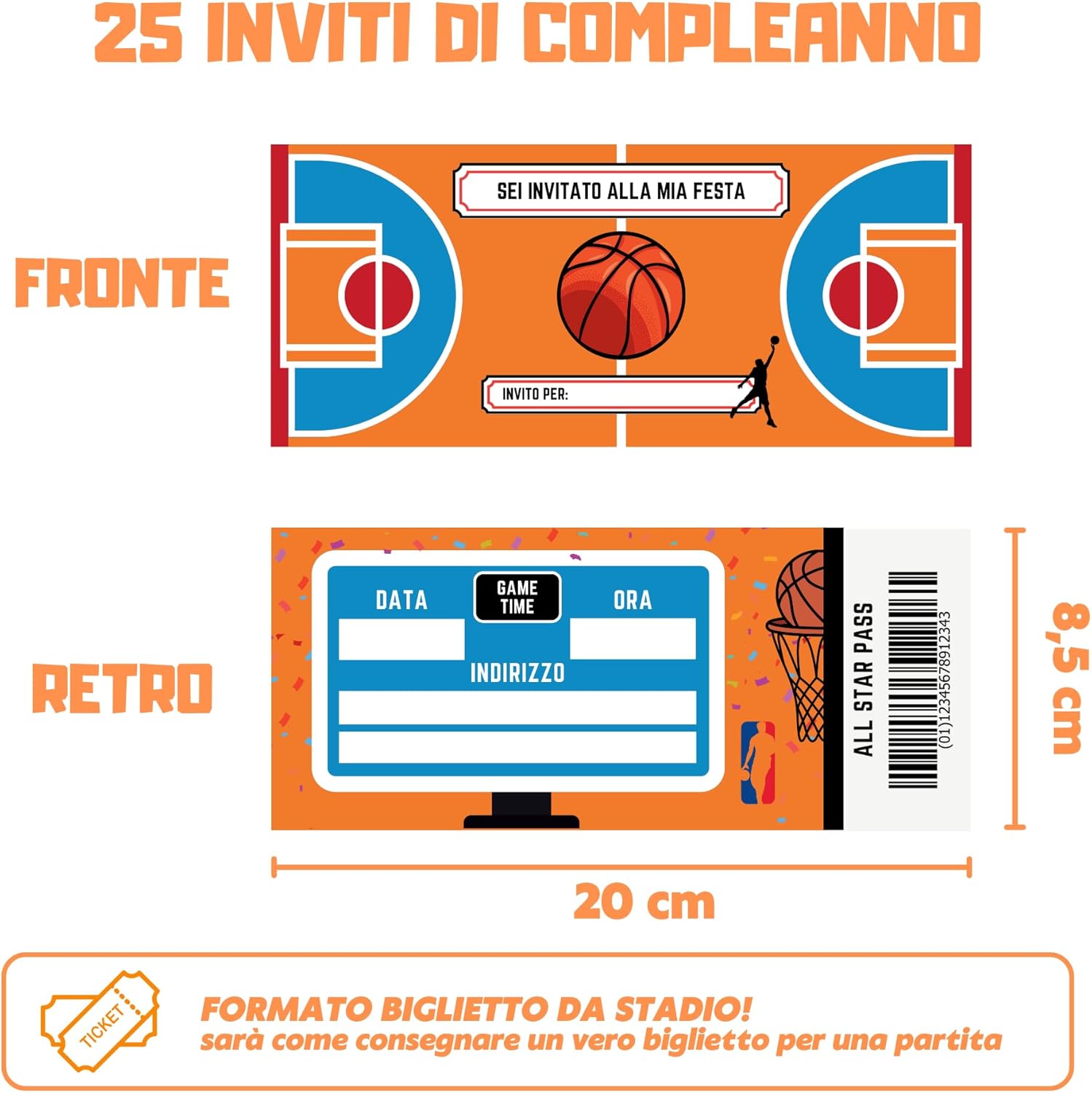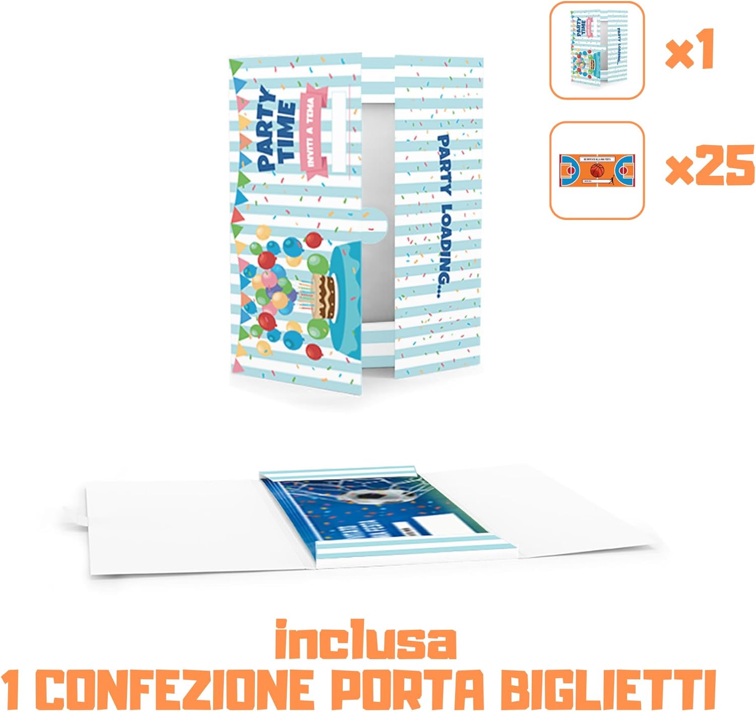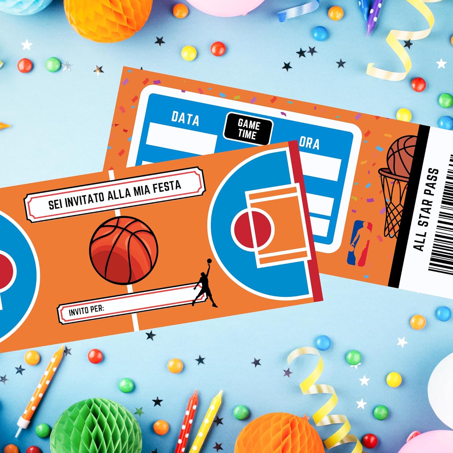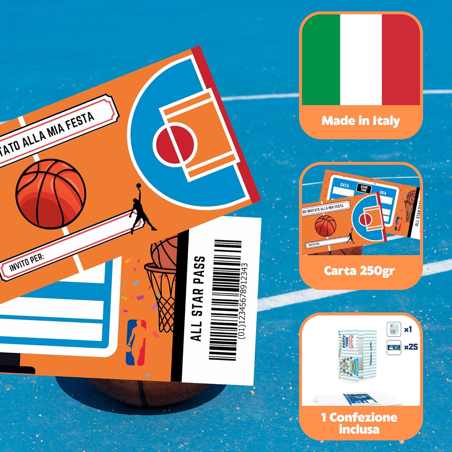 25 inviti + 1 confezione: 25 biglietti d'auguri per bambini da compilare per la tua festa. Grazie alla sua scatola in cartone potrai consegnare i biglietti d'auguri a tutti gli invitati senza timore di perderli. Formato biglietto da stadio: il design di questi inviti di compleanno per bambini è progettato per assomigliare a un biglietto reale. Con questi gadget da basket per il compleanno dei bambini l'effetto wow è assicurato! Made in Italy: inviti compleanno italiani. Biglietti d'invito compleanno realizzati in Italia con materiali di alta qualità. Carta da 250 g. Dimensioni dei biglietti d'invito compleanno per ragazze e bambini: 20 x 8,5 cm. Confezione: i biglietti d'invito di compleanno per ragazze e ragazzi vengono forniti con una scatola di cartone. Ogni festa inizia con gli inviti alle feste, quindi vogliamo metterli in risalto! Compleanno a tema basket: regala a tuo figlio un compleanno basket indimenticabile. Con questi inviti di compleanno puoi creare un kit di compleanno unico a tema basket