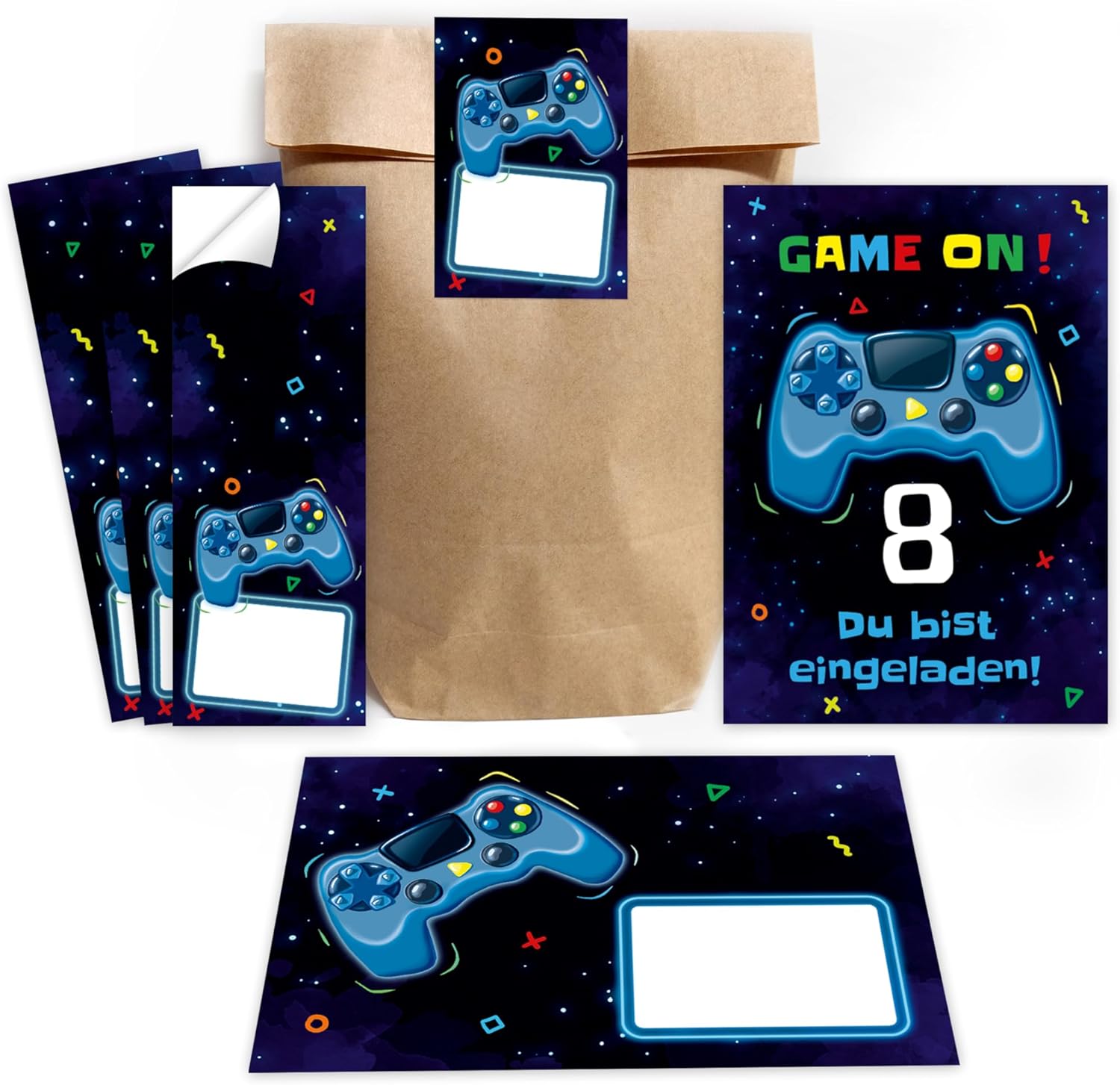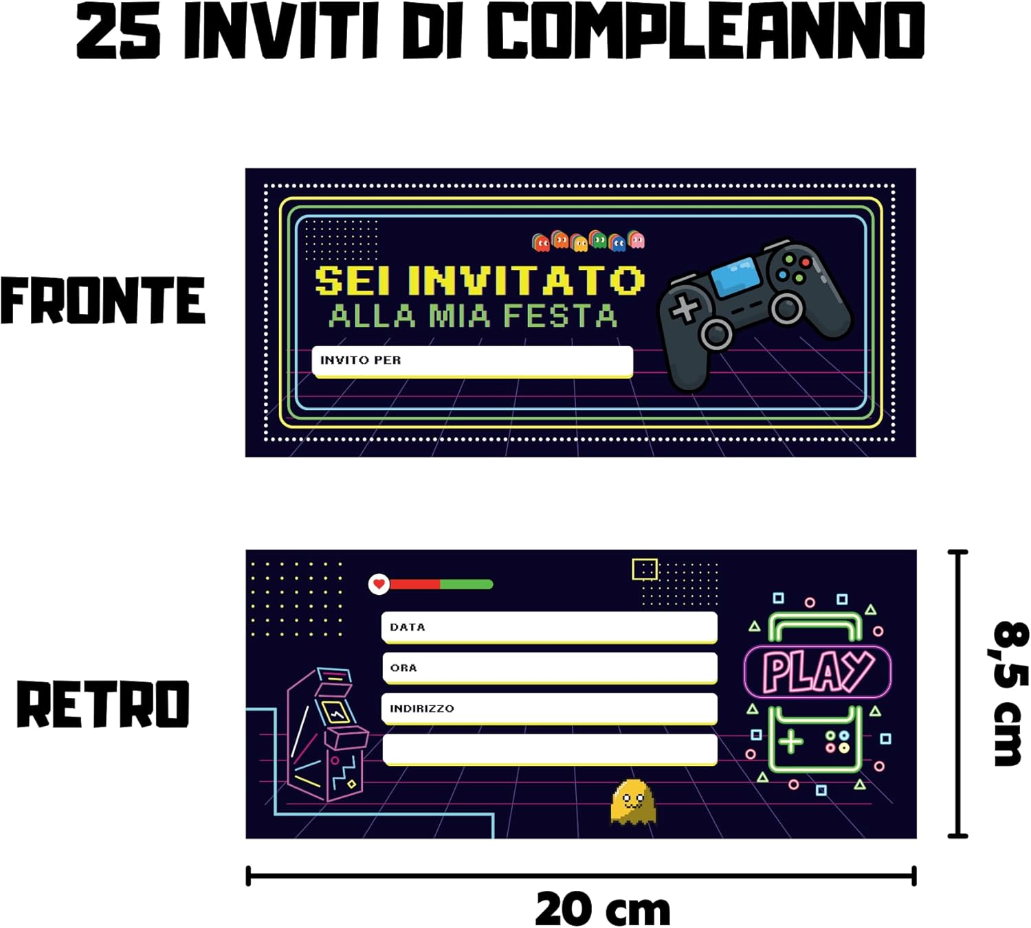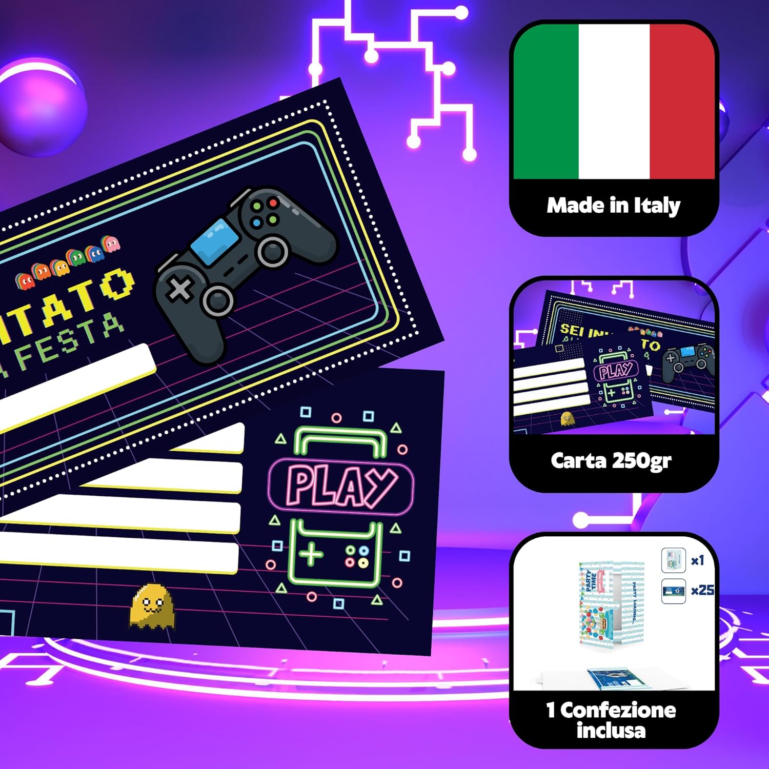 🎉 25 INVITI + 1 CONFEZIONE: 25 biglietti compleanno bambini da compilare per la tua festa. Grazie alla confezione in cartoncino potrai consegnare i bigliettini per compleanno a tutti gli invitati senza temere di perderli. 🇮🇹 MADE IN ITALY: Inviti compleanno italiano. Biglietti di invito compleanno realizzati in Italia con materiale di alta qualità. Carta 250gr. Dimensione biglietti inviti compleanno bambina e bambino: 20 x 8,5cm. 📥 CONFEZIONE INCLUSA: I biglietti invito compleanno bambina e bambino homty arrivano con una confezione in cartoncino. Tutti i party iniziano con gli inviti festa, per questo noi vogliamo valorizzarli! 🎮 SET COMPLEANNO VIDEOGIOCHI : Regala al tuo bambino una festa compleanno tema videogiochi indimenticabile! Con questi inviti di compleanno potrai realizzare un kit inviti compleanno videogiochi unico! 👾 FESTA TEMA VIDEOGIOCHI : Con questi inviti per festa videogiochi l'effetto wow è assicurato! Preparati per una vera festa Video Game!