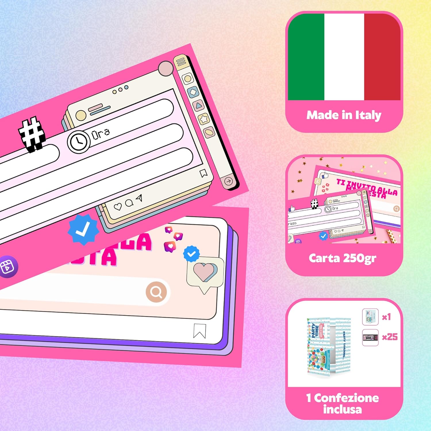 🎉 25 INVITI + 1 CONFEZIONE: 25 biglietti compleanno bambini da compilare per la tua festa. Grazie alla confezione in cartoncino potrai consegnare i bigliettini per compleanno a tutti gli invitati senza temere di perderli. 💖 FESTA A TEMA: Con questi inviti compleanno bambini l'effetto wow è assicurato! Un vero set compleanno bambina per inviti personalizzati. 🇮🇹 MADE IN ITALY: Biglietto invito compleanno bambina in italiano. Biglietti di invito compleanno realizzati in Italia con materiale di alta qualità. Carta 250gr. Dimensione biglietti inviti compleanno bambino e bambina: 20 x 8,5cm. 📩 SCATOLA INCLUSA: I biglietti invito compleanno bambino e bambina homty arrivano con una confezione in cartoncino. Tutti i party iniziano con gli inviti festa, per questo noi vogliamo valorizzarli! 🥳 KIT FESTA: Regala allla tua bimba un compleanno indimenticabile! Con questi inviti di compleanno potrai realizzare una festa compleanno bambina unica. Il compleanno a tema sarà indimenticabile.