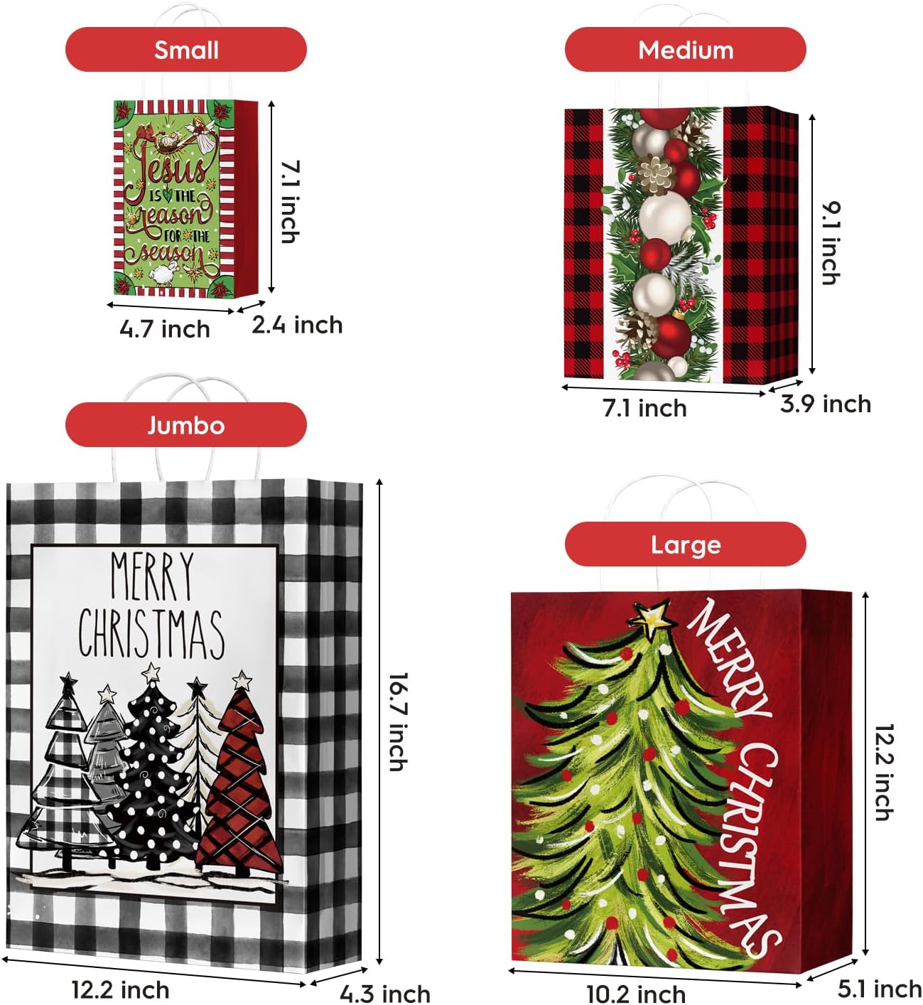 VARIE MISURE PER SODDISFARE TUTTE LE TUE ESIGENZE: I nostri sacchetti regalo di Natale sono disponibili in quattro comode misure: 6 Jumbo, 6 Grandi, 6 Medi e 6 Piccoli. Offriamo una taglia per ogni occasione, rendendoti più semplice la scelta della borsa giusta per le tue esigenze! Maniglie facili da trasportare: le nostre borse sono dotate di maniglie forti e robuste che le rendono facili da trasportare e garantiscono una presa sicura quando si maneggiano i regali. Progettate per facilità e comfort, queste maniglie renderanno la tua esperienza di regalo semplice e piacevole. GRANDE CAPACITÀ E UTILIZZO VERSATILE: I nostri sacchetti regalo sono progettati appositamente per le festività natalizie e presentano interni spaziosi che possono ospitare una varietà di articoli festivi. Sono perfetti per i regali di Natale, ma la loro versatilità e la grande capienza li rendono adatti anche ad altri usi quotidiani e alle occasioni speciali. PROGETTATI PER TE: i sacchetti regalo Horaldaily sono progettati da professionisti. Colori vivaci e stampe grafiche uniche per il tuo Natale! Design eleganti e festosi: festeggia le festività natalizie con stile con le nostre borse regalo di Natale. Disponibili in diversi look e stili, queste borse aggiungeranno un tocco festoso ai tuoi regali e faranno sicuramente sorridere i volti dei tuoi cari.