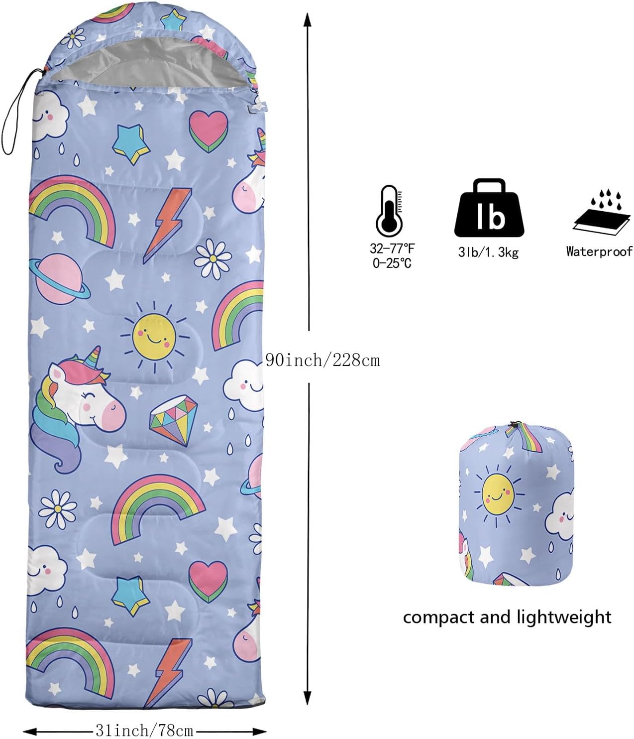 ADATTO: il sacco a pelo può essere utilizzato per 3 stagioni. Dimensioni: 80 x 230 cm. Temperatura estrema consigliata: 41 ℉ -77 ℉. Applicabile in una varietà di scenari, ad esempio tenere al caldo e prevenire l'umidità Leggera esperienza all'aperto/interno: il sacco a pelo è incluso in una confezione. Dimensioni confezione: 38 x 35 x 9 cm. Ogni sacco a pelo viene fornito con un sacco a compressione con cinghie che lo rendono super comodo da riporre e facile da trasportare. Istruzioni per la pulizia: per il rivestimento esterno un panno umido è una buona scelta. In caso di sporco pesante, è possibile utilizzare anche il lavaggio in lavatrice. Ciò prolunga la durata, facilita la manutenzione e la durata. Si prega di non utilizzare candeggina che compromettono la stampa e la colorazione del prodotto e del materiale. PER I NOSTRI CLIENTI: per servirti meglio, puoi inviarci un messaggio in caso di domande. Vi risponderemo al più presto possibile. Sempre lì per te.
