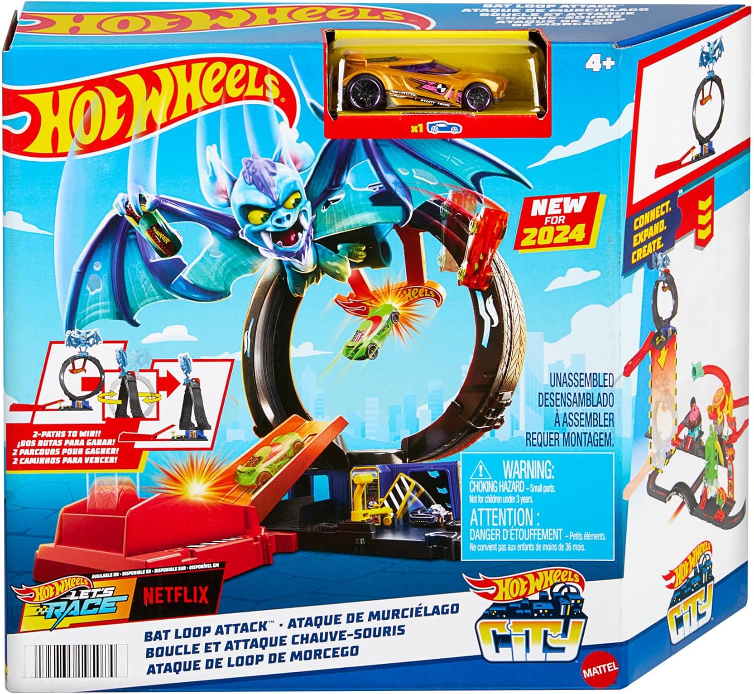 Sfreccia e lanciati in acrobazie per sconfiggere il pipistrello che ha attaccato il negozio di pneumatici Hot Wheels City Il set presenta tre modalità di gioco: Lanciati nel loop per sconfiggere la creatura, mira e lancia per colpire il pipistrello con uno spettacolare salto o sfreccia sotto il loop per concentrarti sul gioco su pista Il grande loop ruota per rendere il gioco e le sfide più dinamici; regola il lanciatore per controllare l'azione Ricrea i momenti preferiti della serie Netflix 'Let's Race' o crea la tua storia basata sulla serie Collega il set ad altre piste e set Hot Wheels per avventure e storie senza fine; (Set aggiuntivi in vendita separatamente) Con 1 macchinina Hot Wheels inclusa, il negozio di pneumatici Hot Wheels City è un ottimo regalo per ogni occasione