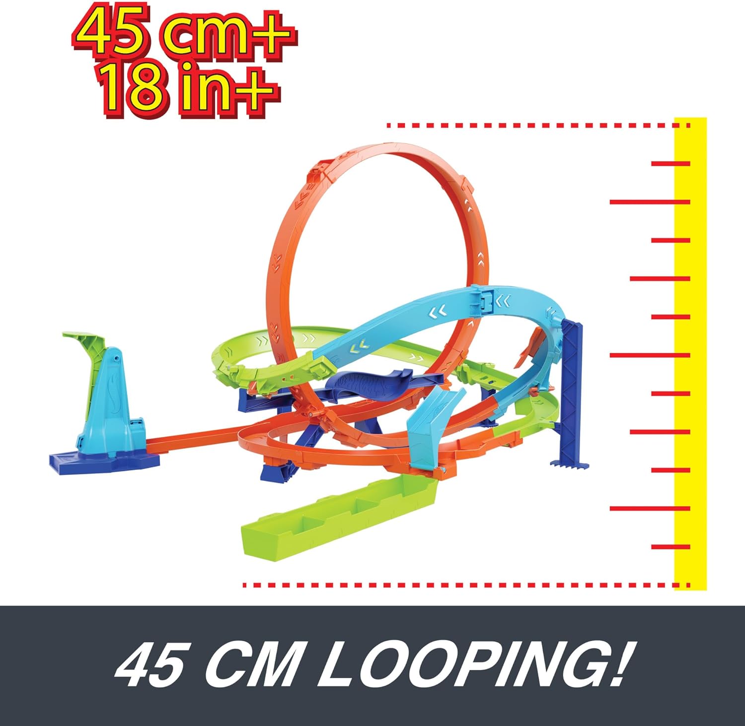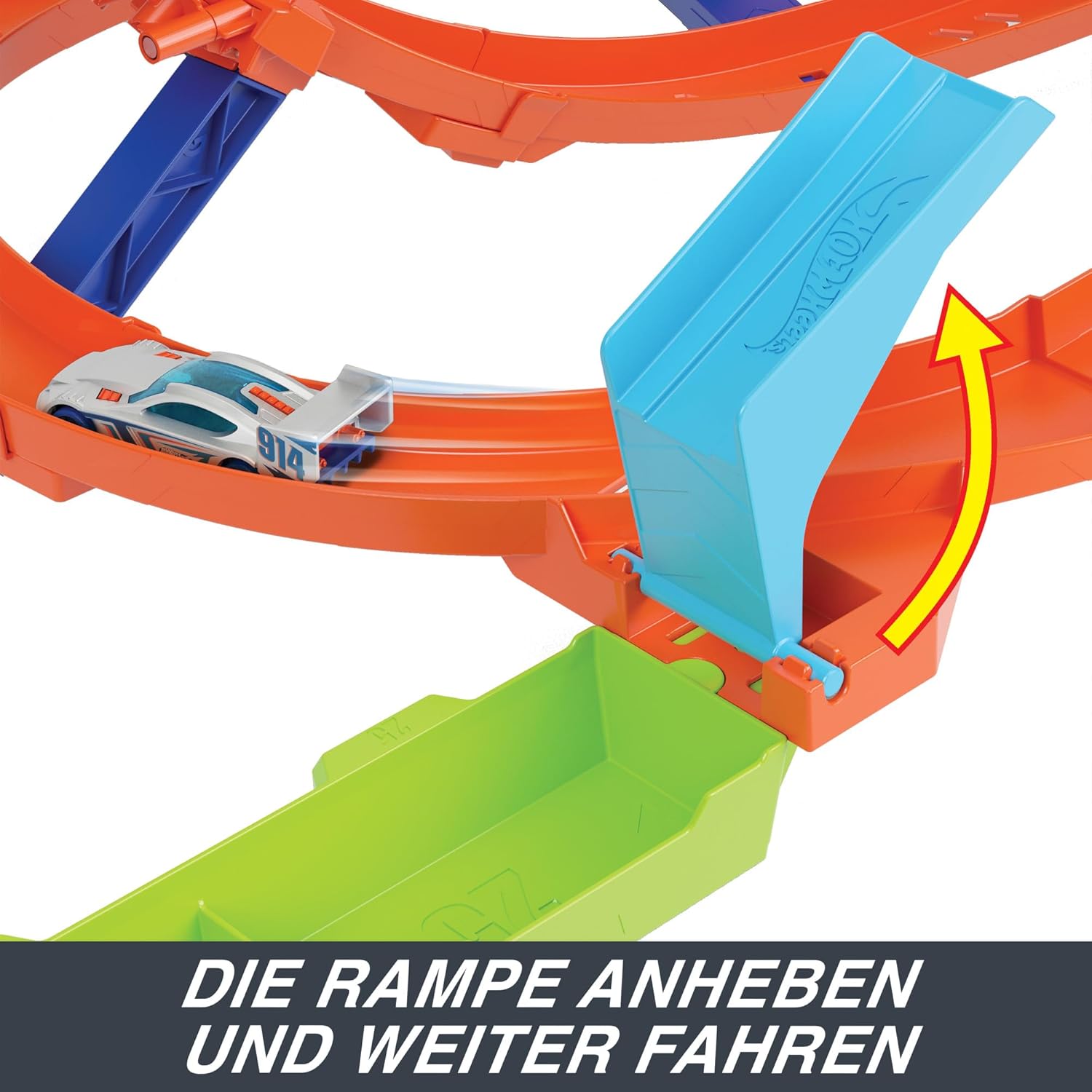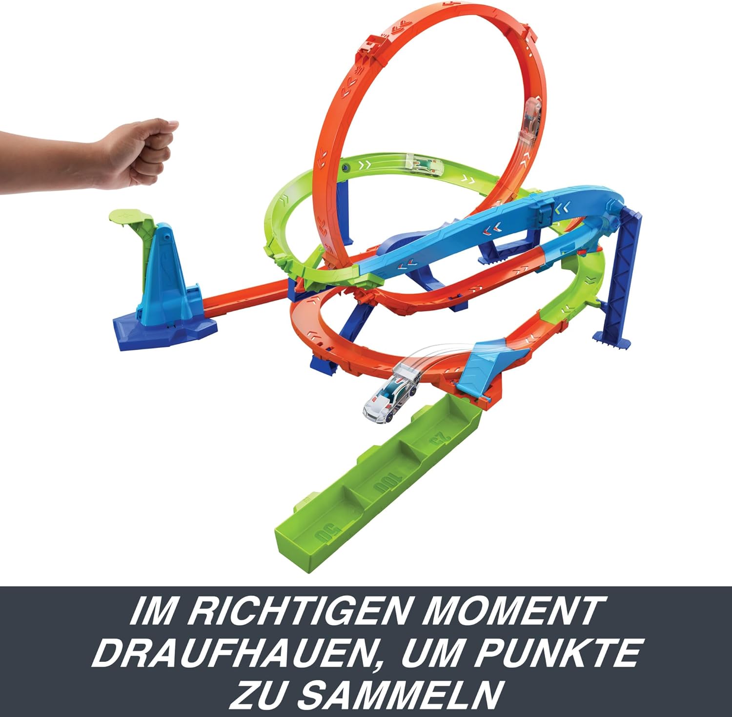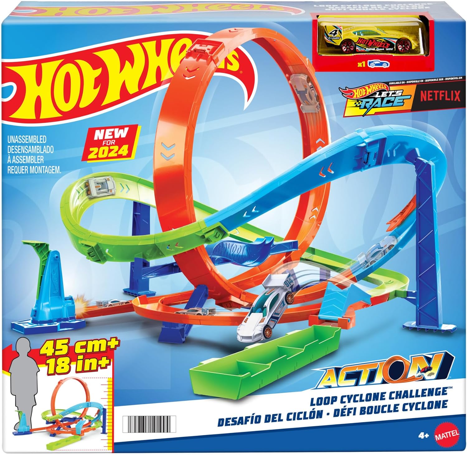 Il set di piste d'azione Hot Wheels Looping Cyclone Challenge offre 2 opzioni di gioco per fantastiche corse e acrobazie! Lancia il veicolo in scala 1:64 incluso attraverso gli anelli del boomerang e torna al punto di partenza per ricominciare e correre sempre più lontano. Capovolgi la rampa e lancia con la giusta quantità di forza per ottenere il maggior numero di punti! Il set è facile da riporre: basta girare le parti del binario e piegarle. Ha anche una maniglia per il trasporto. Il regalo perfetto per i bambini dai 4 anni in su.